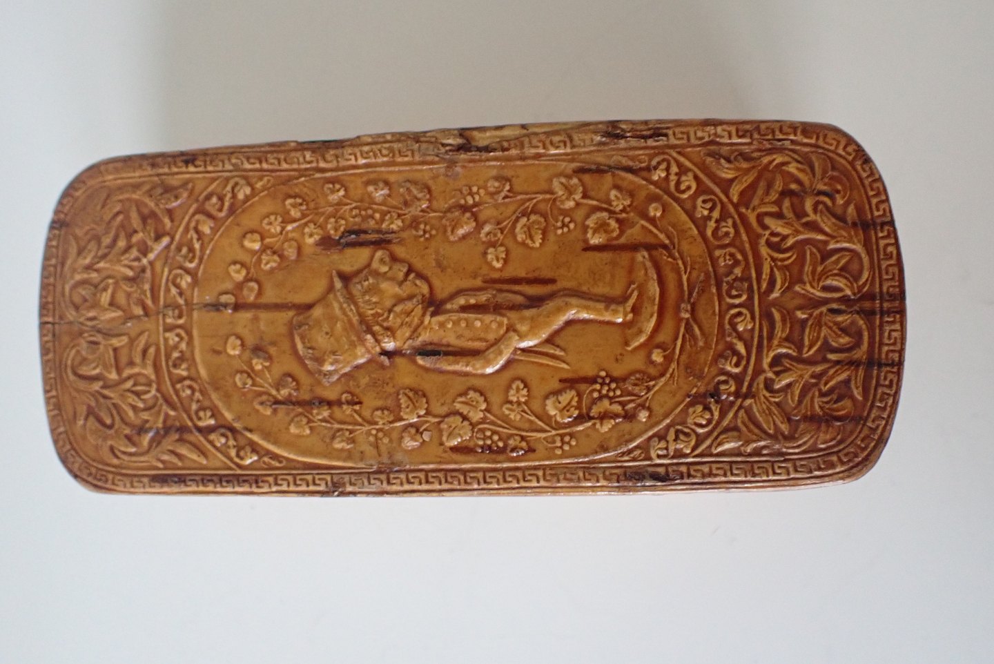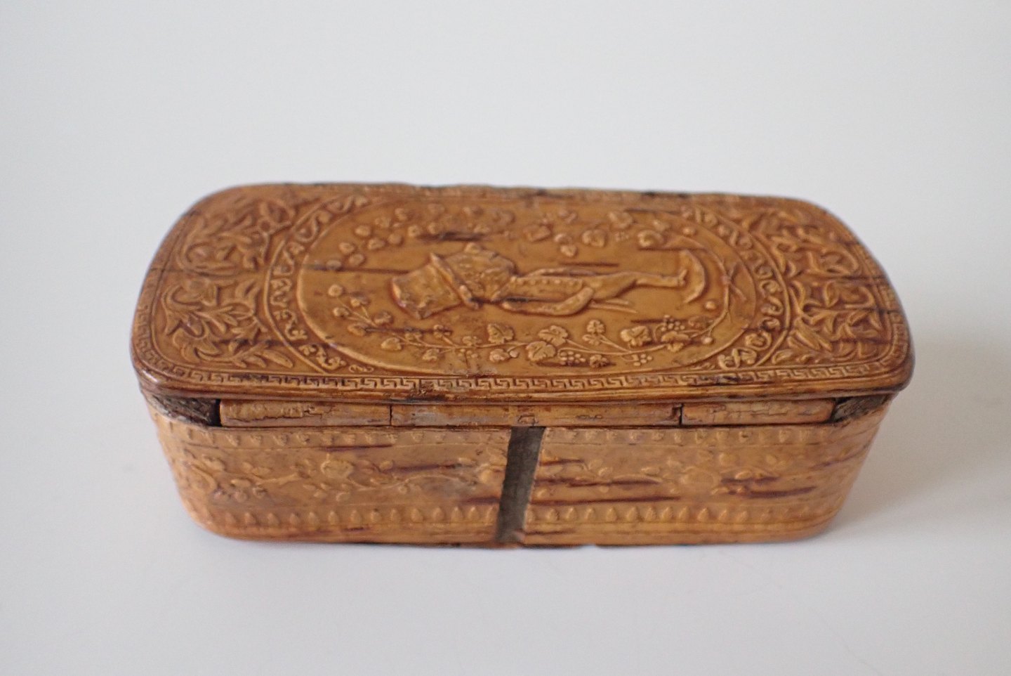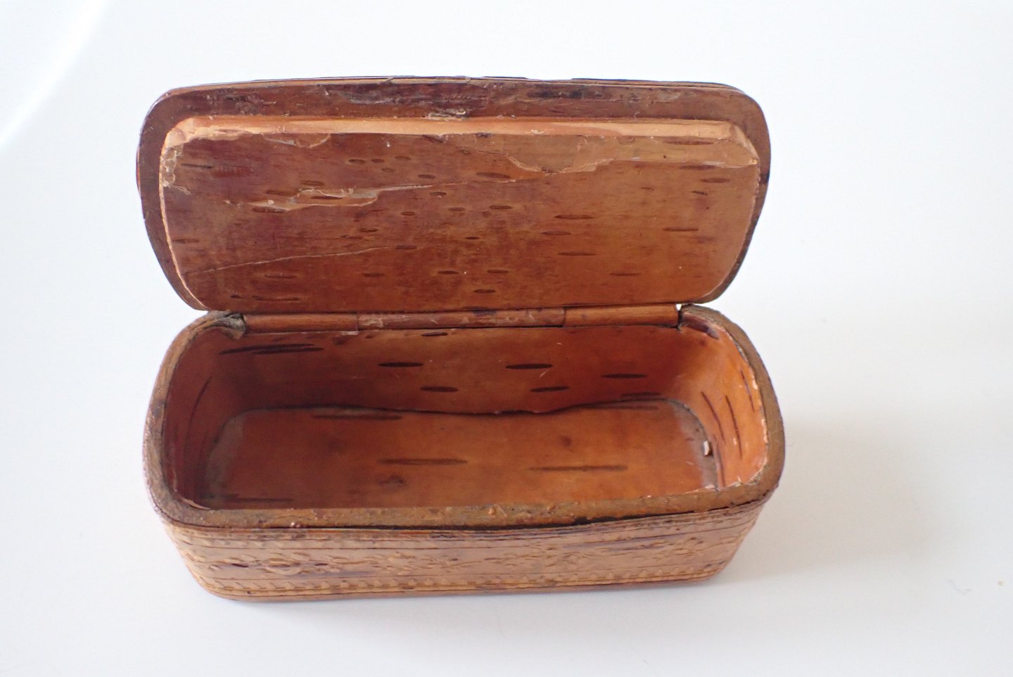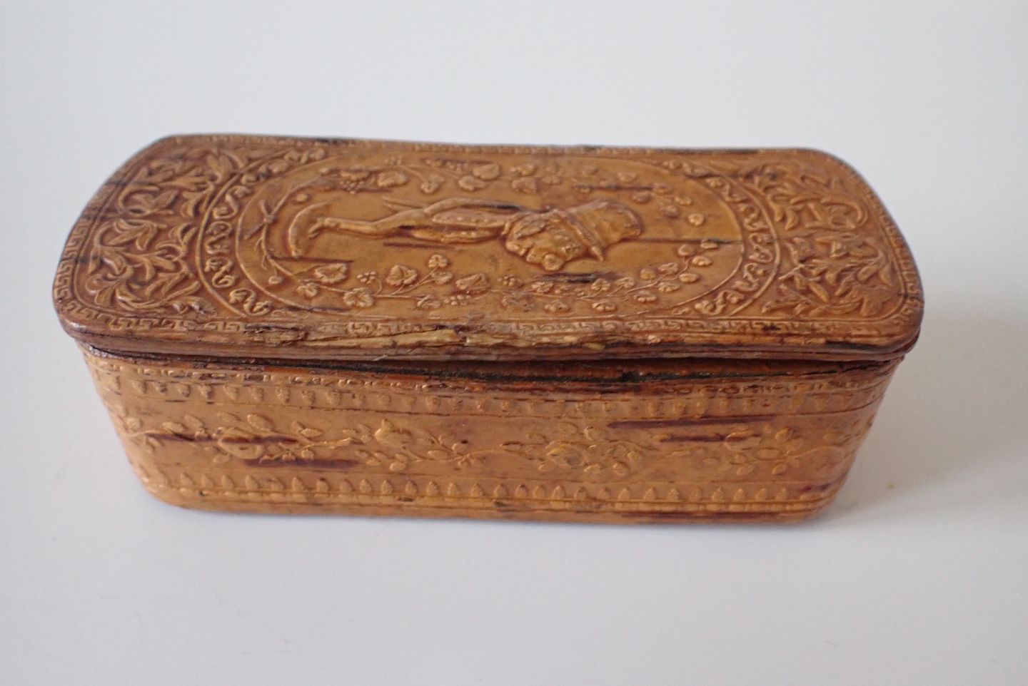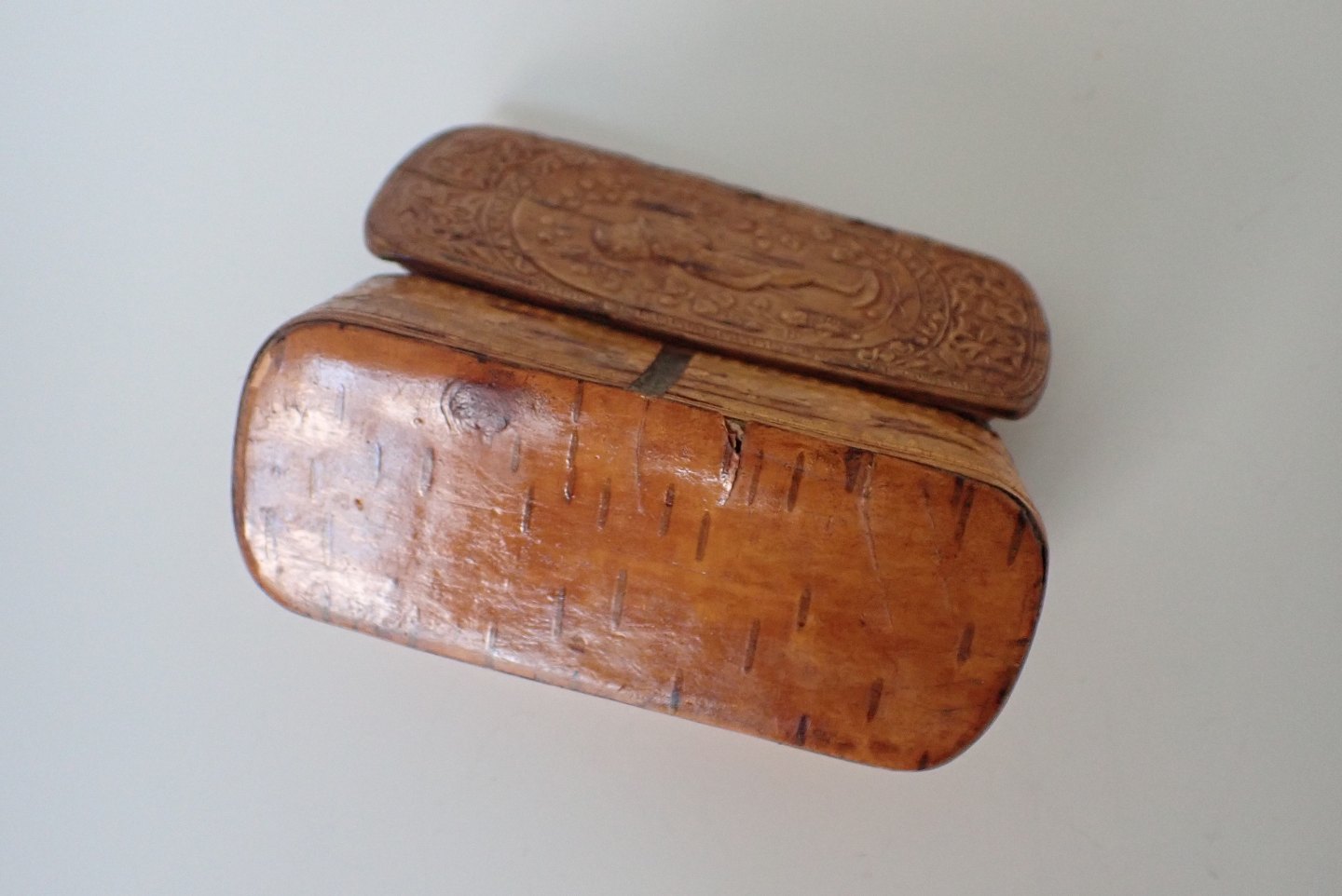 Tobaksæske i træ belagt med birkebark med en præget karrikatur af en lille mand med høj hat omkrandset sf blomsterdekorationer iørigt på låg og sider. Formentlig norsk eller svensk. 1800-tallet. Længde: 10 cm., højde: 4,3 cm. og bredde: 4 cm. Tidstypisk slid.