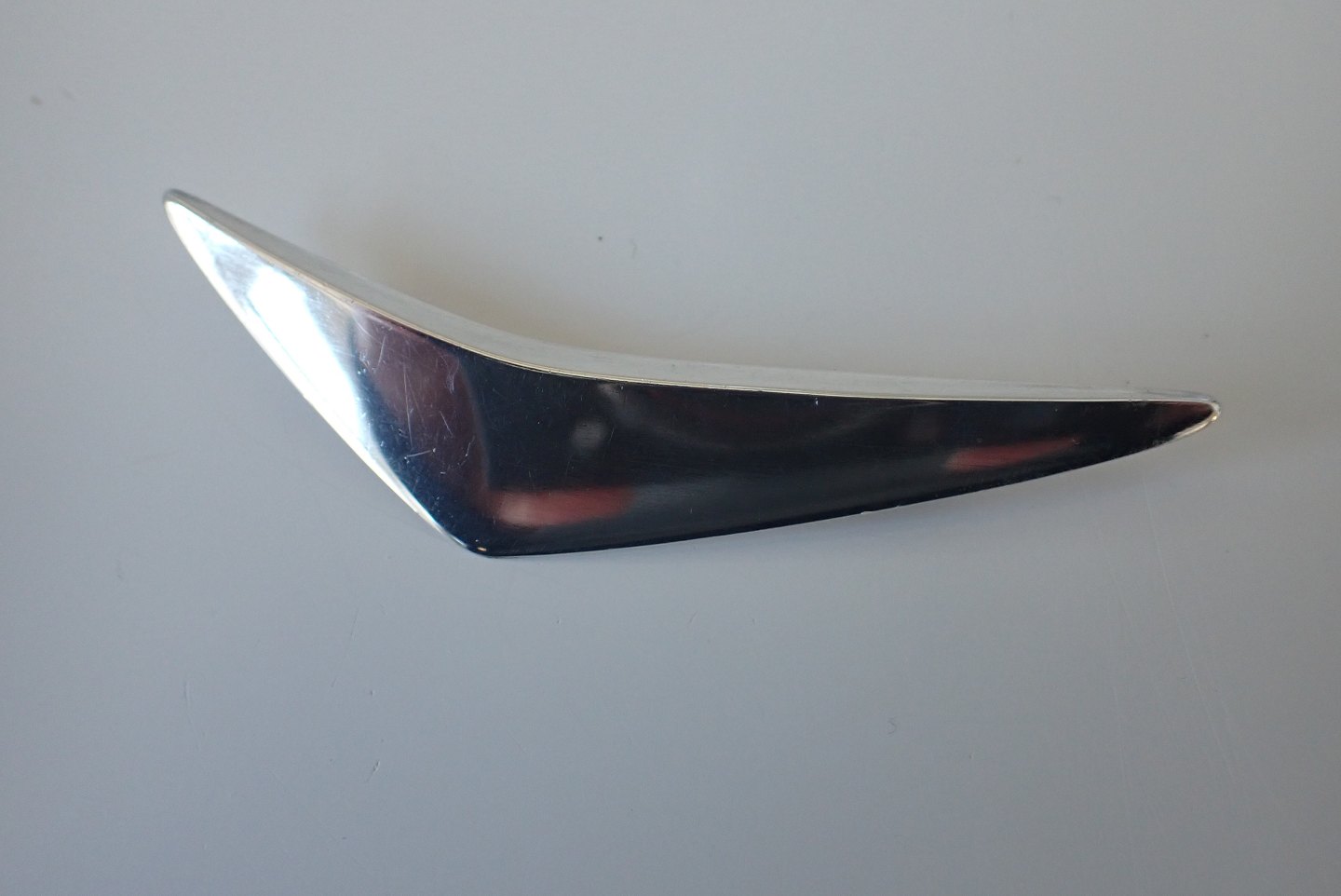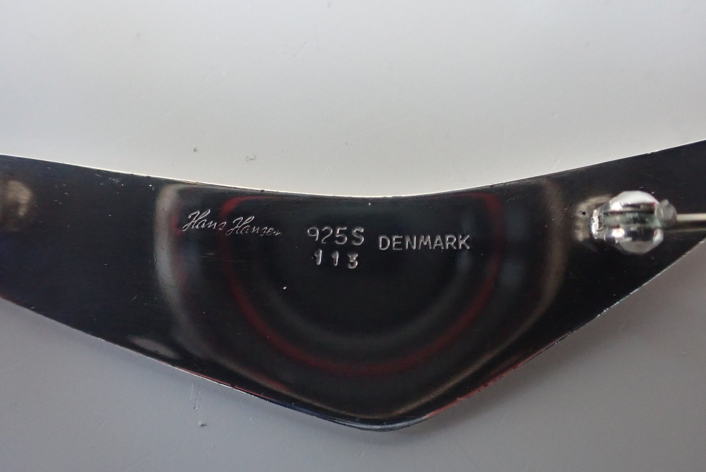 Hans Hansen (1884 - 1982) "Peak" broche i sterling sølv designet af Bent Gabrielsen (1928 2014) - dessin: 113. Længde: 7,5 cm. Bredde: 1.1 cm. Vægt: 12,3 gram. Tidligt Hans Hansen stempel: HiH.Ca. 1930. Pris: 1100 kr.