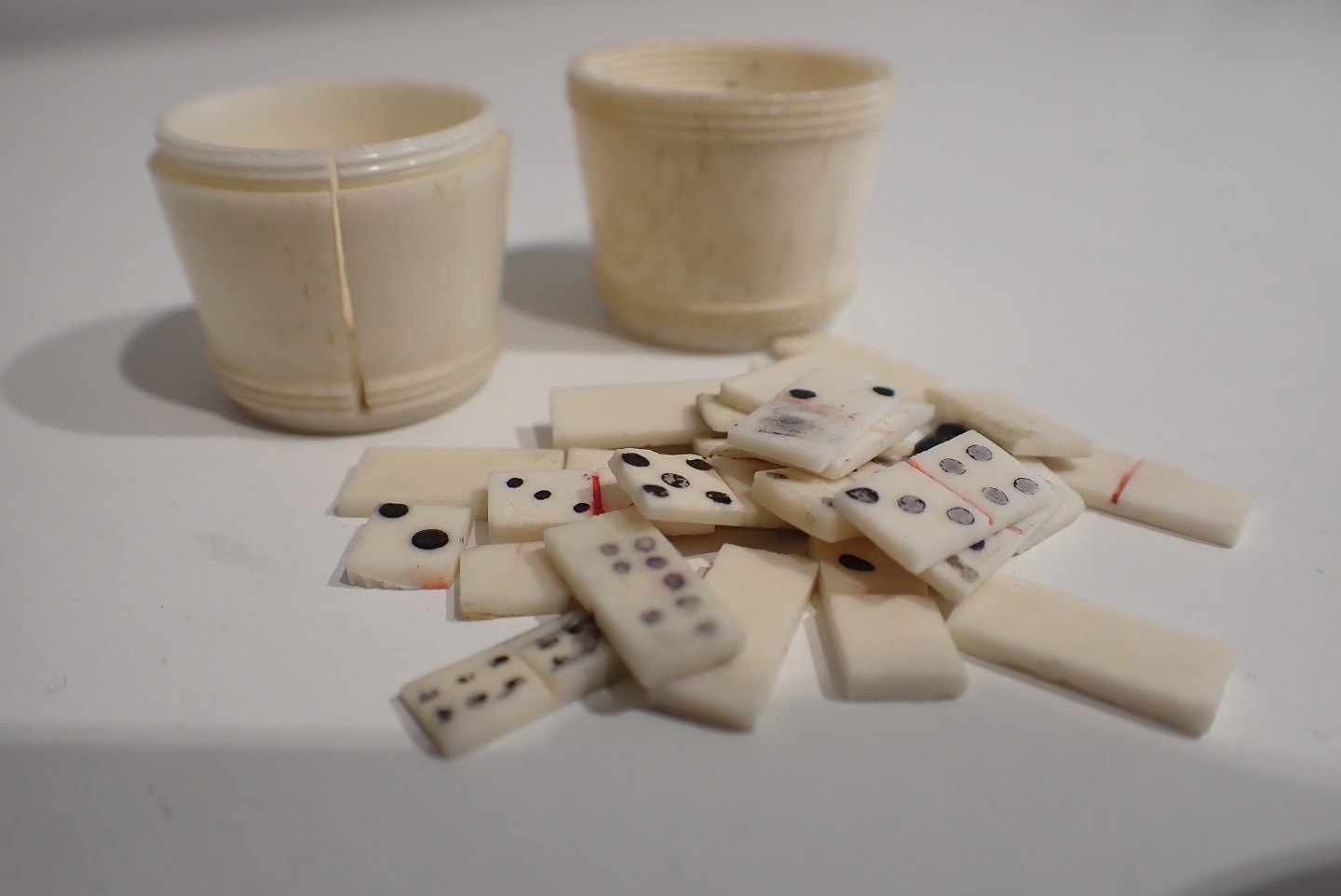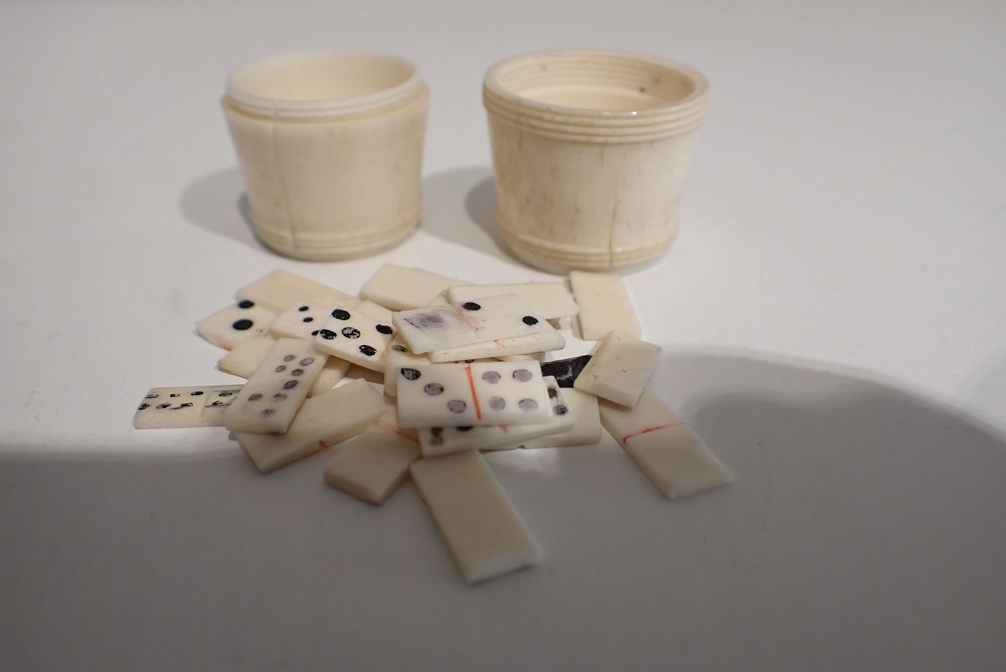 Lille tønde af ben med 25 miniature Domino brikker også i ben. Formentlig fra østen sidst i 1800-tallet. Højde 3,9 cm. Brikkerne er primitivt lavet og der er en revne i den ene tøndedel.