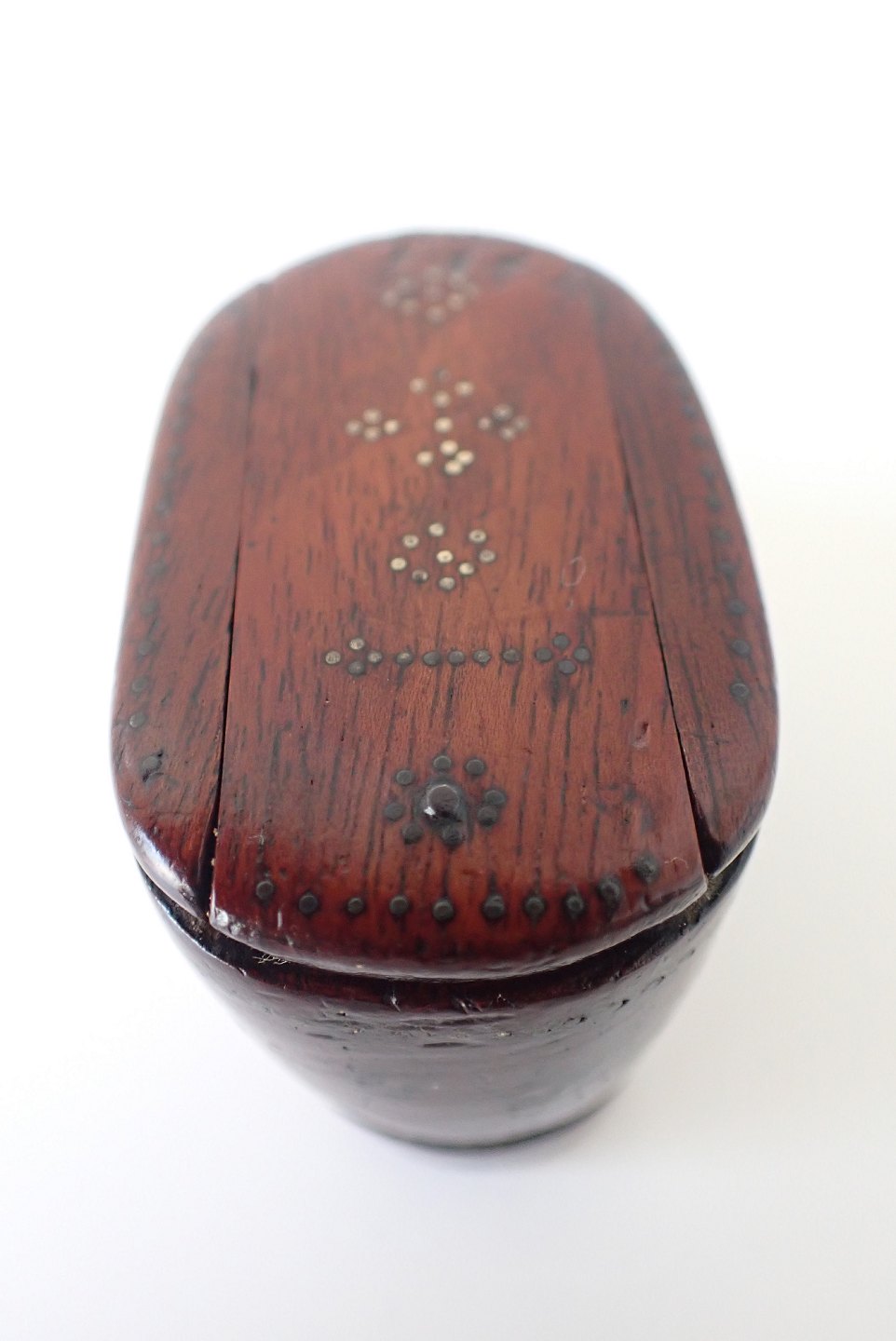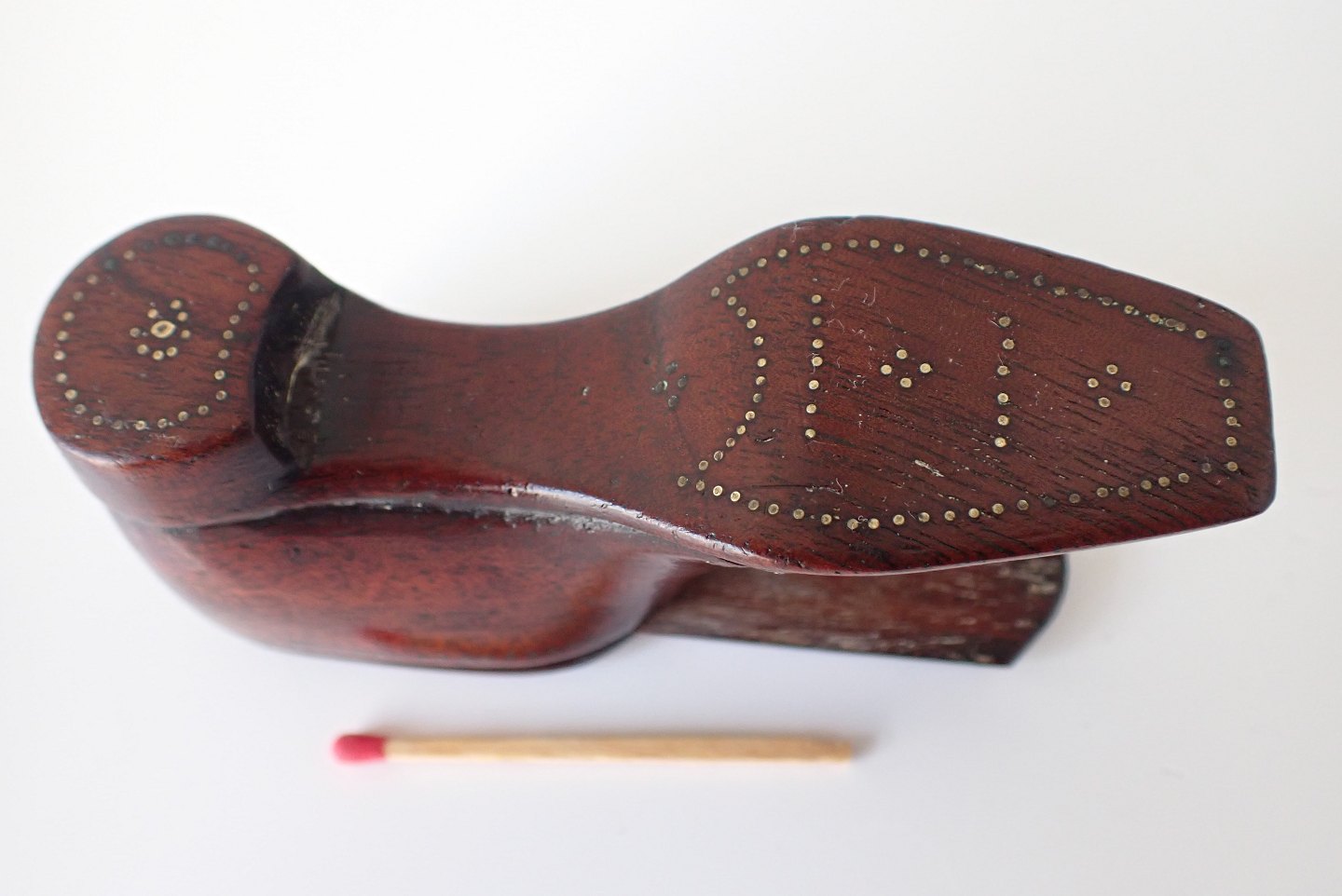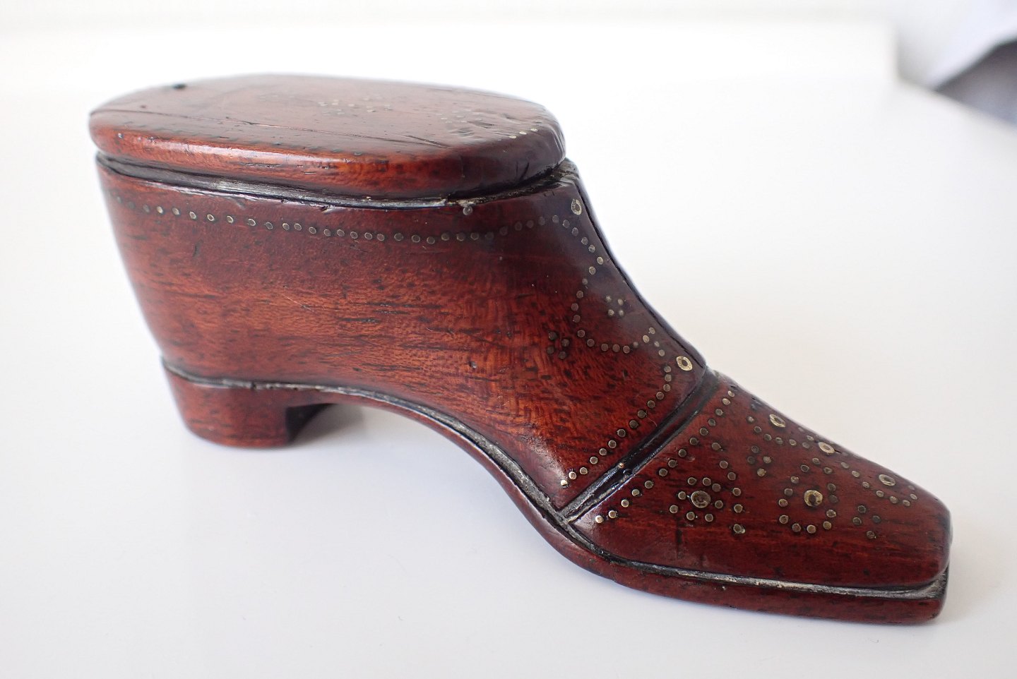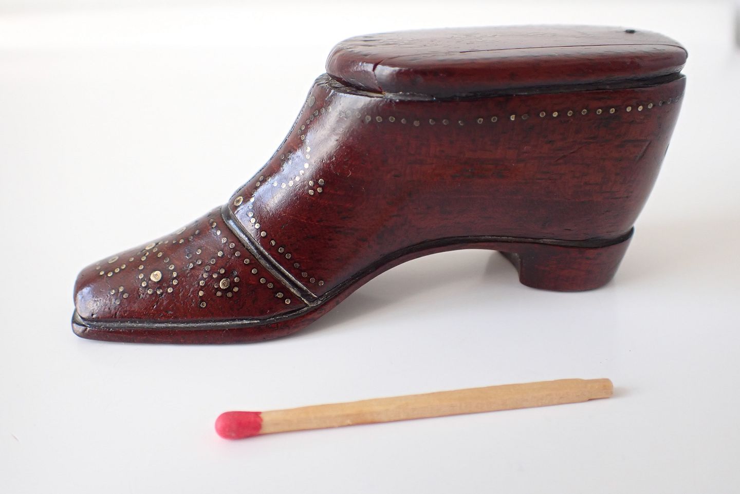 Engelsk snusæske formet som støvle. Udført i rosentræ med skydelåg og dekoration af små messingstifter forskellige mønstre og borter. 1800-tallett. Længde: 9,5 cm. Højde: 3,8 cm. Bredde: 3 cm. I meget fin stand.