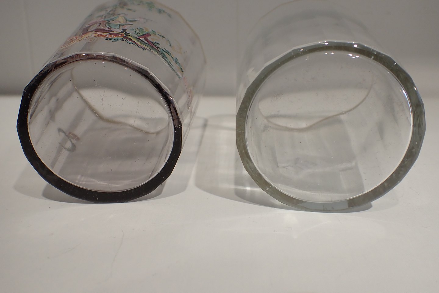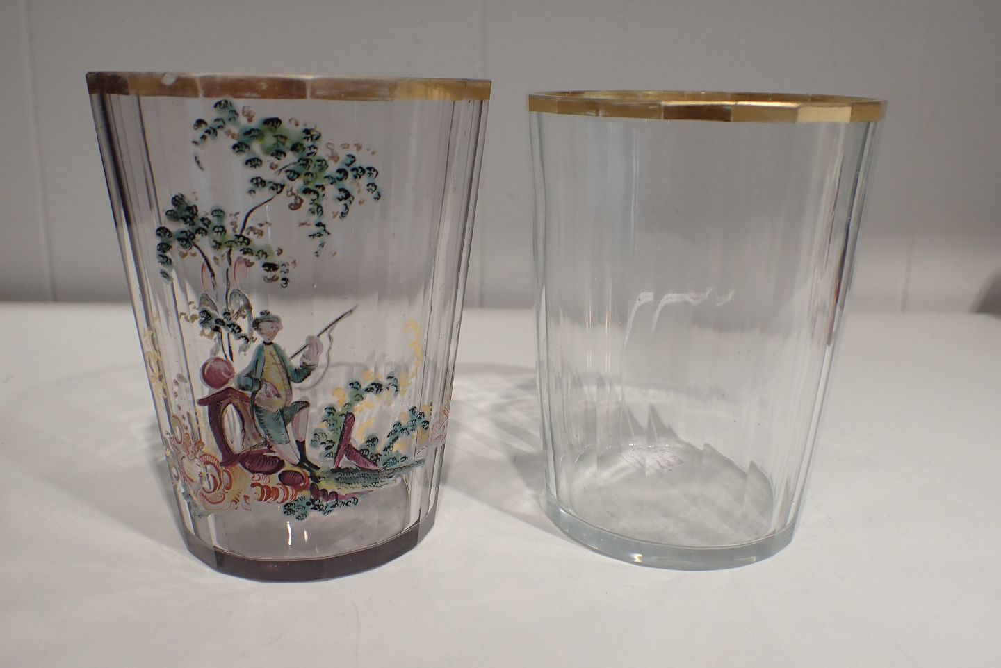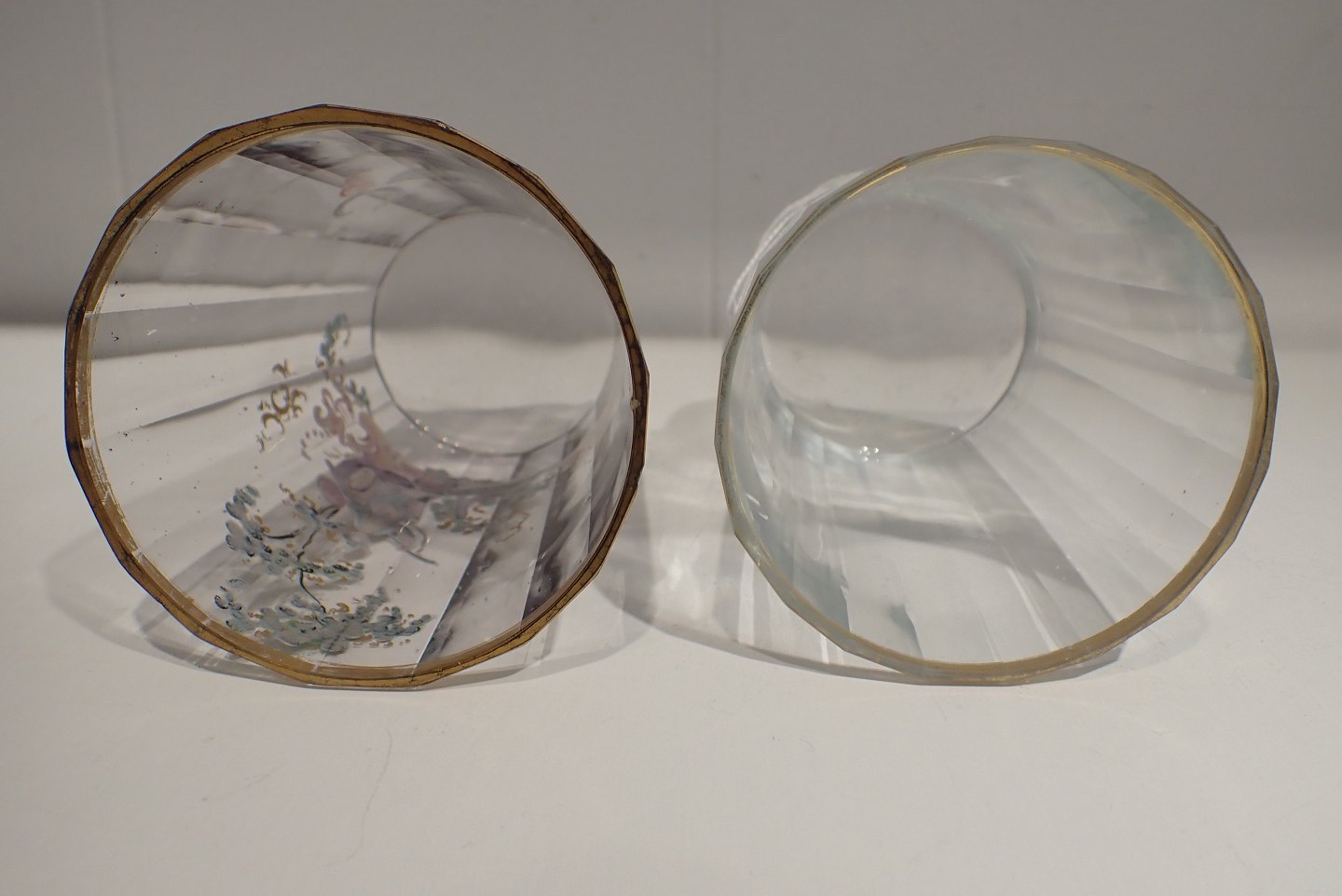 2 tysk helfacetteret vand/ølglas - et med fin emaljedekoration af en piberygende herre på en bænk, under et træ og et uden emaljedekoration. Plansleben bund og guldkant. 1800-tallet. Højde: 10 cm - diameter foroven: 7 - 8 cm. I pæn stand i forhold til alder.