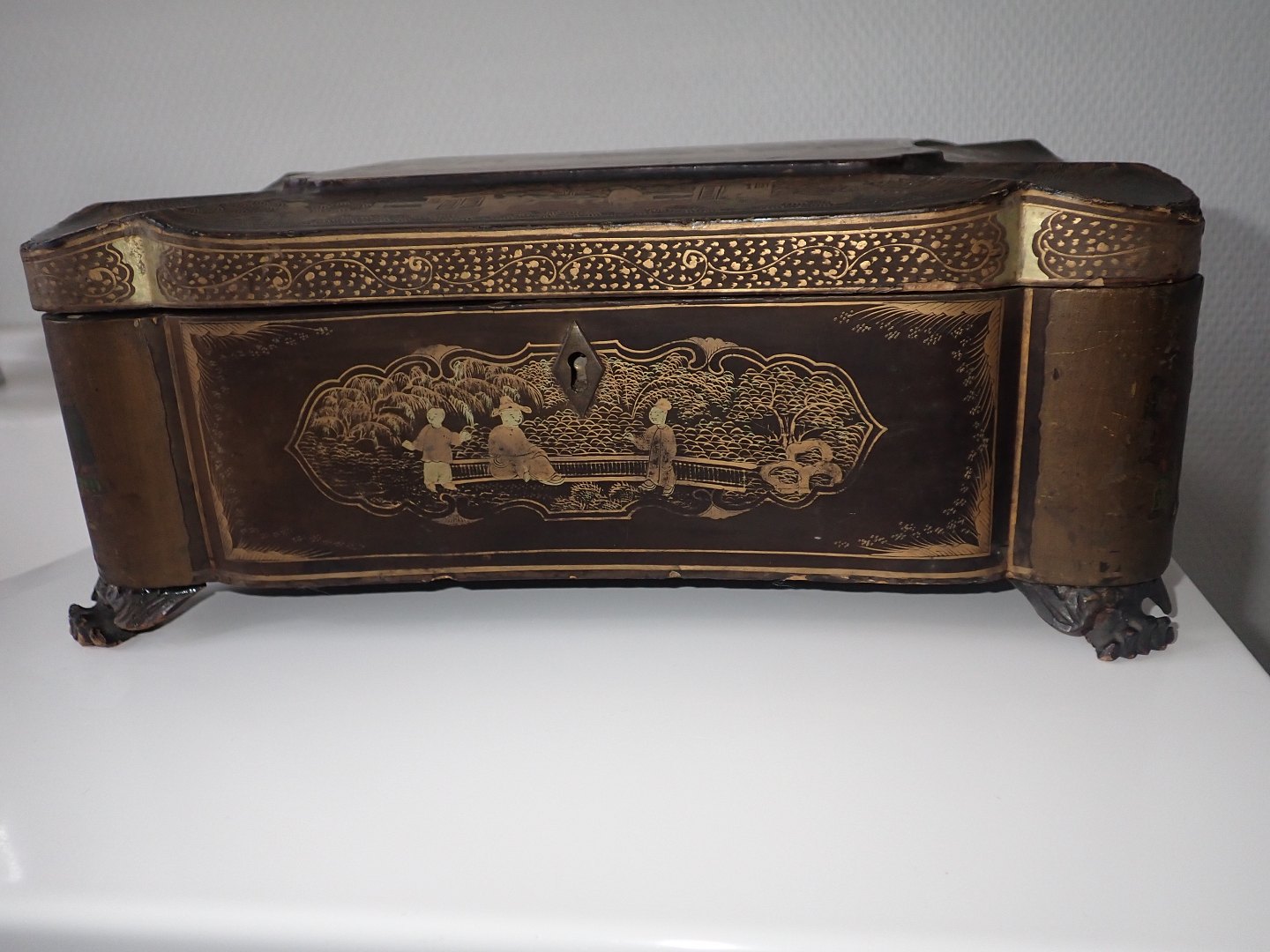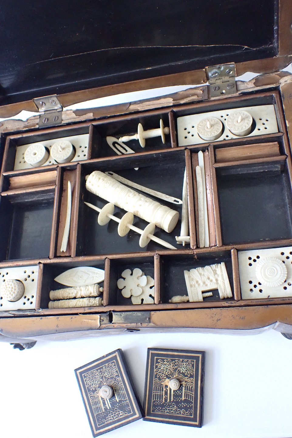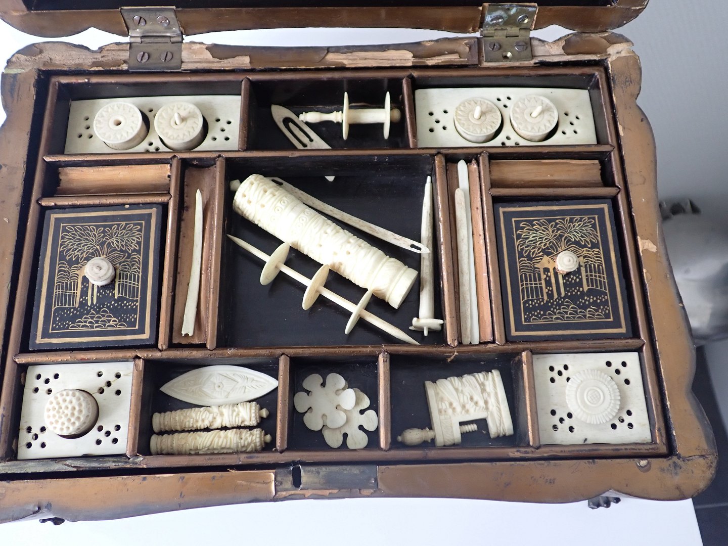 Kinesisk - Canton syskrin i lakeret træ med chinoise dekoration og løvefødder fra slut 1800-tallet. Indeholder bakke med flere rum, to med dekorerede låg. Derudover indeholder skrinet omkring 18 små syting i udskåret elfenben og ben (f.eks. Nålehylstre, garntrisser, skruetvinge). Sælges samlet. Skrinets højde: 12 cm, længde: 29 cm og bredde: 21 cm. Selve skrinet er solbleget udvendigt og en del slidt og med afslag både indvendig og udvendig.