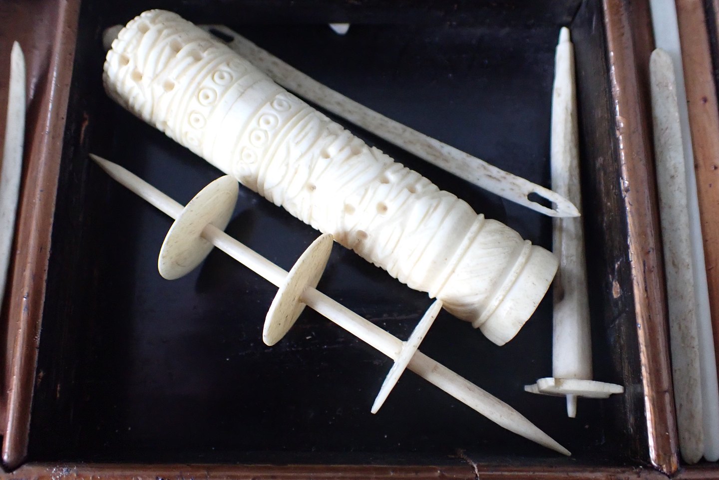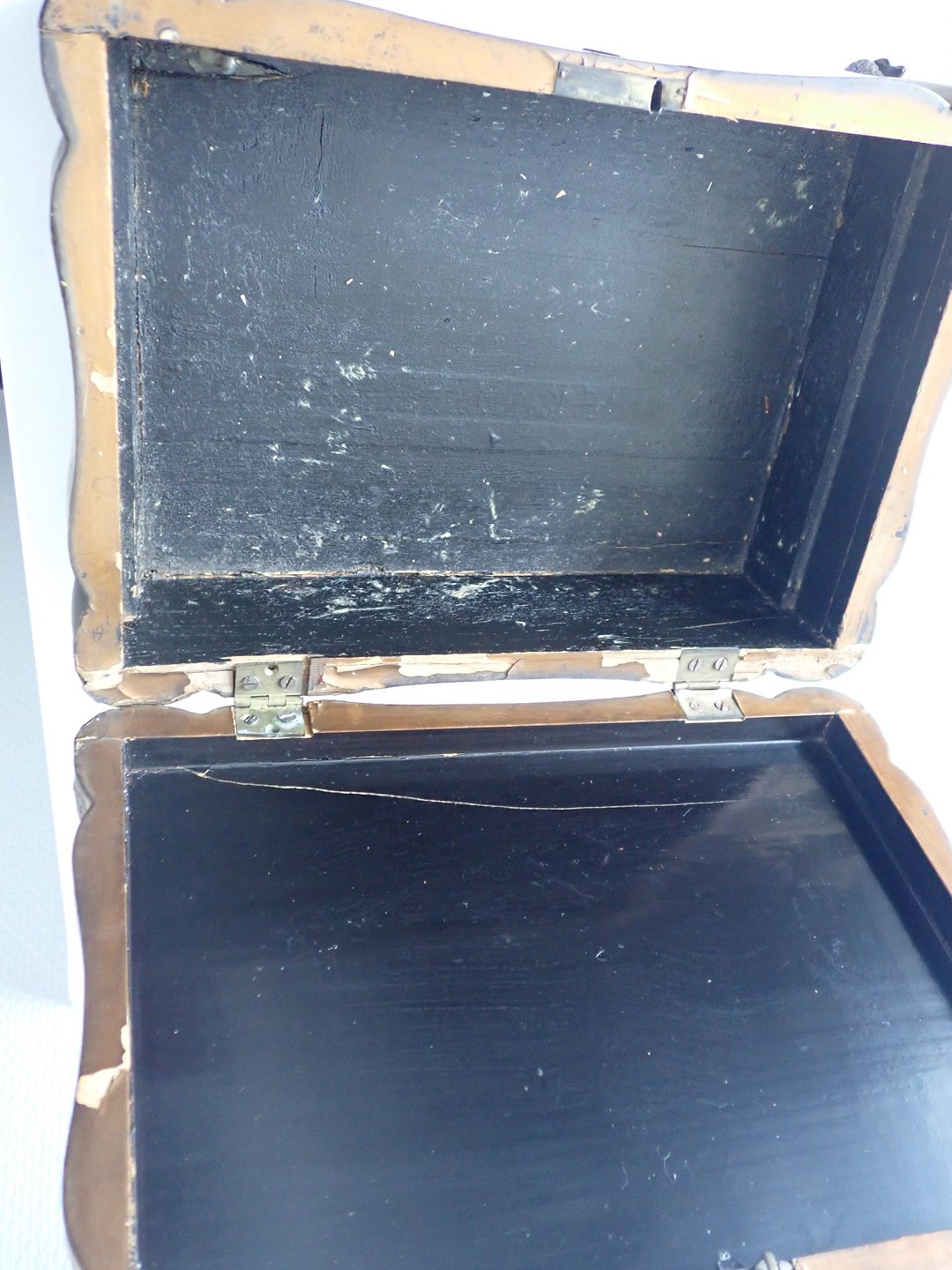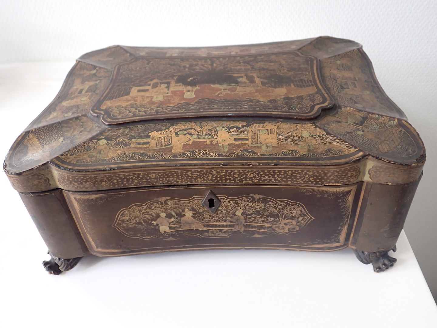 Kinesisk - Canton syskrin i lakeret træ med chinoise dekoration og løvefødder fra slut 1800-tallet. Indeholder bakke med flere rum, to med dekorerede låg. Derudover indeholder skrinet omkring 18 små syting i udskåret elfenben og ben (f.eks. Nålehylstre, garntrisser, skruetvinge). Sælges samlet. Skrinets højde: 12 cm, længde: 29 cm og bredde: 21 cm. Selve skrinet er solbleget udvendigt og en del slidt og med afslag både indvendig og udvendig.