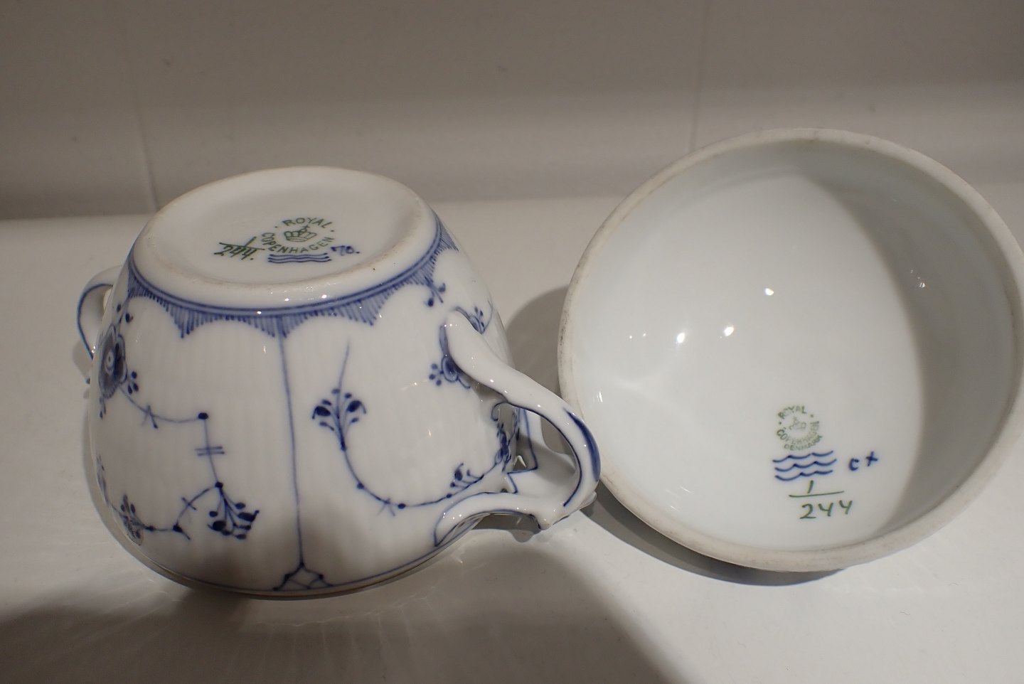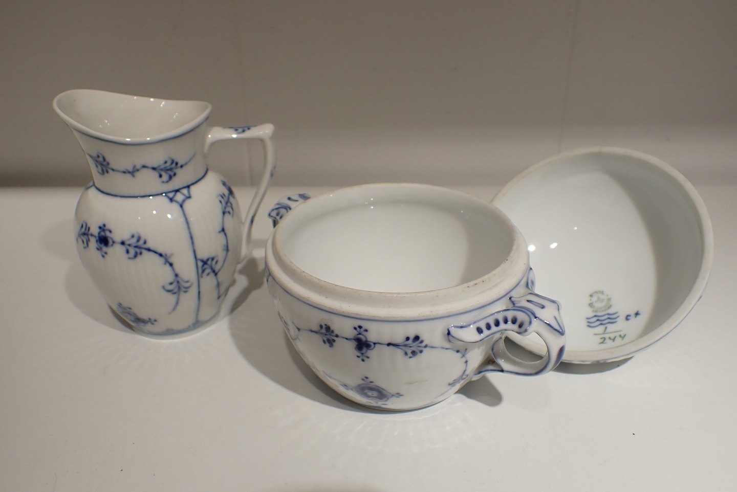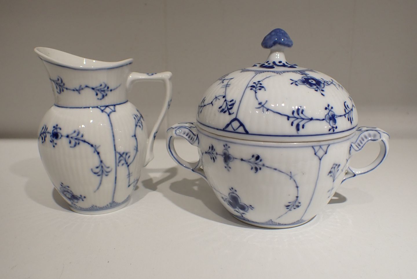 Kgl. Musselmalet riflet flødekande og sukkerskål med låg. Design 60 og 244.Moddelør j. jacobsen 1896 . 1. sort. efter 1923.