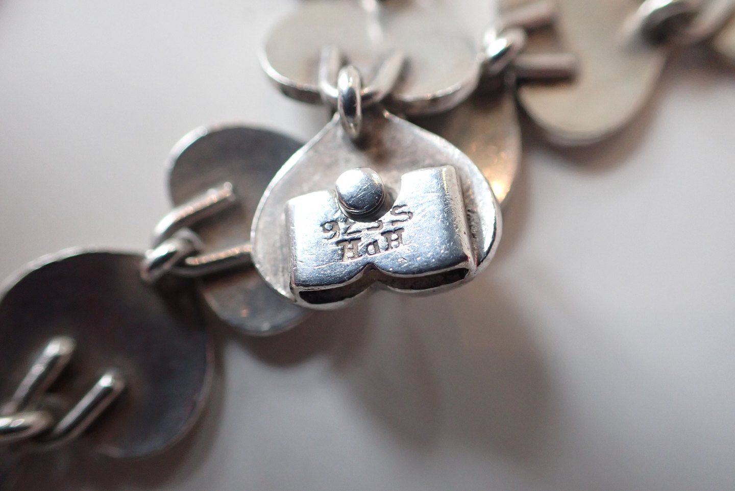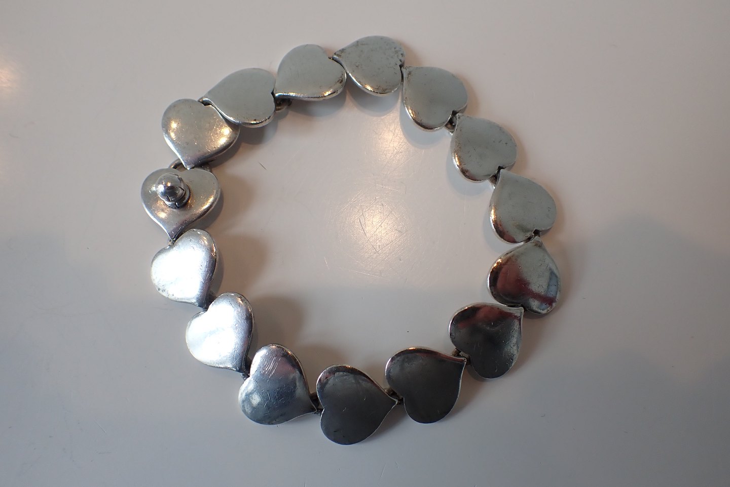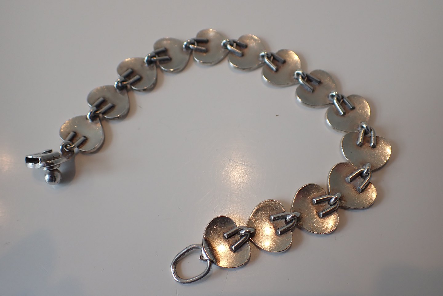 Hans Hansen sølvsmedie(1884 - 1982), hjertearmbånd designet af Karl Gustav Hansen (1914 - 2002) i sterling sølv: Vægt: 27,2 gram. Stemplet monogram fra perioden 1937 - 1947: HaH. 925s. Skruelukke. Længde: 18 cm. Hjertebredde: 0,9 cm. I pæn brugt stand.
