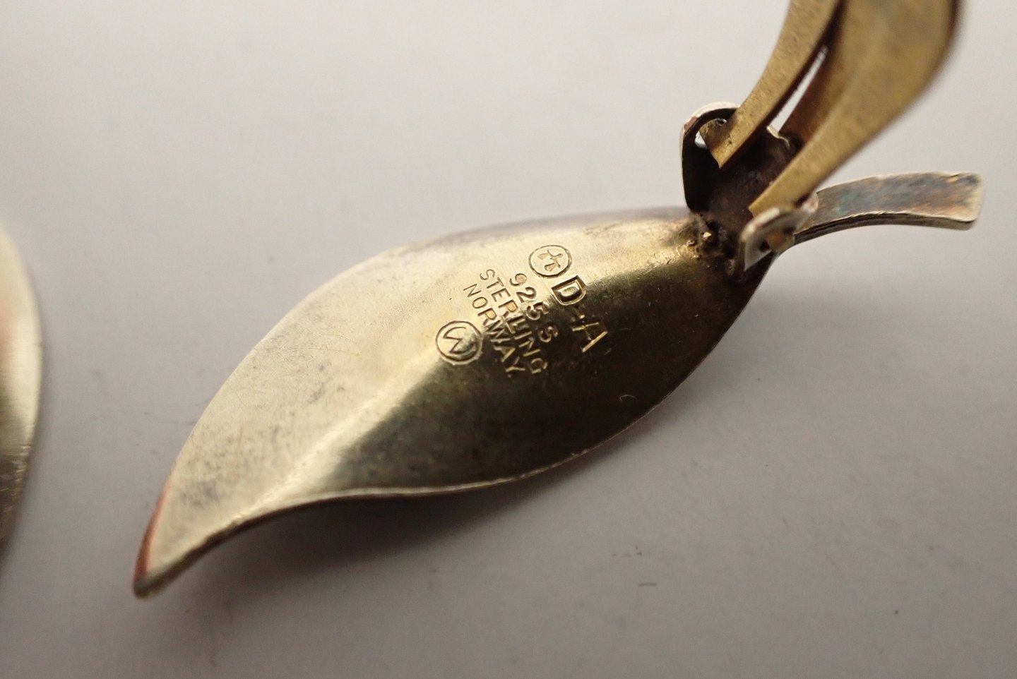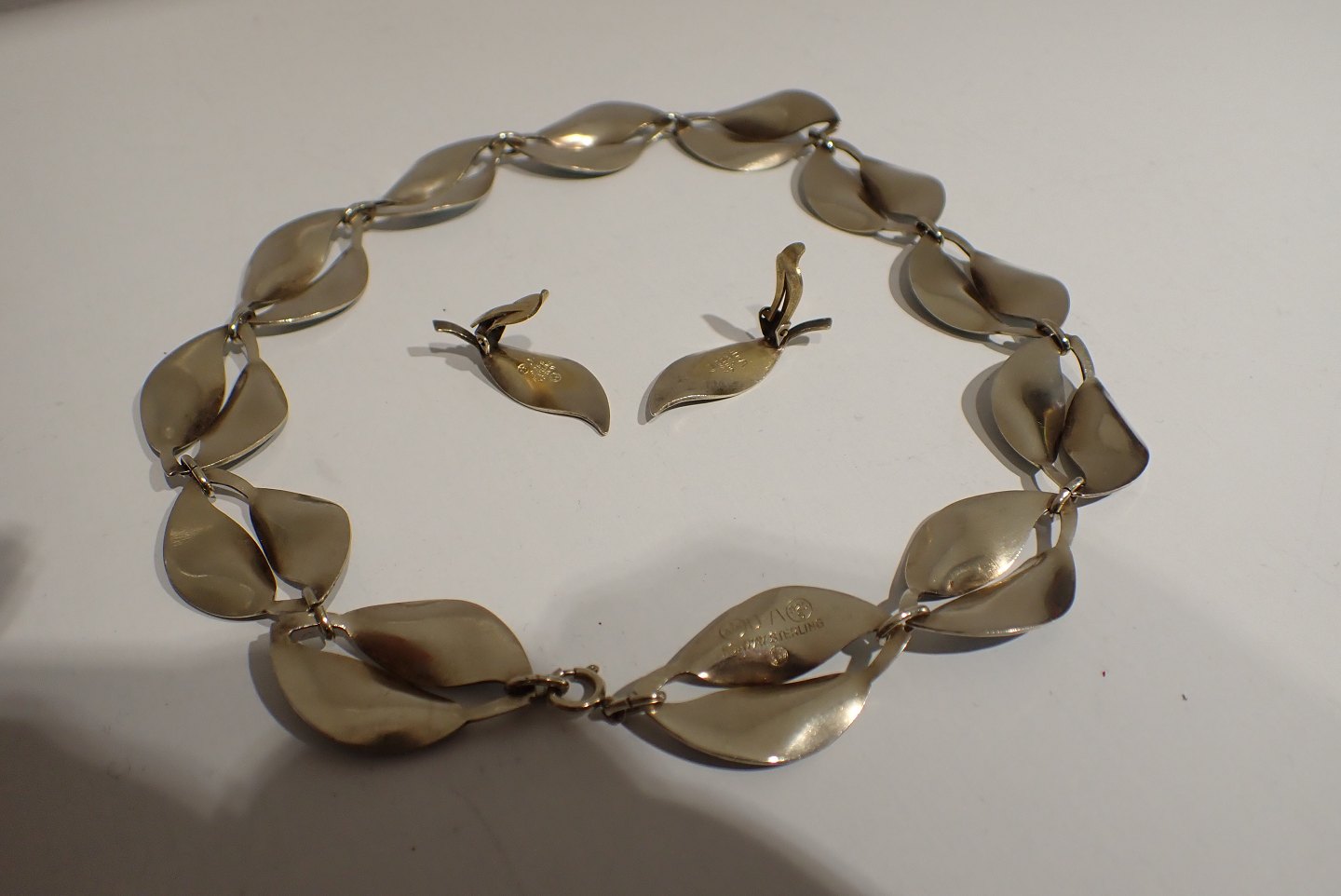 David Andersen (1880 - 1980), forgyldt, sterling sølv halskæde og øreklips med grå emalje på guilliocheret arbejde. Designet af Willy Winnanaess i 1950-erne. Stempler: Vægt i cirkel, D-A, 925s, Norway Sterling, W i cirkel. Kæden er en dobbelt række af blade. Længde på halskæde: 39 cm. Samlet vægt: 48,6 gram. I fin stand uden emaljebeskadigelser. Sælges kun samlet.
