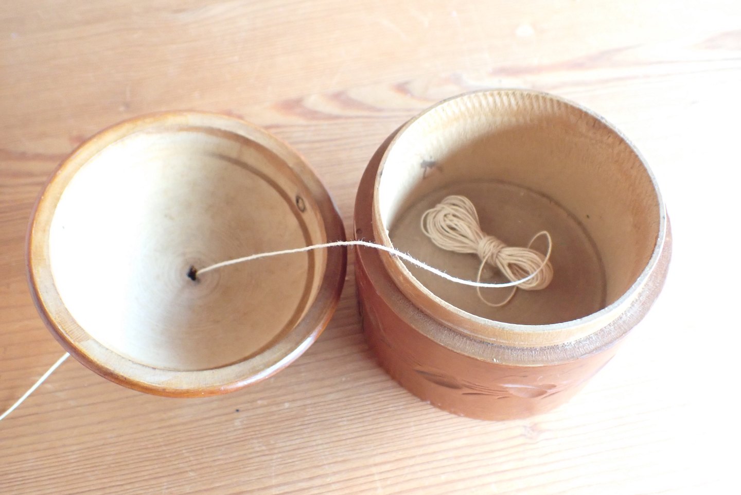 Rund og kuppelformet trææske til tråd og snor. Hul i låget med indlæg af sort metal, hvor tråden kan komme ud. Lakeret bøgetræ med udskæringer i form af bladranker. Højde: 8,7 cm, diameter: 8,3 cm. . I pæn stand med ganske lidt lakafskalning.