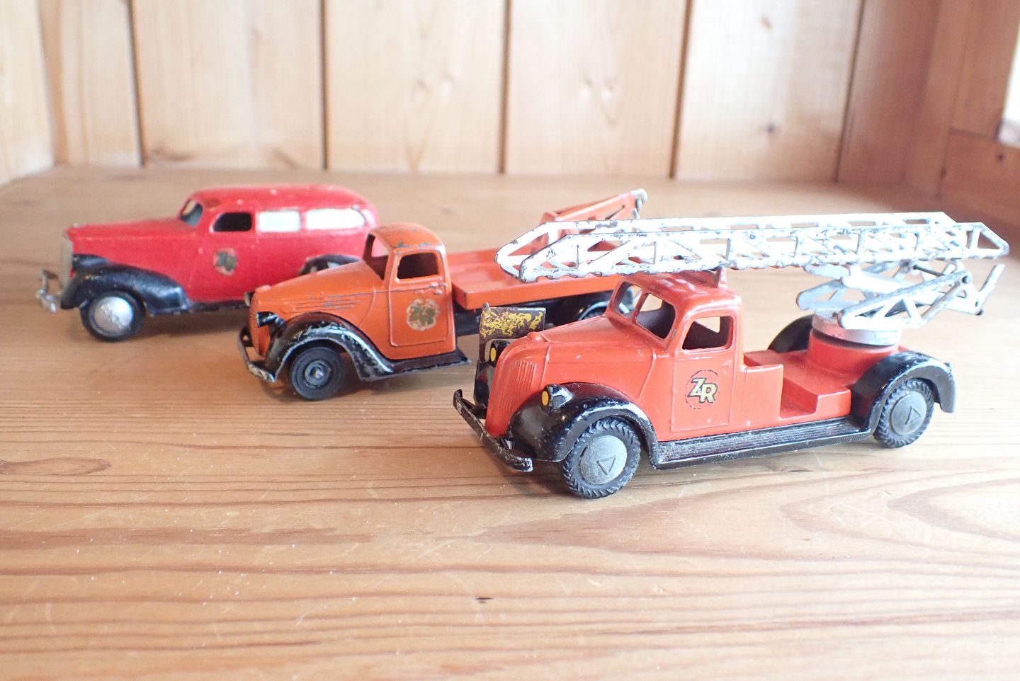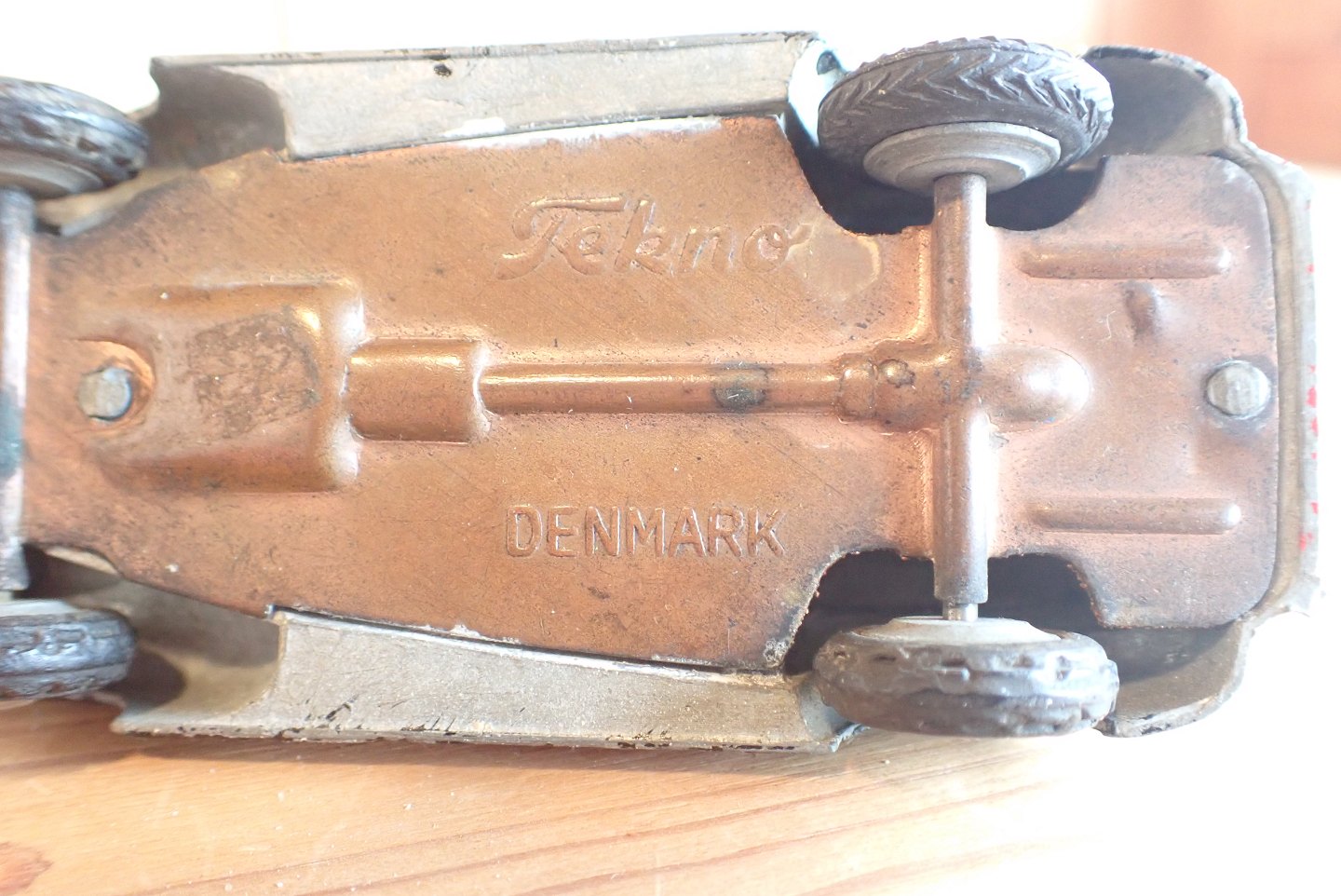 3 Tekno biler med Zonen Redningskorps (ZR) (Dansk Legetøjs Industri 1928 - 2009) Stigebil pris: 500 kr., kran med et udskiftet for lille dæk og en manglende hjulkapsel Pris: 350 kr. Ambulance - måske overmalet pris: 350 kr. Længder 13 henholdsvis 13 cm.,11,5 cm. og 10,3 cm. mærket med Zonen Redningskorps og flag. Ca. 1950. alle i noget slidt stand
