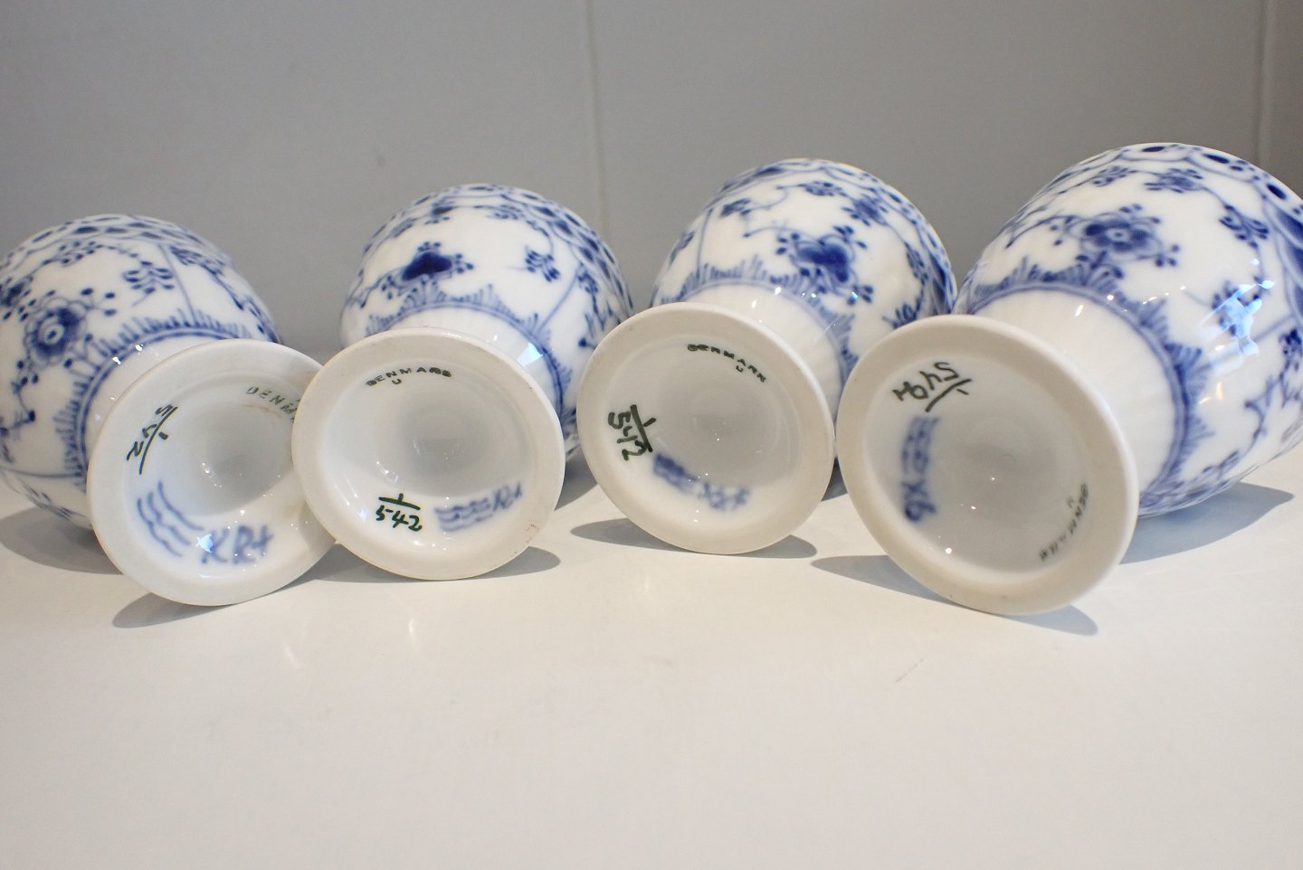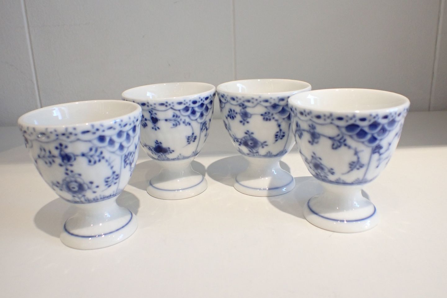 4 stk. Kgl. Musselmalet halvblonde æggebægre. Efter 1923. Dessin nr. 542. 1. sortering. Højde: 6,1 cm. I fin stand. Sælges enkeltvis 400 kr. Pr. stk.