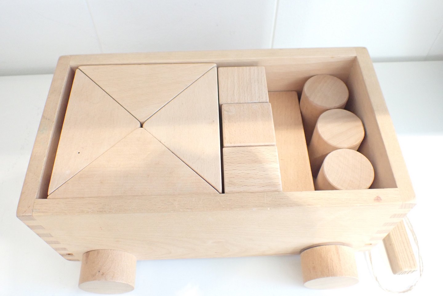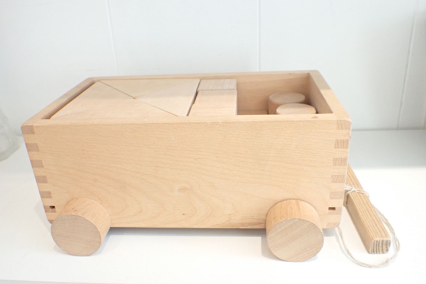 Kay Bojesen (1886 - 1958) ældre trækvogn med klodser i bøgetræ. Stemplet Kay Bojesen Denmark Copyright. Formgivet i 1950erne. Mål: 27 x 14,8 x 12 cm. I fin stand med lette brugsspor.