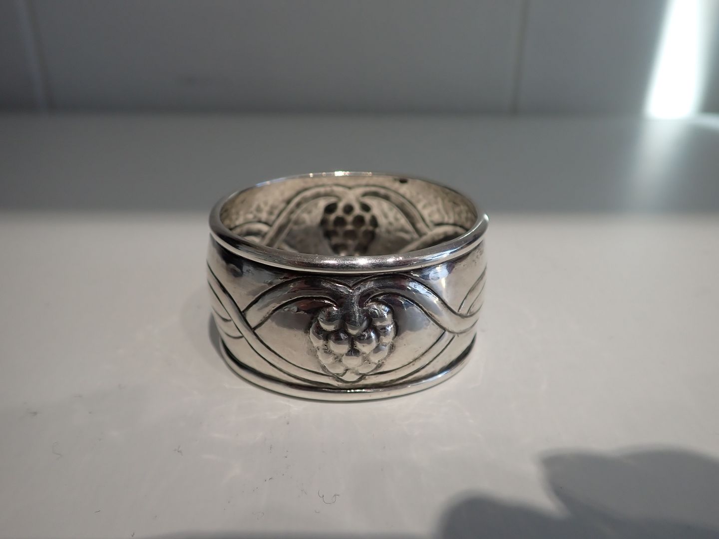 Georg Jensen hammerslået skønvirke servietring med vindrueklaser. 830 s tidligt Gi stempel fra perioden 1909 - 1914. Vægt: 20,3 gram. Bredde: 2,7 cm. Indre diametre 5 og 4,6 cm. I fin stand uden gravering.