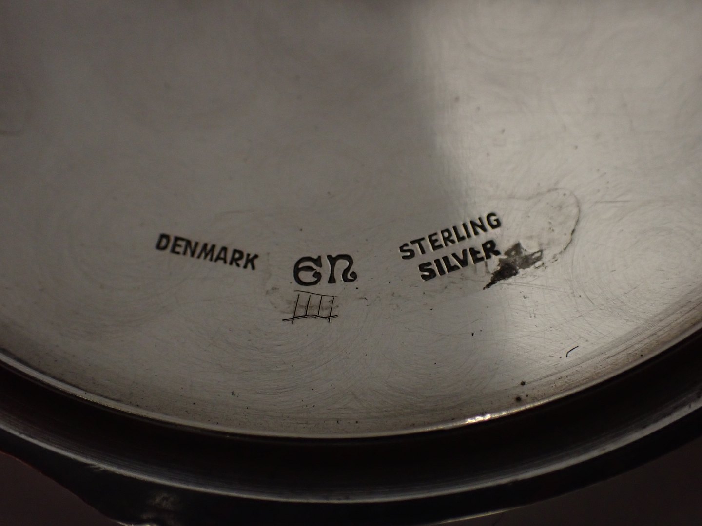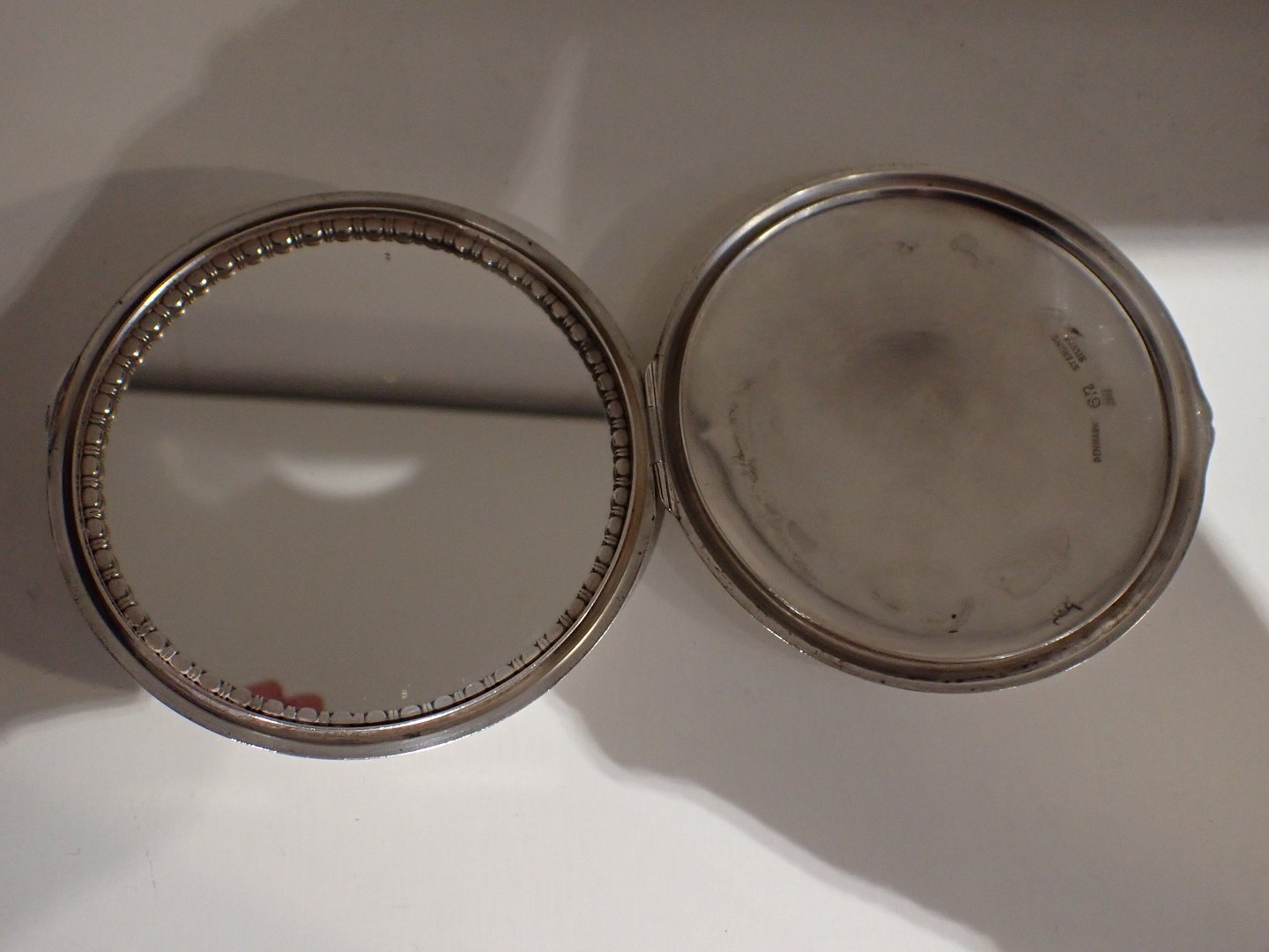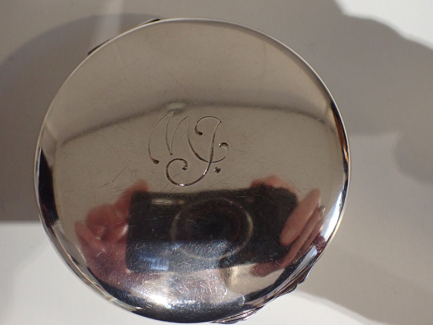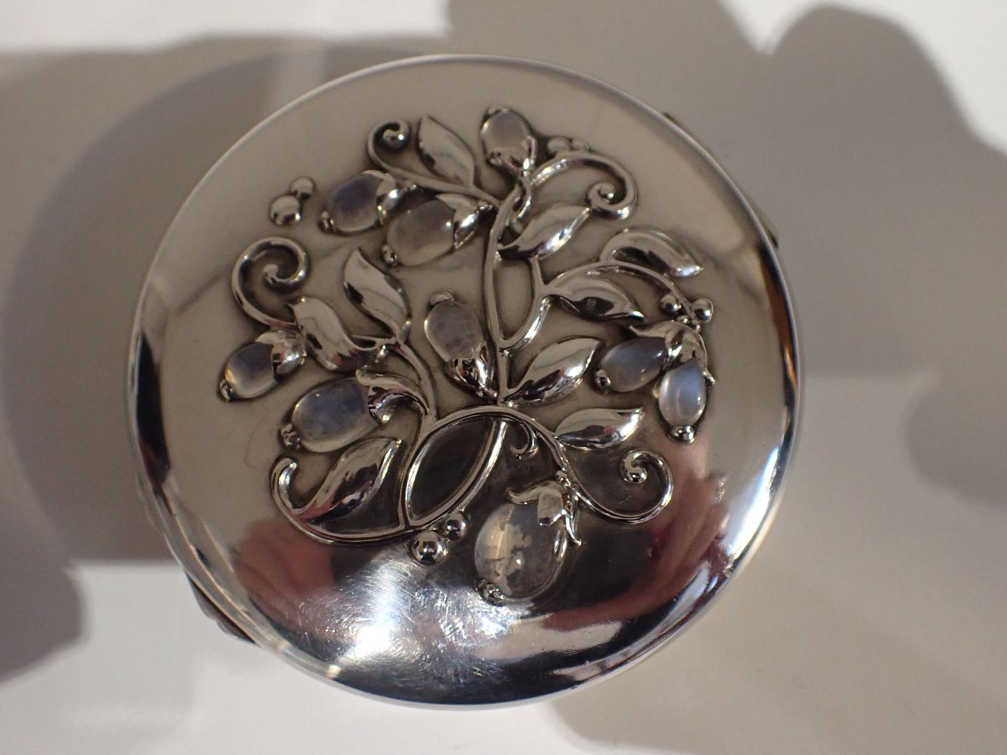 Evald Nielsen - pudderdåse med spejl i sterling sølv med stiliseret blomsterdekoration på låg med 8 cabochonslebne månesten. Stemplet EN Denmark Sterling silver. Slynget monogram MJ på bagsiden. Diameter: 8,9 cm. I fin stand med meget let brugsslid.