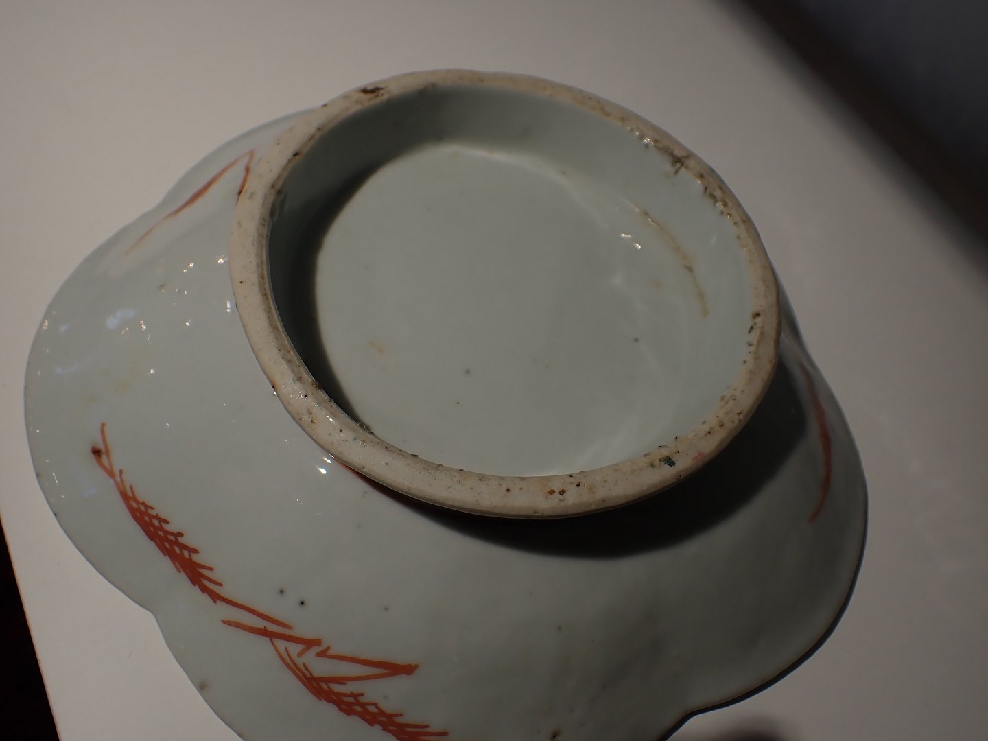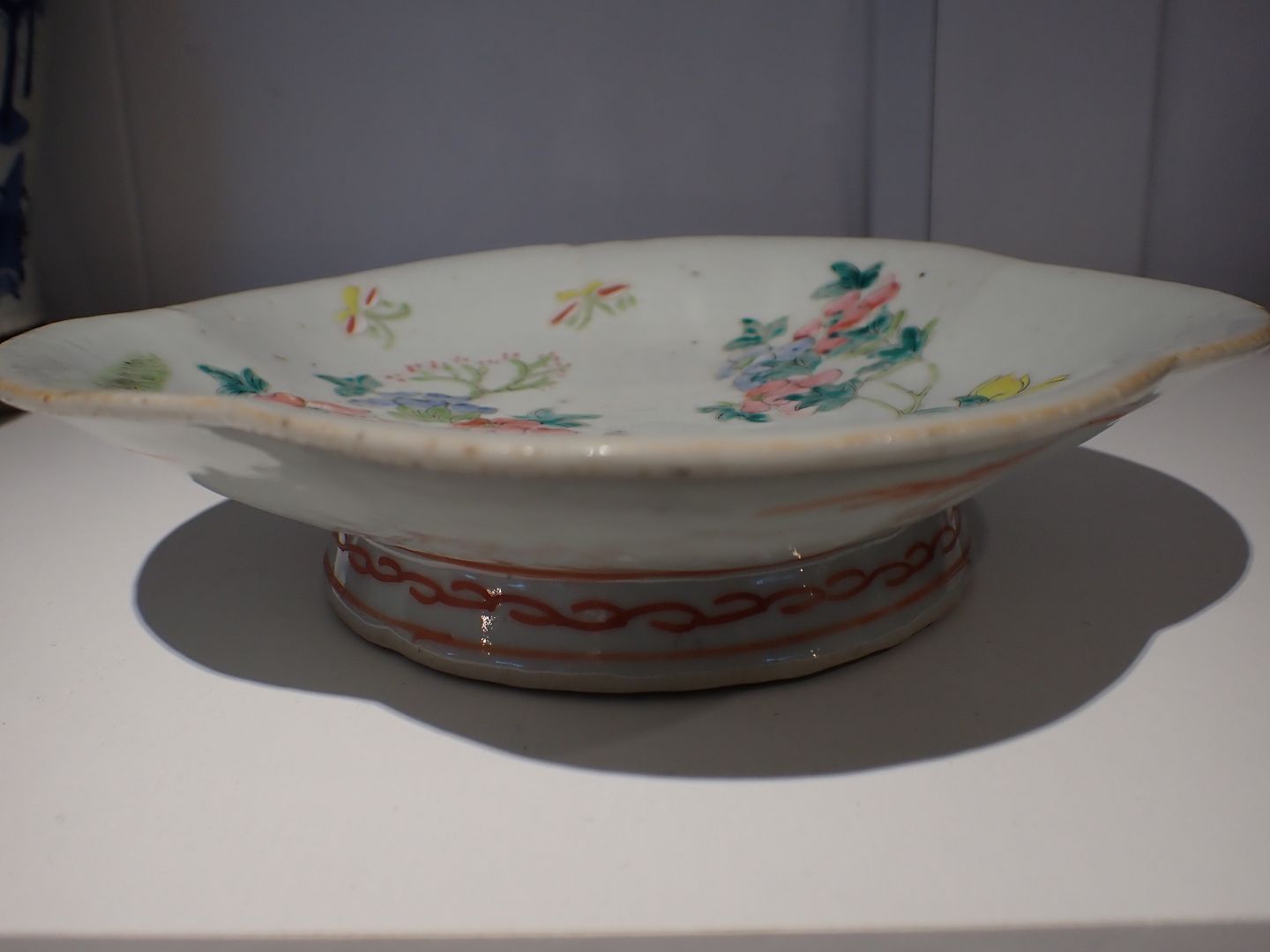 Kinesisk ferskenskål på fod med med 5 buer. Familie rose-dekorationer med fugl, blomster og insekter. Guan cheng Chêng (1723 - 1735). Diameter: 21,5 cm. Højde: 5 cm. I fin og hel stand..