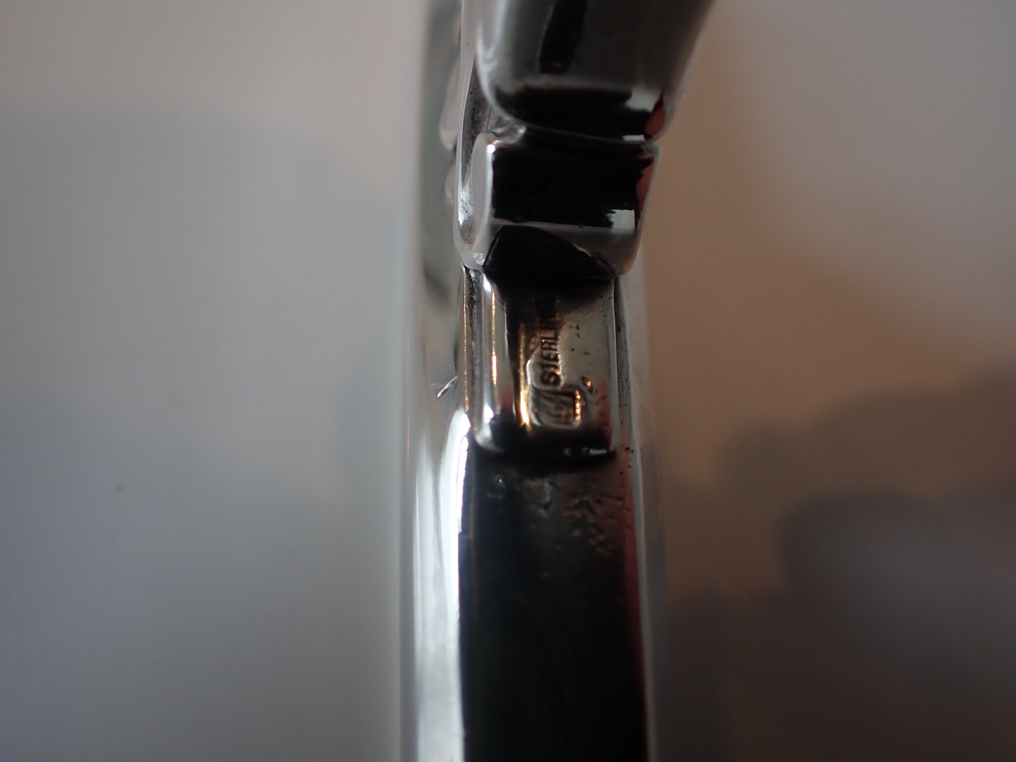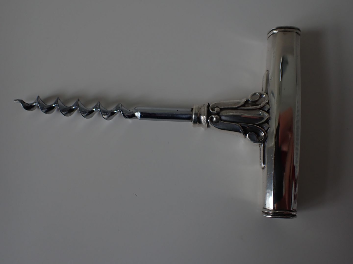 Georg Jensen Sølvsmedie (1904 - ) proptrækker i sterling sølv og stål fra Konge serien designet af Johan Rohde 1915. Stemplet GJ i firkant (1930 - 1944), Sterling, Danmark. Længde : 11 cm - bredde 7 cm.I fin stand med meget svag skævhed i stålskruen.