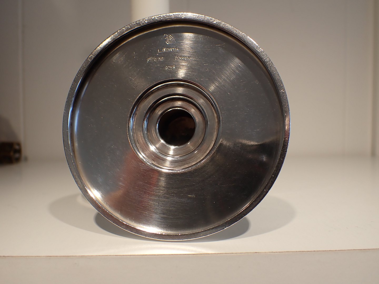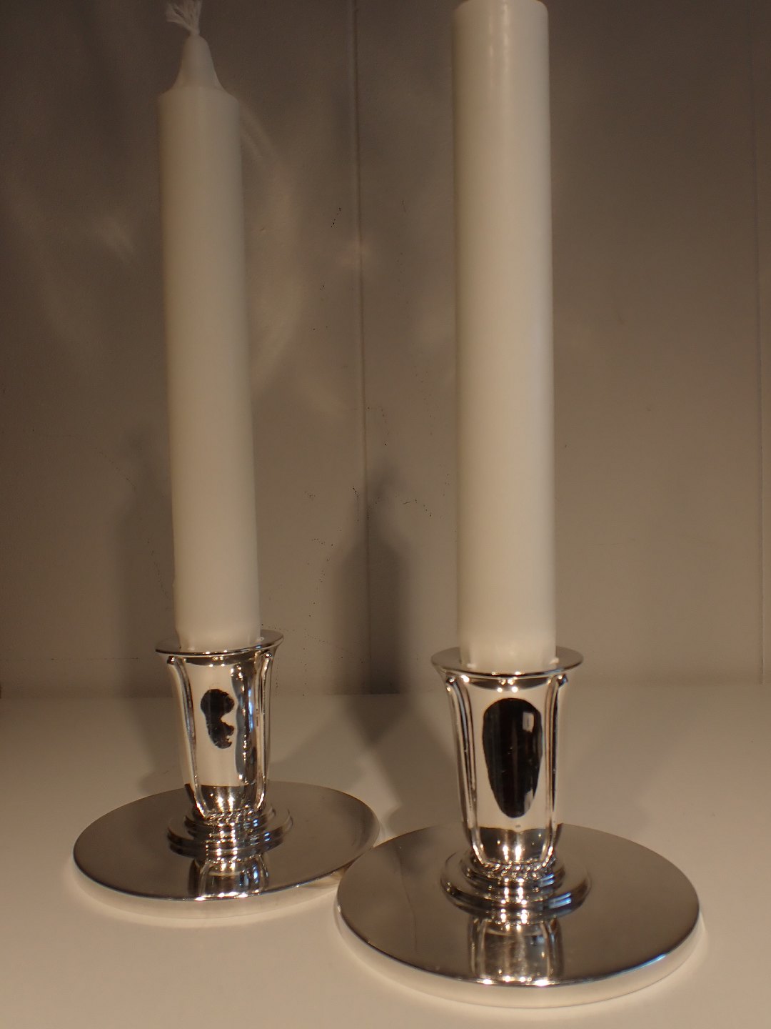 Laurits Bert, Kbh (1893 - 1957): Et par lave ikke udfyldte Art Deco stagrt i sterling sølv. Stemplet L. Bert. 925s. Formentlig fra 1930-erne. Vægt: 206 gram. Højde: 6,4 cm - diameter fod: 9,1 cm. I fim stand uden særlig meget brugslid.