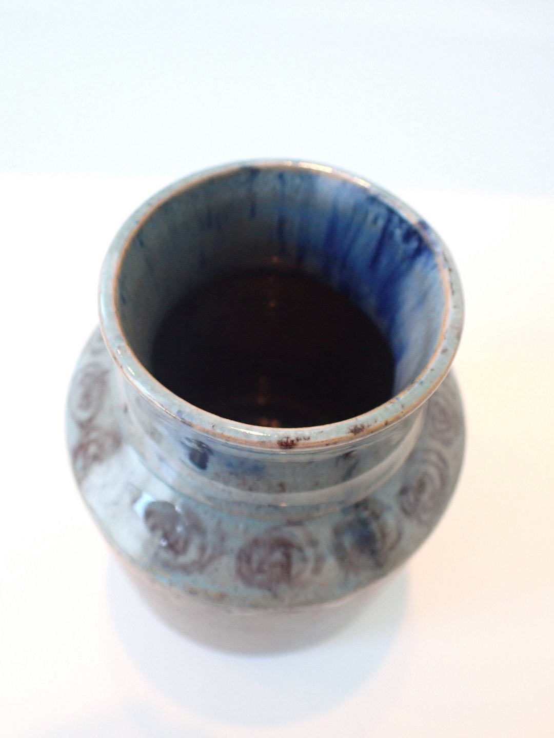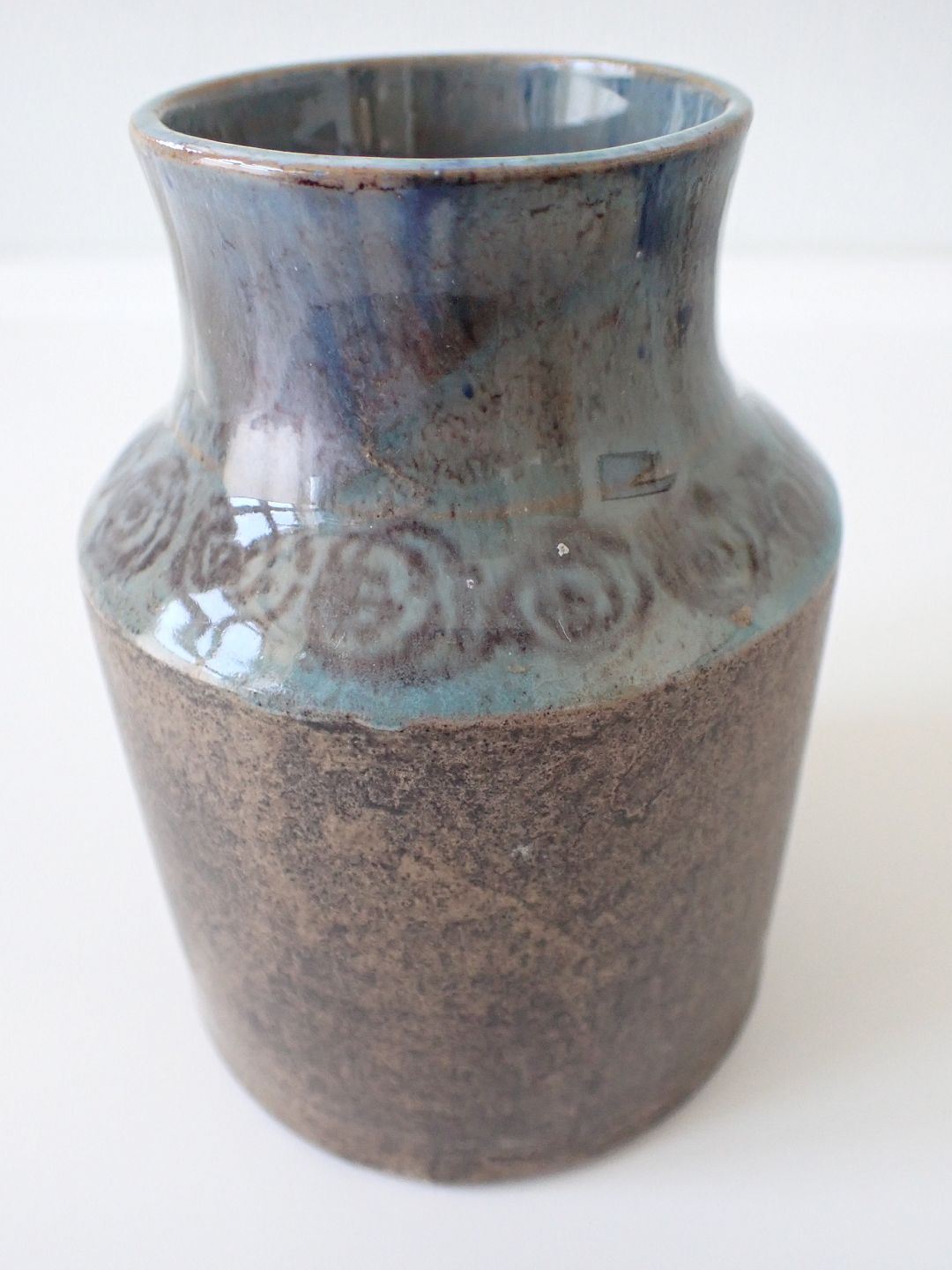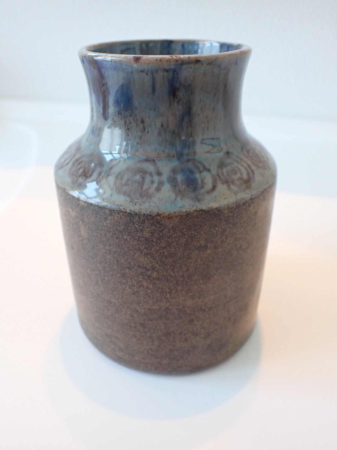 Chris Moos - stentøjsvase i blåler med grå/blå/grøn glasur på hals med dekorationer.