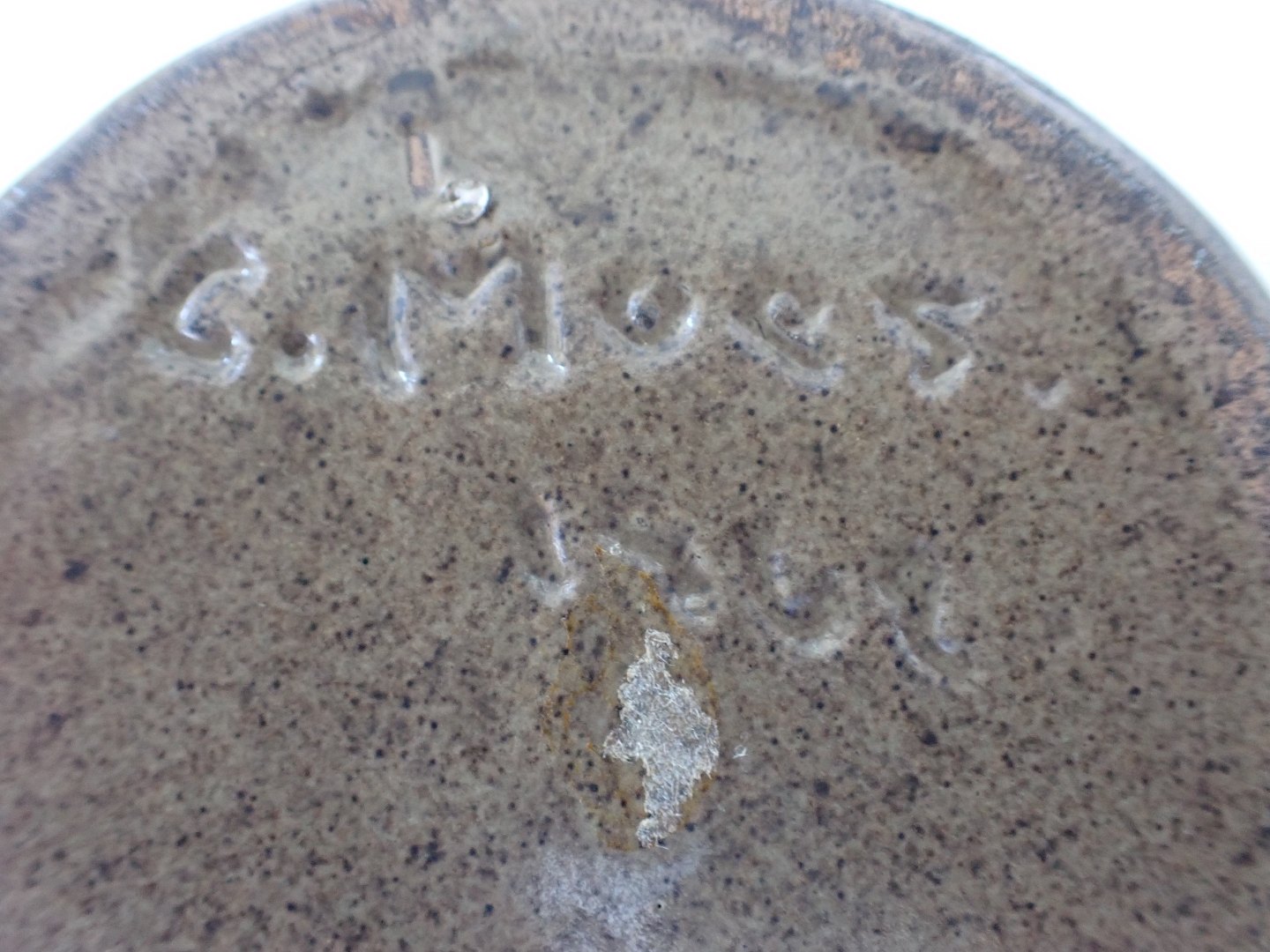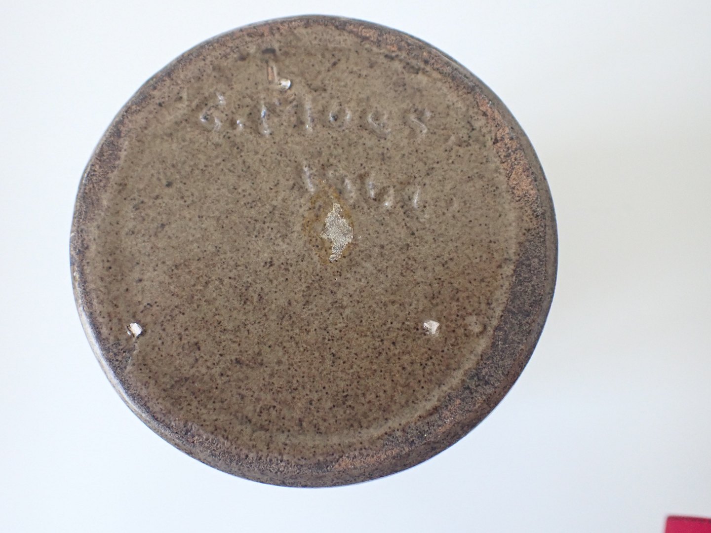 Chris Moos (1914 - 1998) - Lille vase i blålers stentøj med grå/blå/grøn glasur og "kruseduller" på halsen.. Signeret C. Moos, 1962.Højde: 12 cm. Diameter i bund: 8,5 cm.. I fin stand.