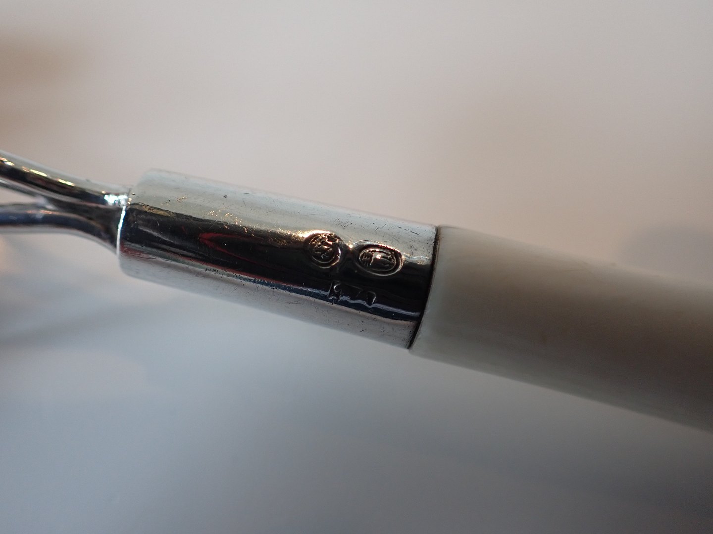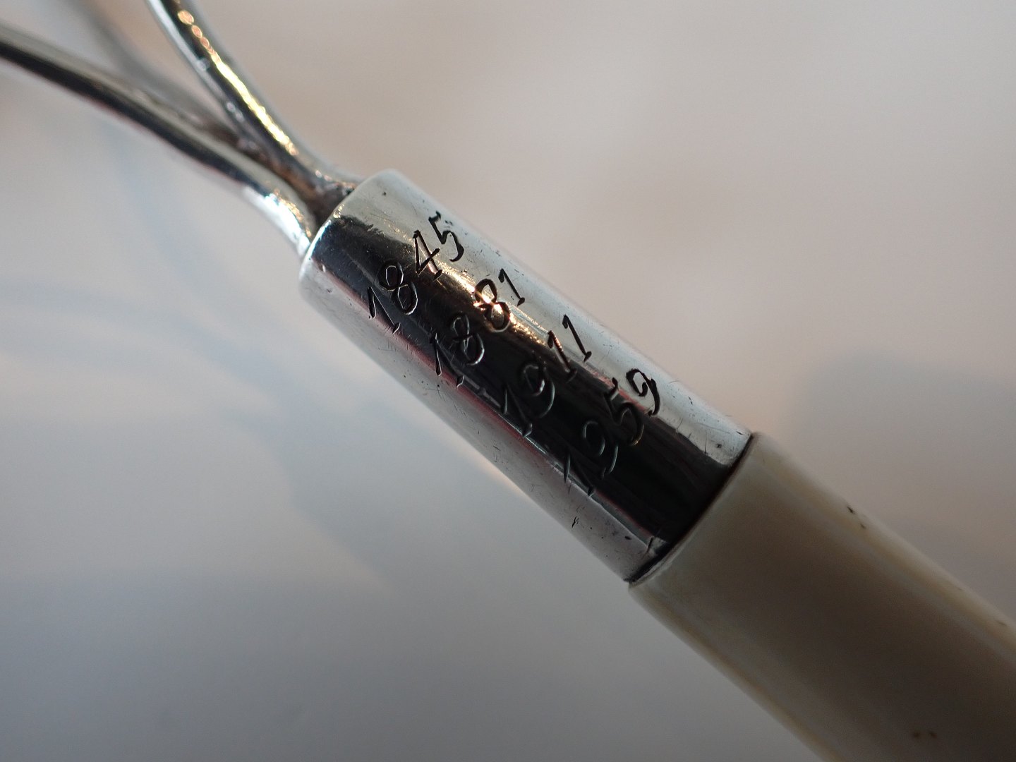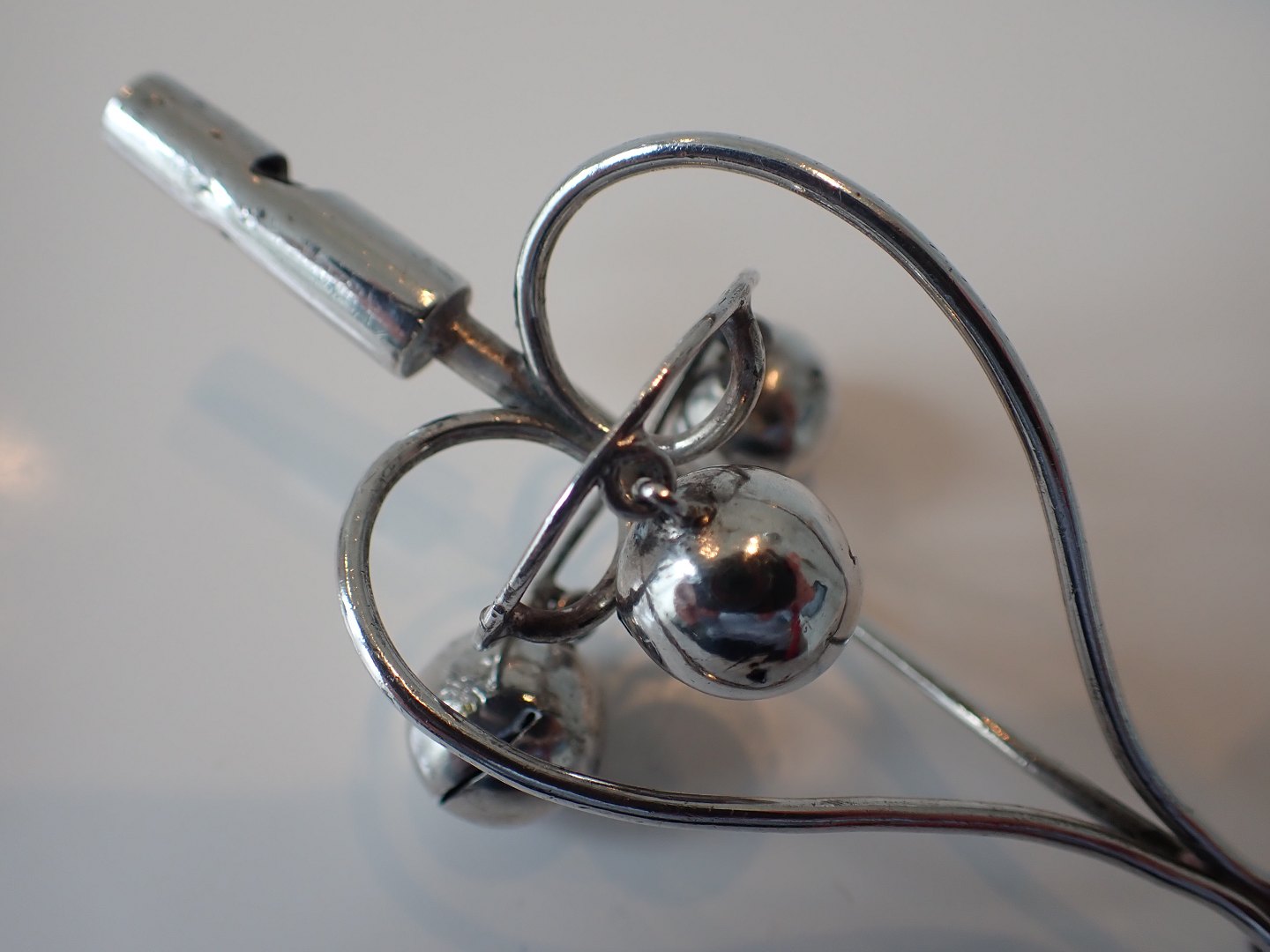 Gammel fløjterangle med 3 bjælder i tretårnet sølv med elfenbenshåndtag, Guadein; Peter Reiner Hinnerup (1840 - 63) Mesterstempel CA J.Christian Andersen. Indgraverede årstal for børn der har haft ranglen: 1845 (året hvor ranglen er lavet), 1881,1911,1959. Længde: 16 cm. I pæn stand i forhold til alder med lidt bidemærker på fløjten.