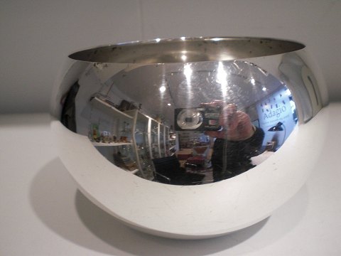 Rund pilleæske i sølv med dekoration på såvel låg som bund.