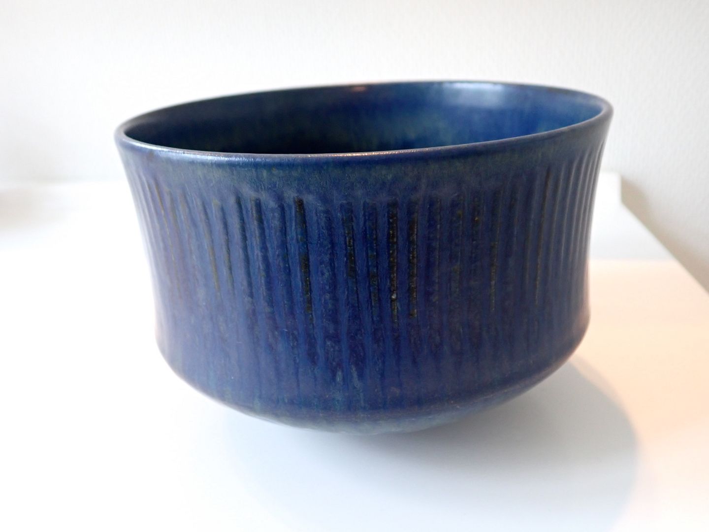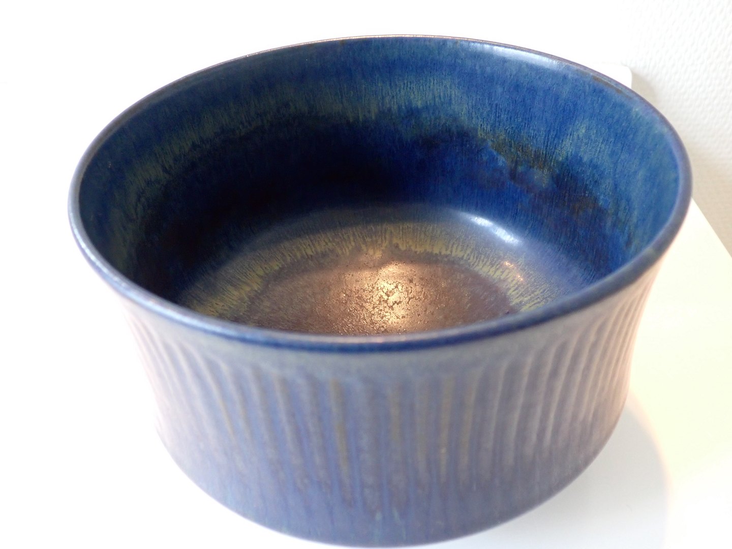 Eva Stæhr-Nielsen (1911 - 1976) for Saxbo. Høj skål i stentøj med let konkav side, modelleret med vertikale riller i relief. Mørkeblå glasur med okerfarvede elementer. Stemplet med yin yan mærket, Saxbo, Denmark , 212. Ca. 1955. Højde:11,5 cm.. Diameter: 17 cm. I fin stand.
