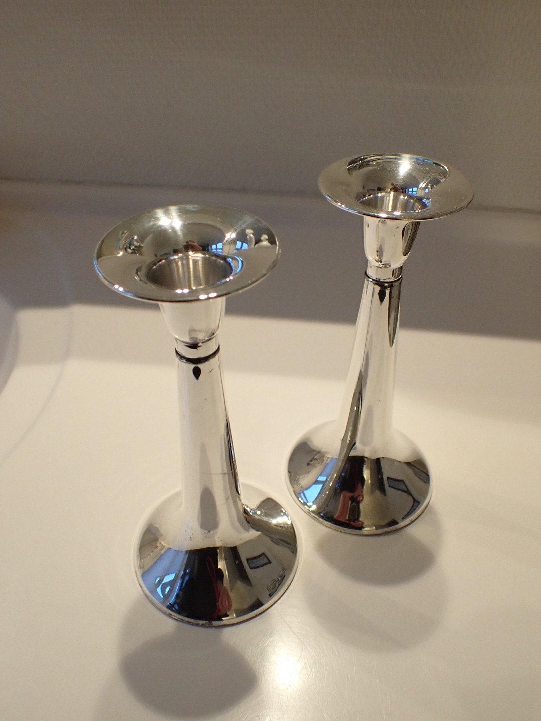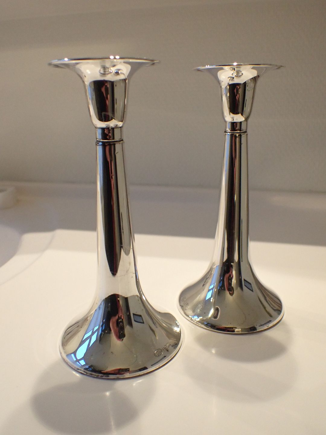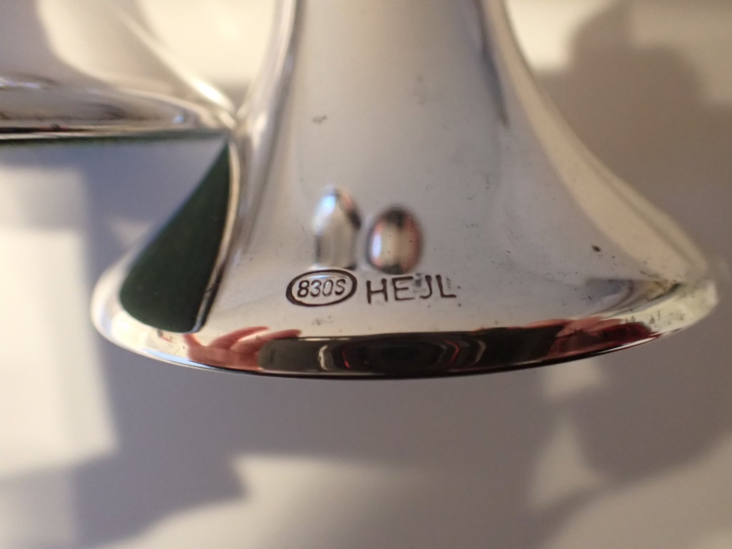 Et par moderne sølvlysestager udført af Hejl, Fredericia (1961 - ). Stemplet: 830S, Hejl. Udfyldte og med filt. Højde: 15,5 cm. I fin nærmest ubrugt stand.