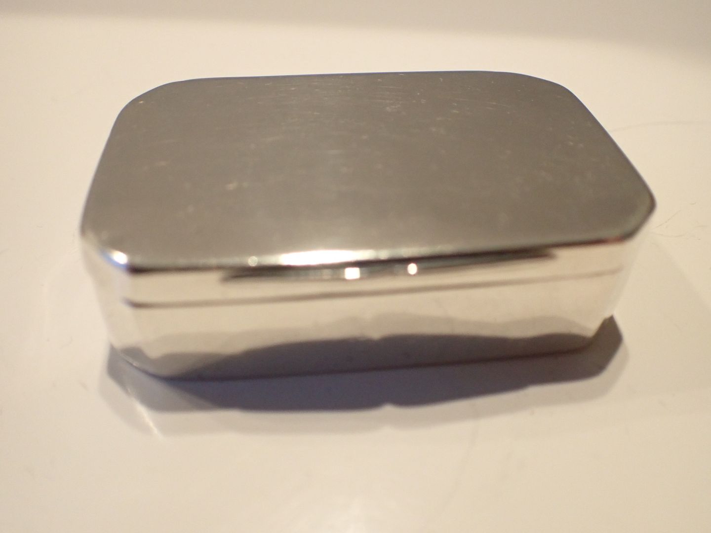 Rektangulær pilleæske i sølv, glat og indvendig forgyldt. Stockholm sølvsmed formentlig Joachim Flodin. årstalsmærke 1820. Vægt: gram. Mål: 5,5 x 3,6 x 1,5. Mere end 200 år med tidstypisk slid. gammel initial indgravering i bund.