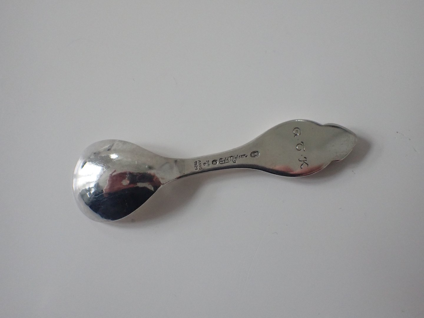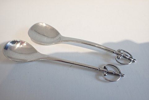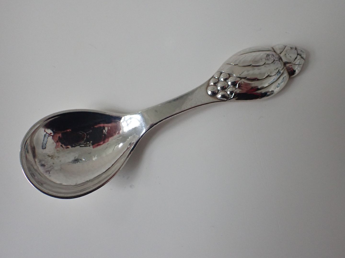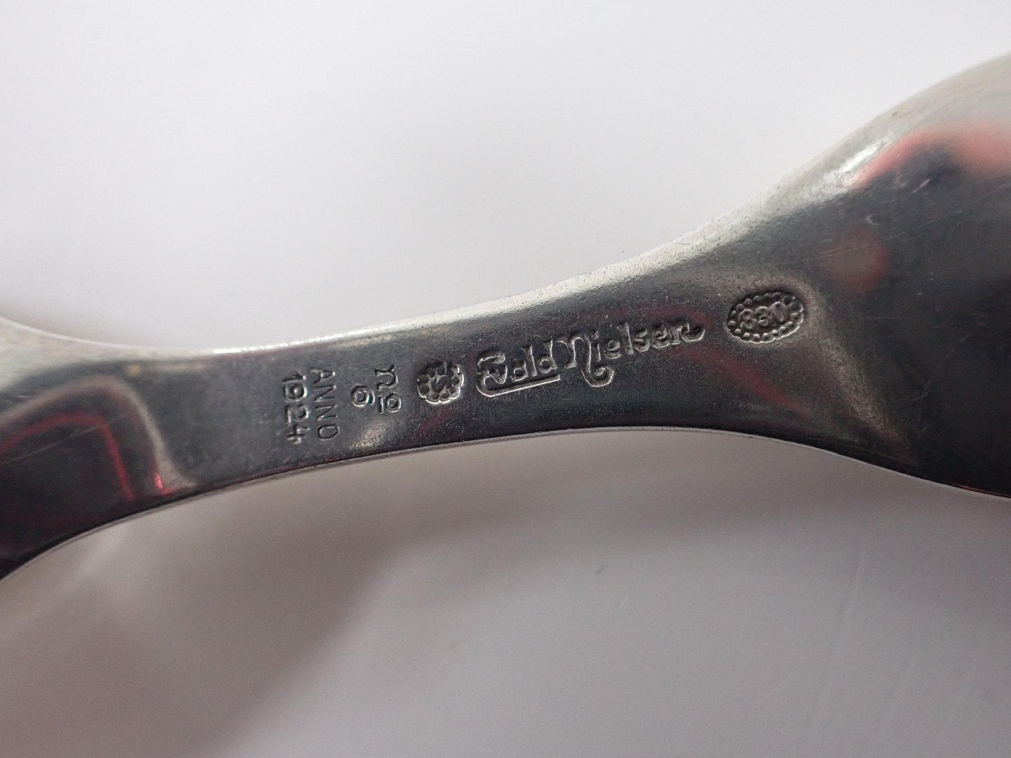 Evald Nielsen (1905 - 1970) - sukker/marmeladeske no. 6 i hammerslået sølv. Stemplet: 830, Evald Nielsen, S, No. 6, Anno 1924. Vægt: 31 gram. Længde: 12,5 cm. Bredde laf: 3,3 cm. I fin stand med meget let slid.
