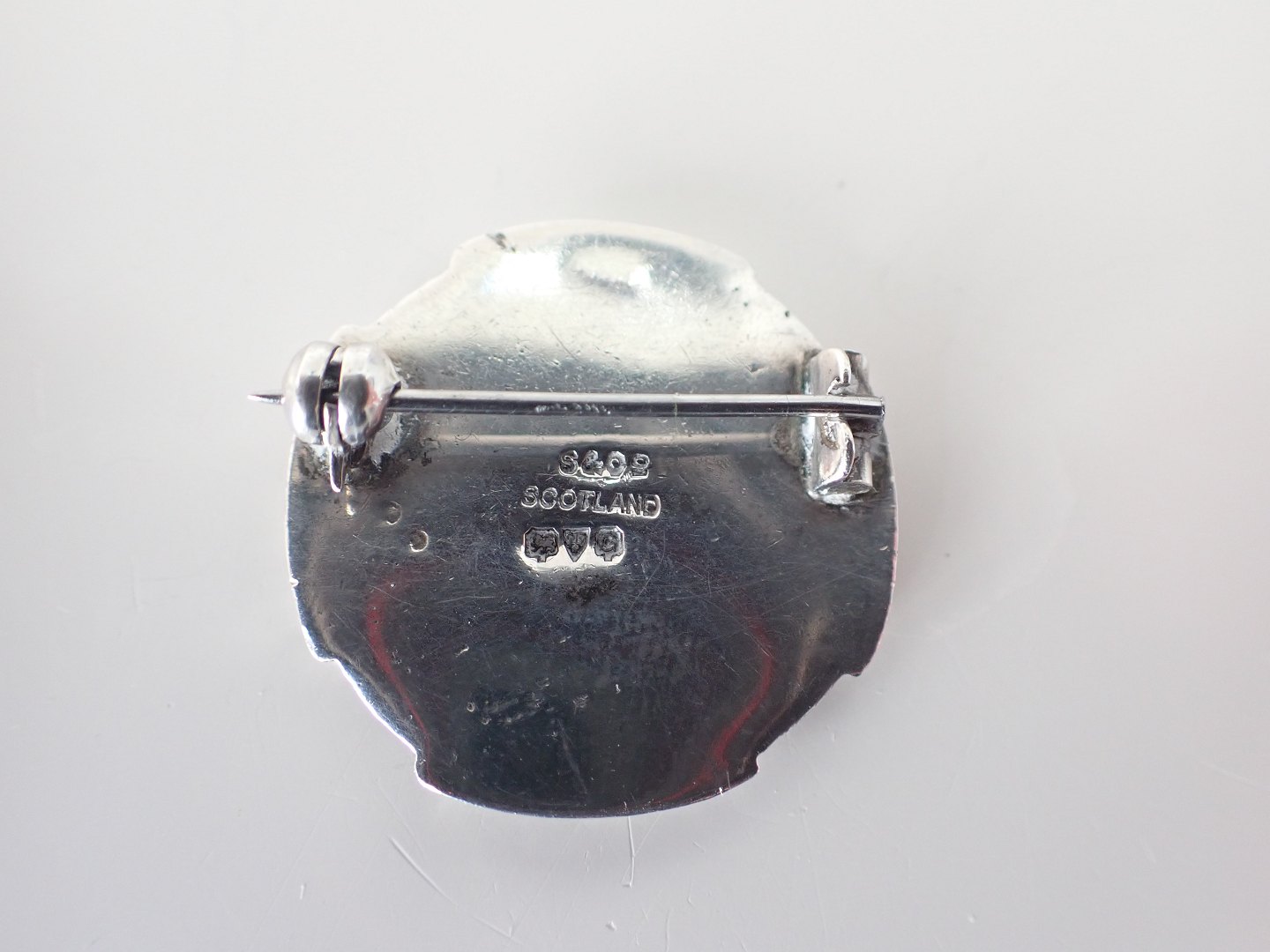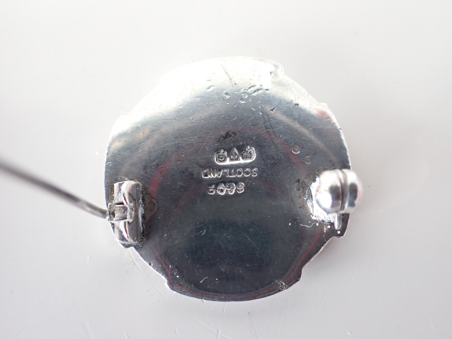 Lille skotsk sølvbroche med keltisk motiv. Skotsk sølvstempel (925s). Vægt: 8,6 gram. Diameter: 2,7 cm.