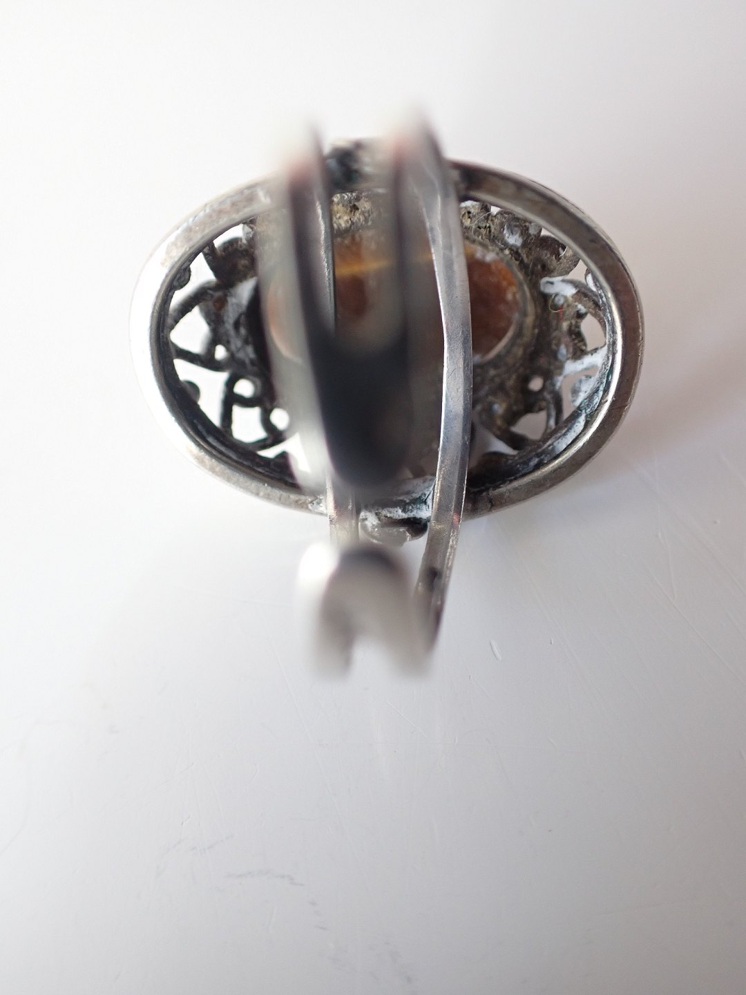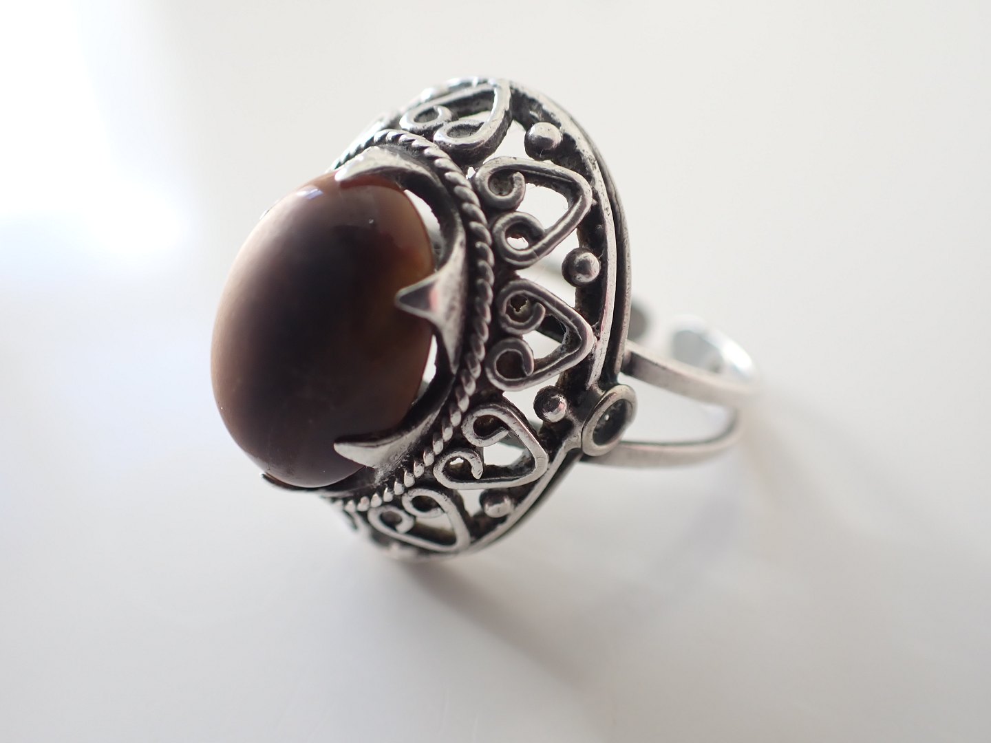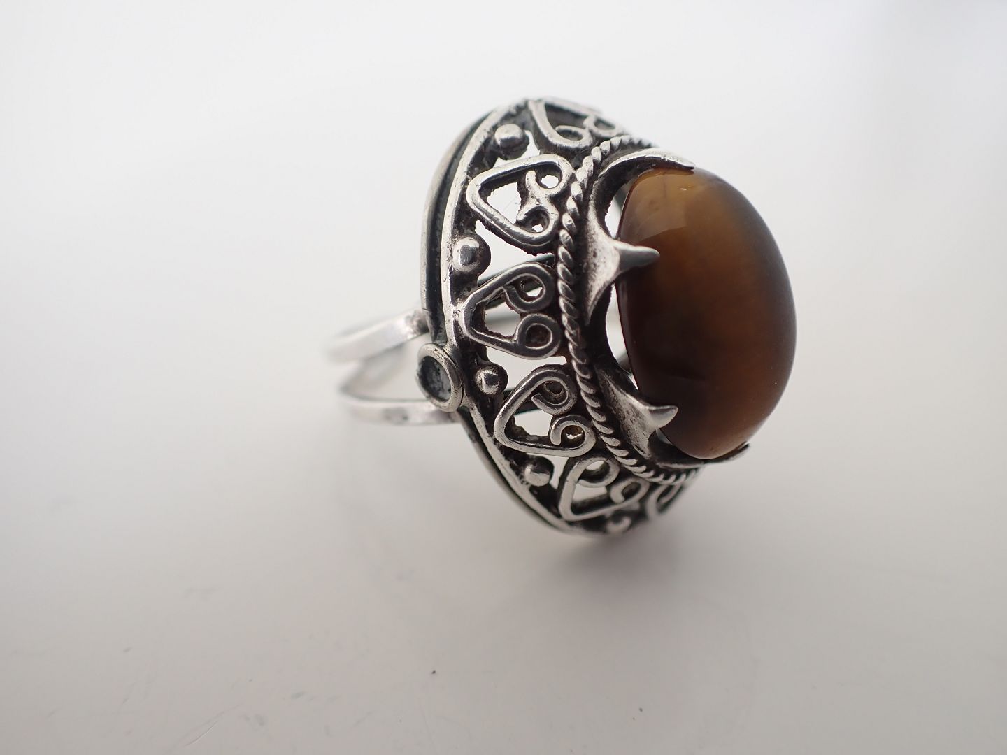 En sterling sølvring med carbochon sleben tigersten. Stempel 925. Ringstørrelse (åben): 56. Pæn med noget brugsslid på sten.