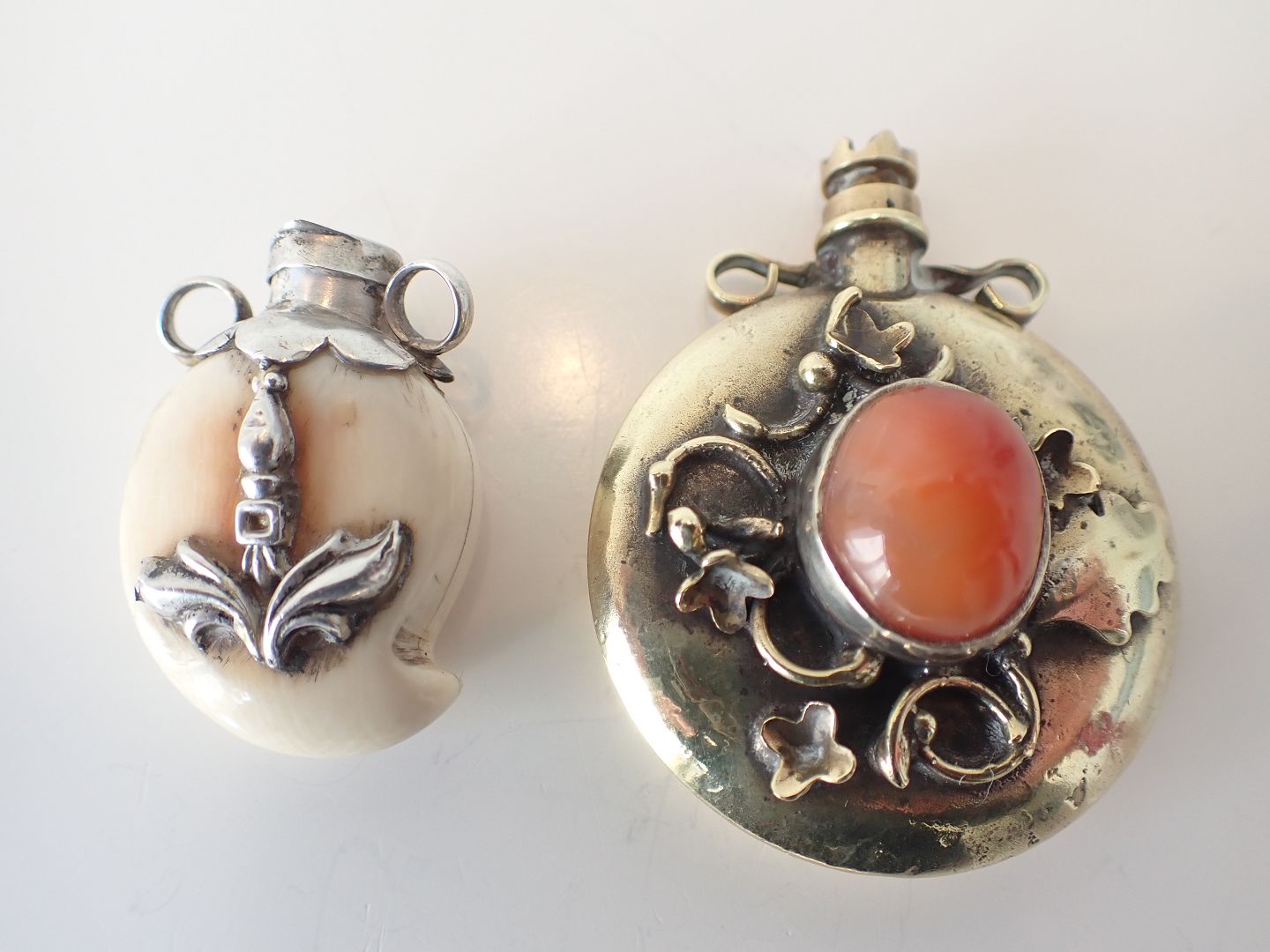 Til højre: Orientalsk parfumeflaske i messing med carbochonsleben agat indfattet i i sølv. Ca. 1900. Pris: 200 kr.
