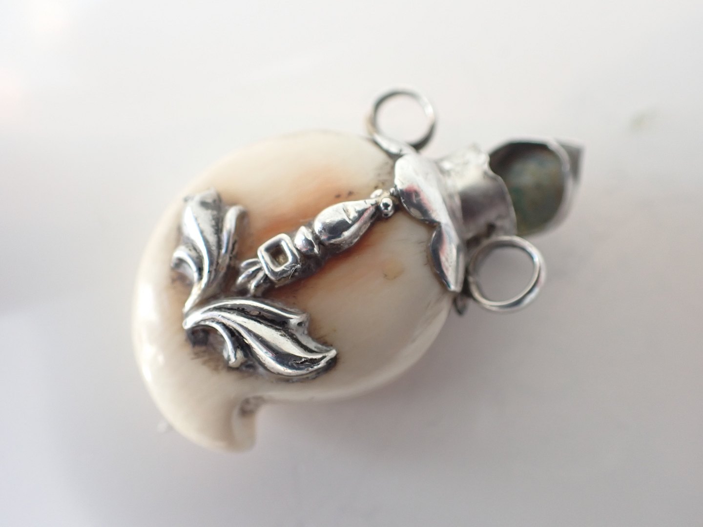 Til venstre: Meget lille, orientalsk, parfumeflaske i ben med sølvmontering (ustemplet). Højde. 3,3 cm. Pris: 175 kr.