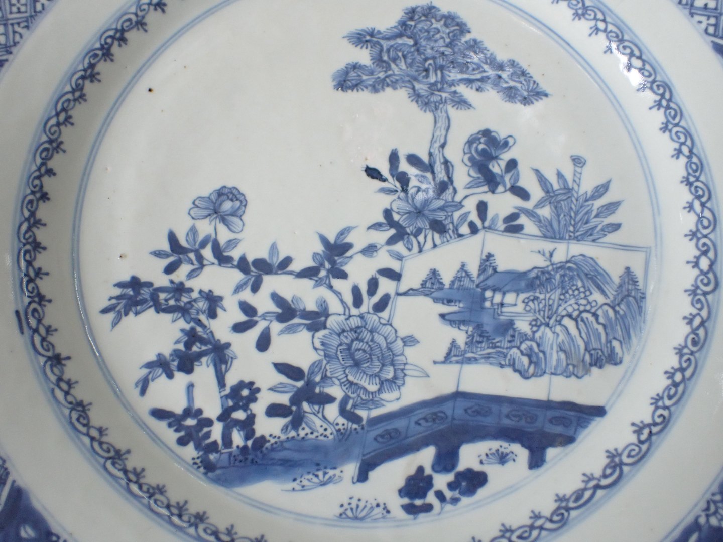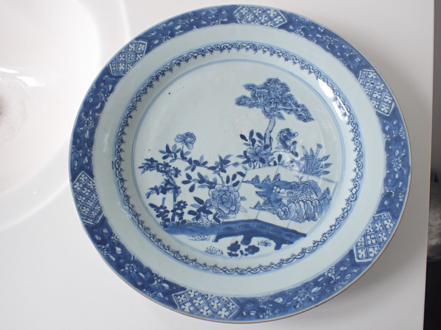 Kinesisk eksport porcelænsfad, Qianlong/Chien-Lung (1735 - 1795) dekoreret med haveeksteriør i blå underglasur. Diameter: 30,5 cm. I pæn stand med let brugsslid.