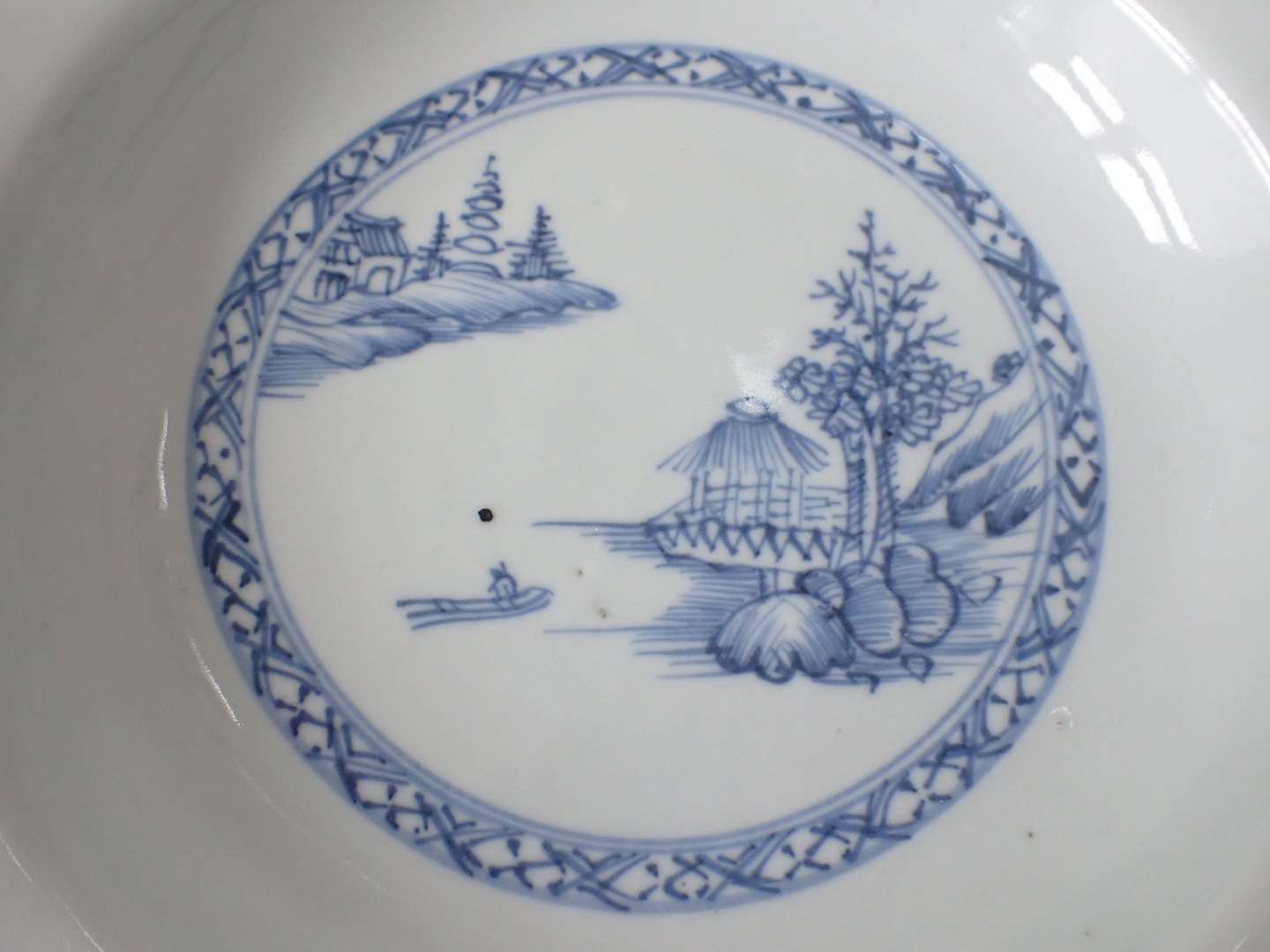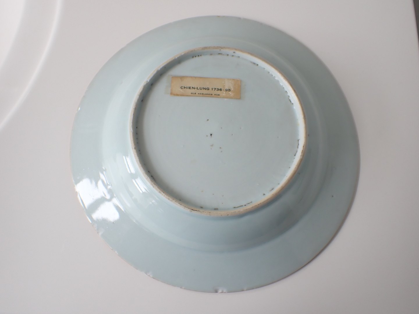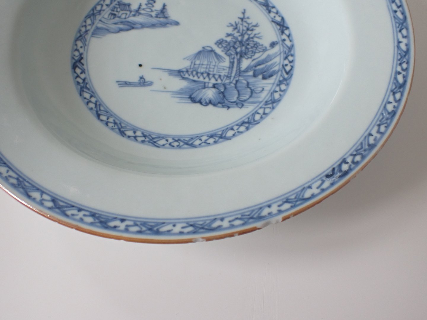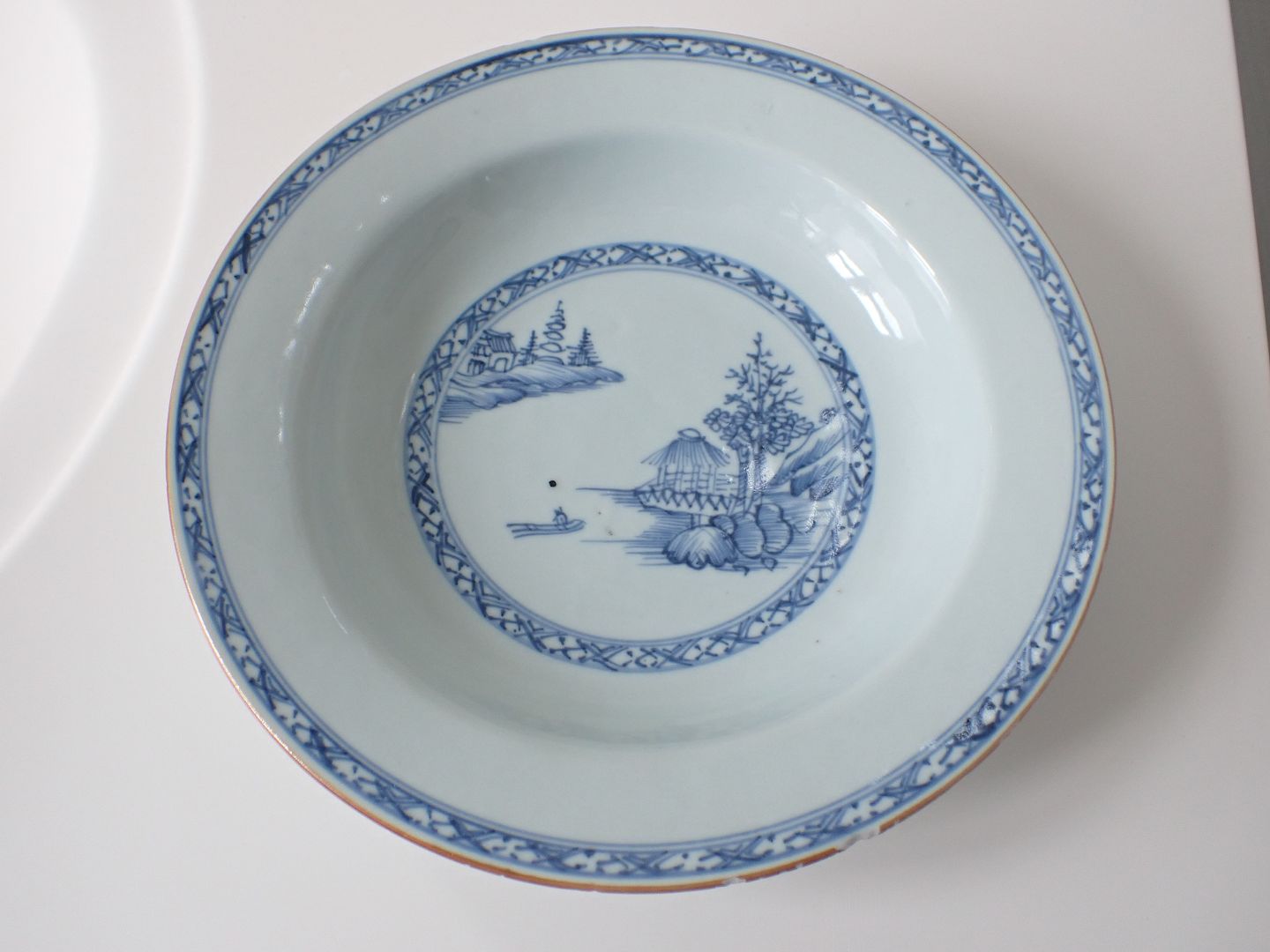 Kinesisk eksport porcelænstallerken, dyb, Qianlong/Chien-Lung (1735 - 1795) dekoreret med haveeksteriør i blå underglasur. Diameter: 22,5 cm. Proveniens: Ole Haslunds Hus. I pæn stand med lille nip i kant.