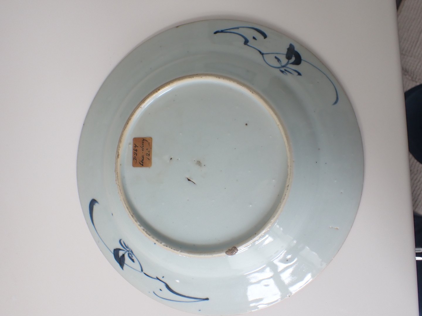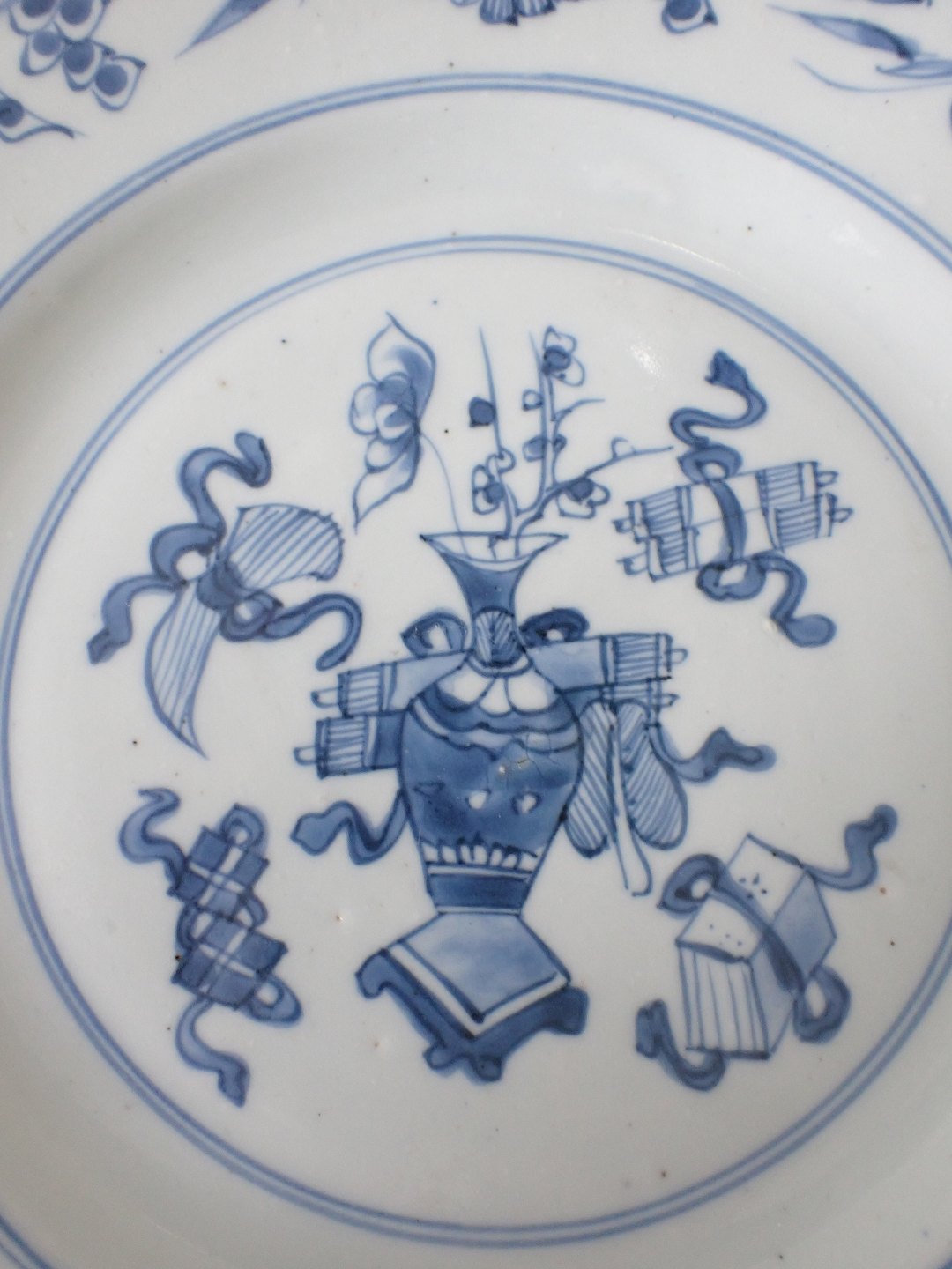 Kinesisk eksport porcelænstallerken, Qianlong/Chien-Lung (1735 - 1795) dekoreret med "De tusind ting" i blå underglasur. Diameter: 22,5 cm. I pæn stand et lille nip i kant.