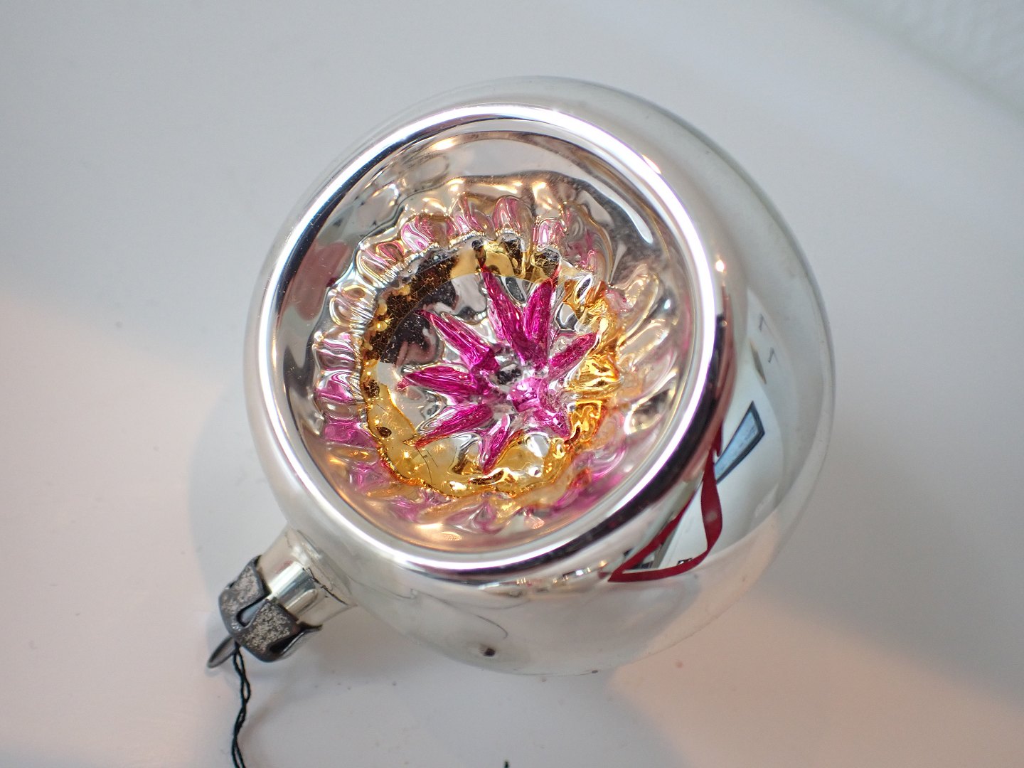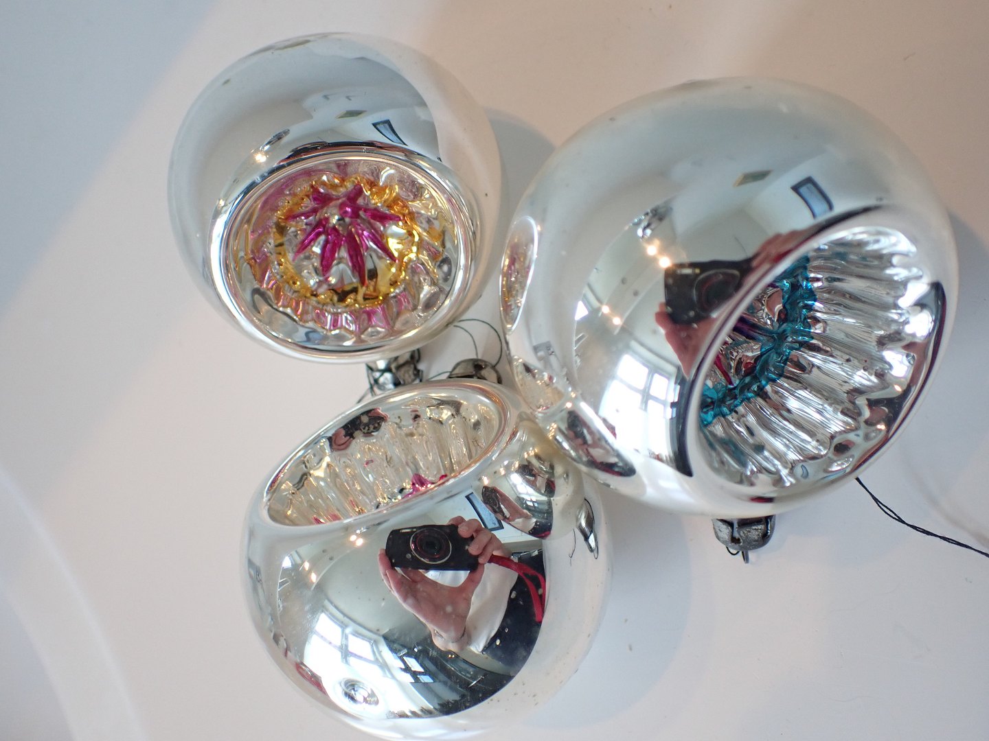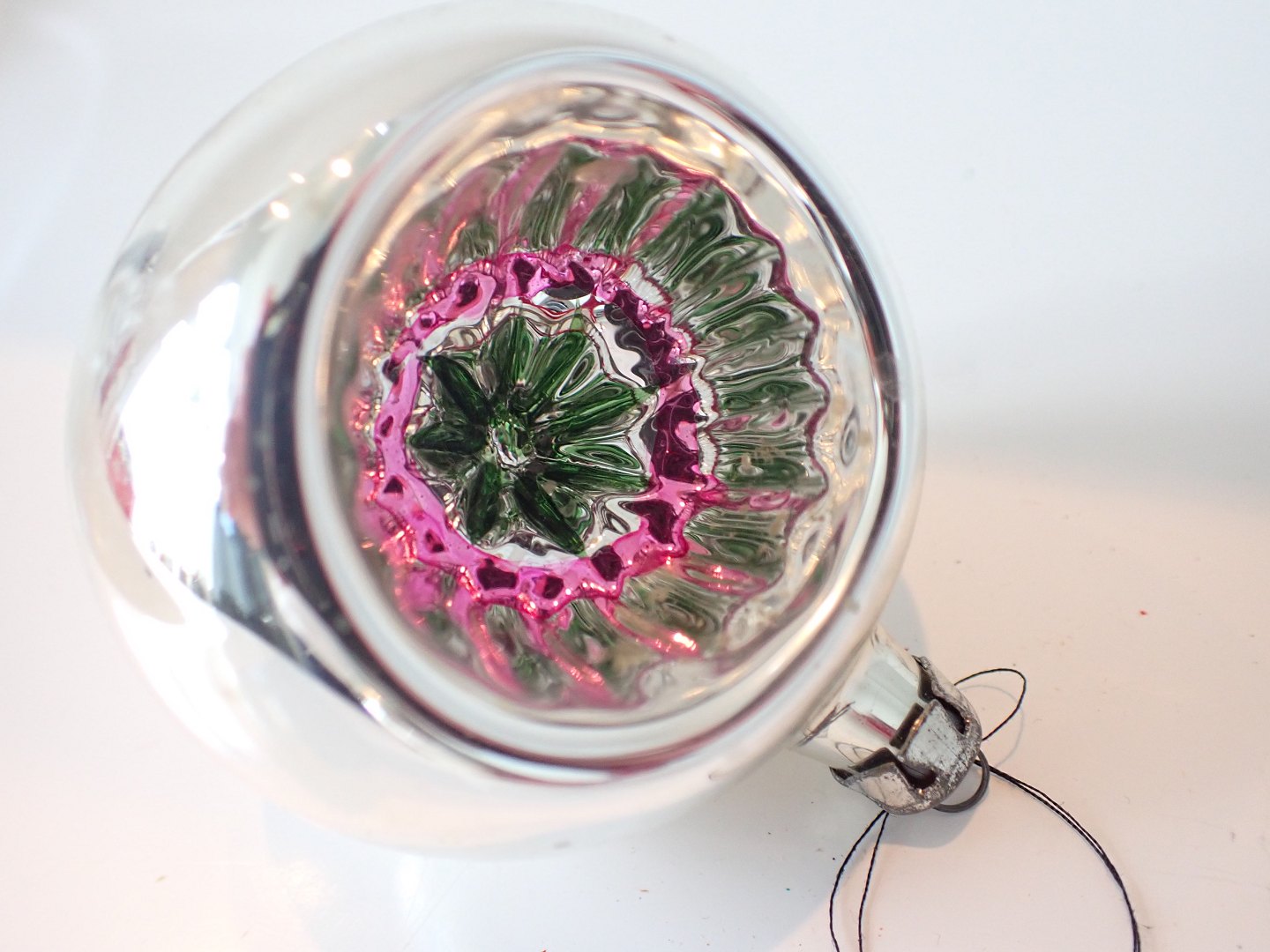 5. stk. glasjulepynt, store reflektorer. Håndmalede centre i forskellige farver. Tyske ca. 1950. Højde 7 cm.