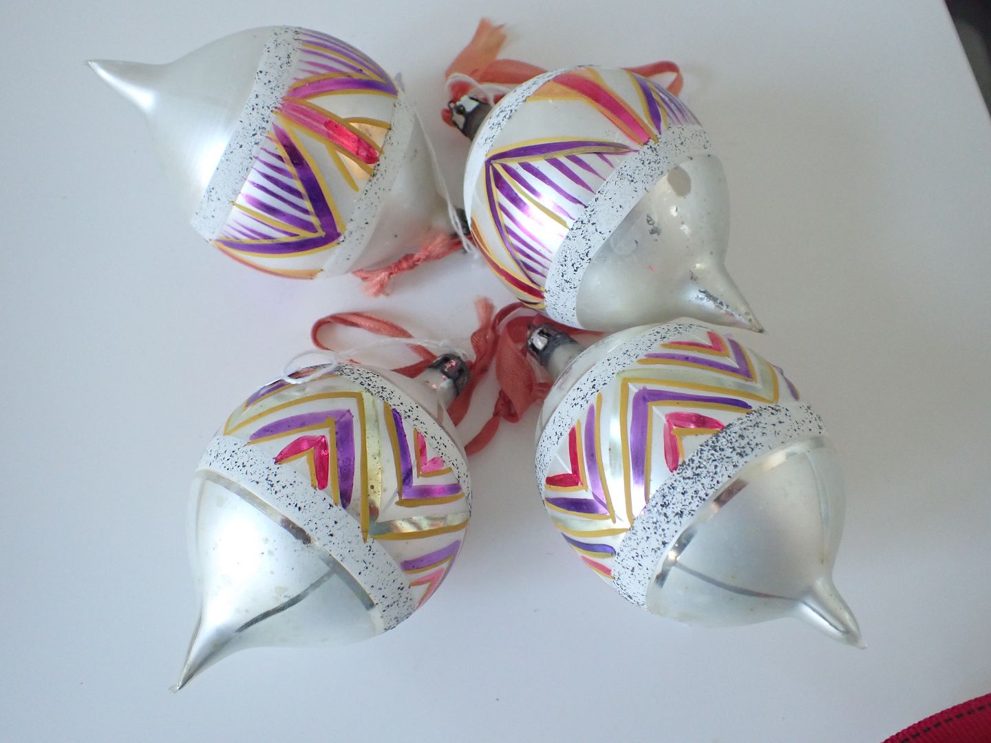 4 stk. glasjulepynt - dråbeformede med lilla, blå, rød og gul håndmaling. Russiske, 1950-erne. Højde: 11 cm. Diameter: 6 cm. Pris: 80 kr. stk.