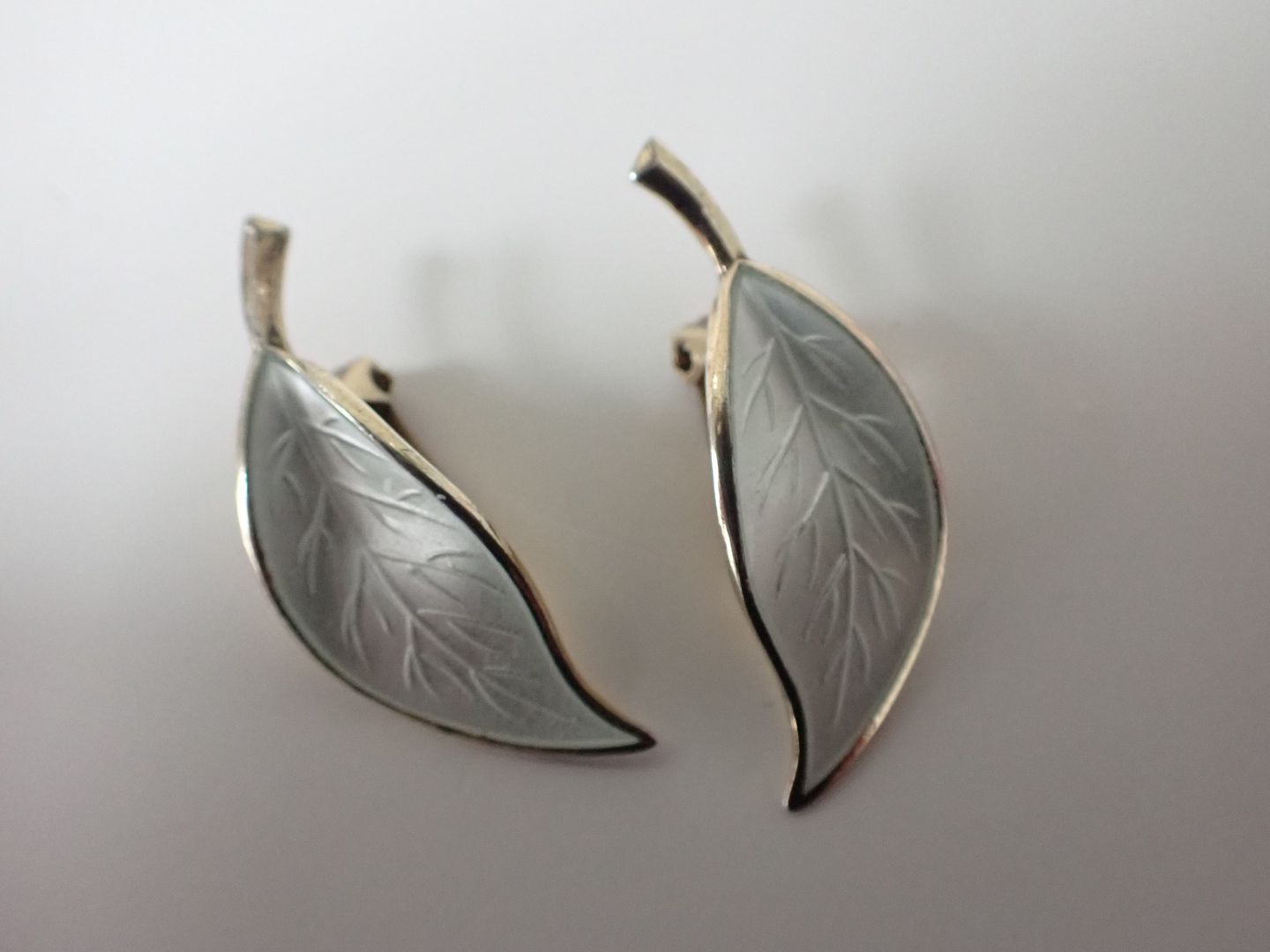 David Andersen (1880 - 1980) forgyldt sterling sølvøreklips i bladform med hvid emalje p guiliocheret baggrund. Designet af Willy Winnanaess i 1950-erne. Stempler: Vægt i cirkel, D-A, 925s, Norway Sterling, W i cirkel. Længde: 3,3 cm. Bredde: 1,1 cm. Vægt: 4,5 gram. I fin stand uden emaljebeskadigelser