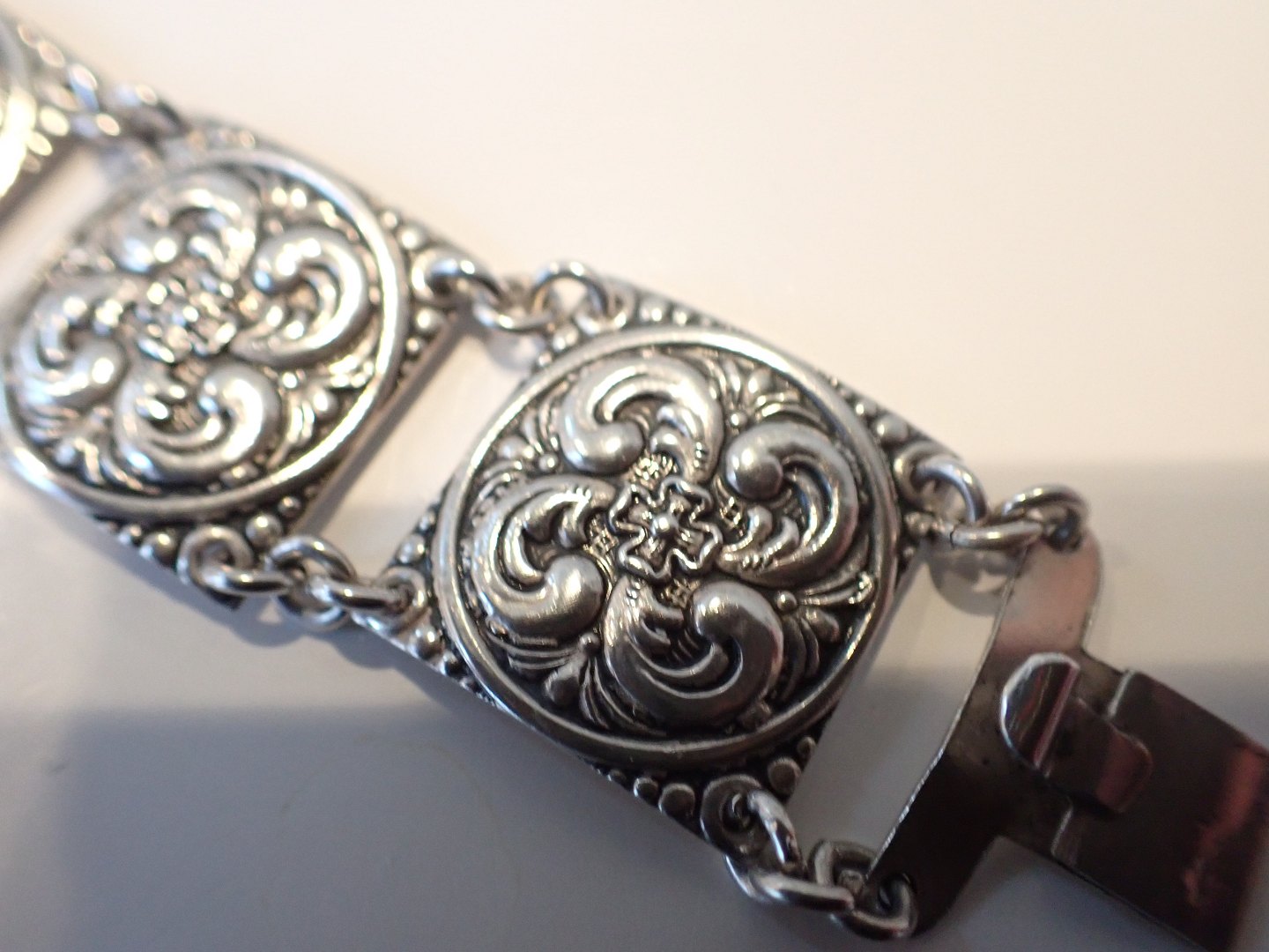 Nils Elvik, Oslo (1853 - 1948) - leddelt skønvirke armbånd i 830 sølv. Ca. 1920. Længde: 16,5 cm. Bredde: 2,8 cm.Vægt: 22 gram. I pæn tidstypisk stand.