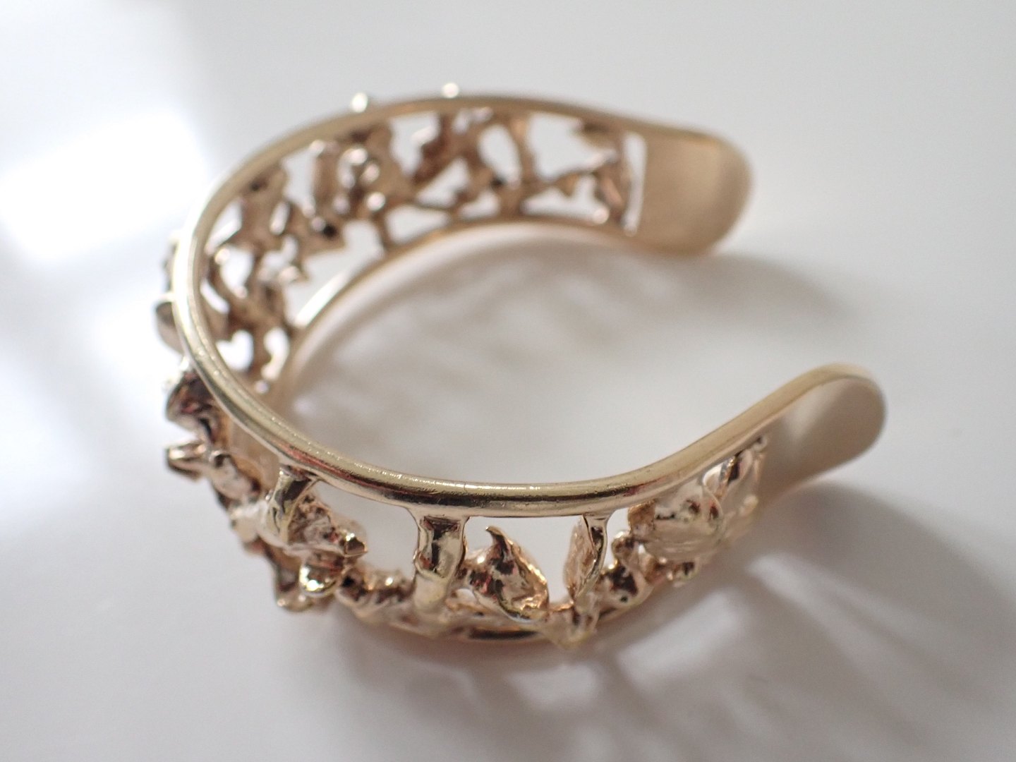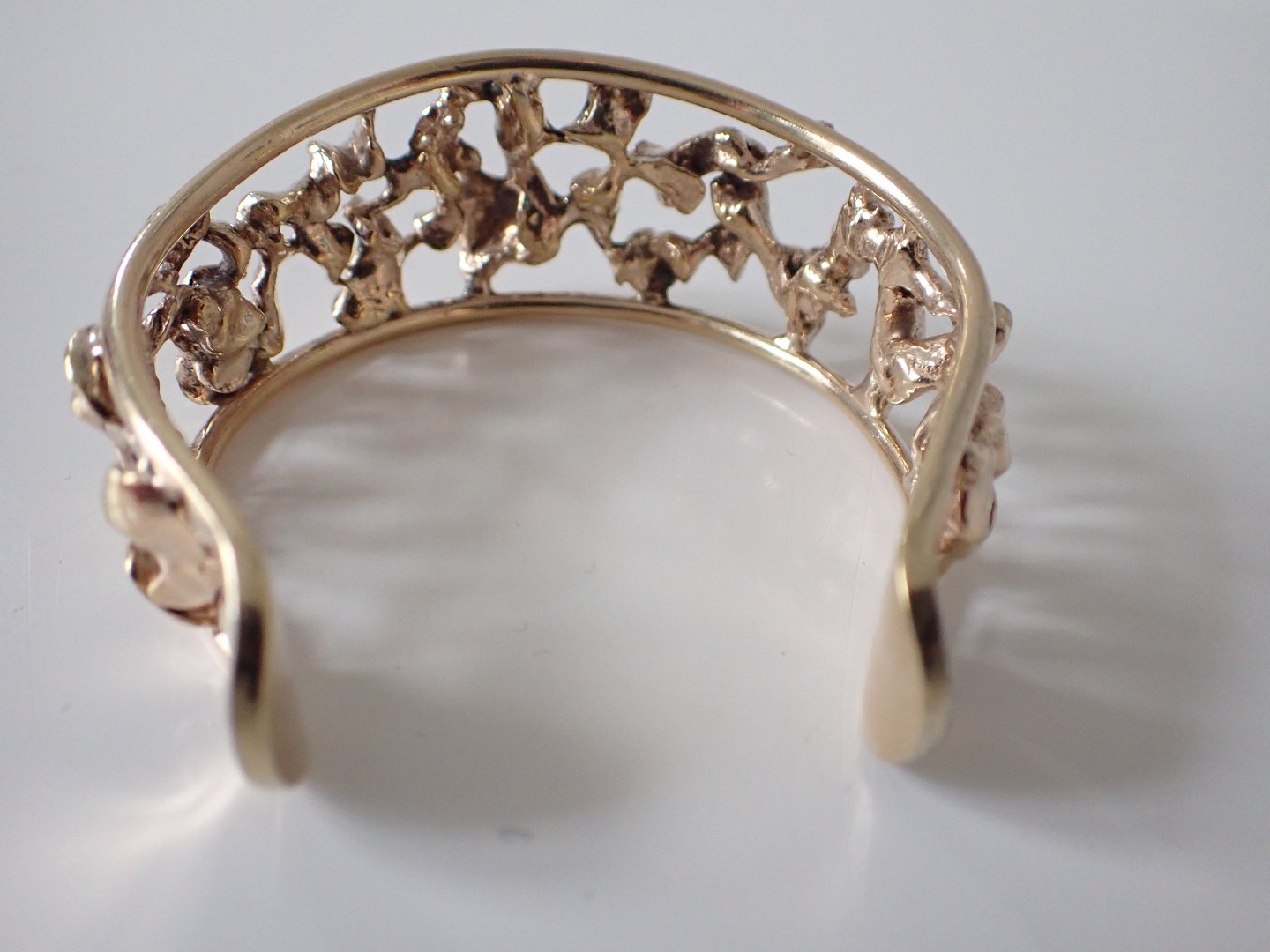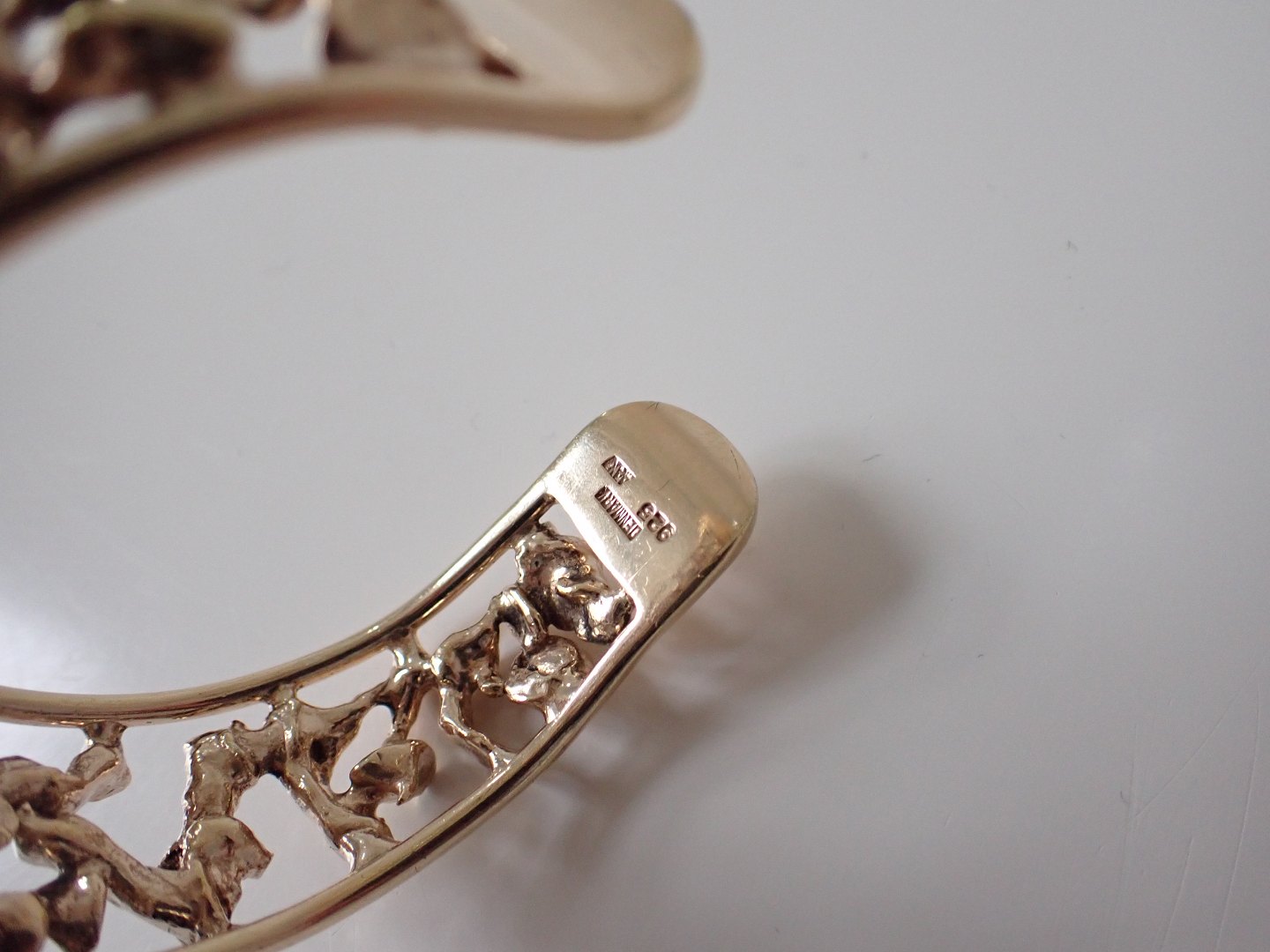 Aage Weimar (1902 - 1986) - åben armring i forgyldt sterling sølv med gennembrudt skulpturelt mønster. Stemplet Denmark, 925, AAW. Ca. 1960. Indvendig bredde: 5,5 cm. Bredde armbånd: 2,6 cm. Vægt: 61,5 gram. I pæn stand med meget lette brugsspor