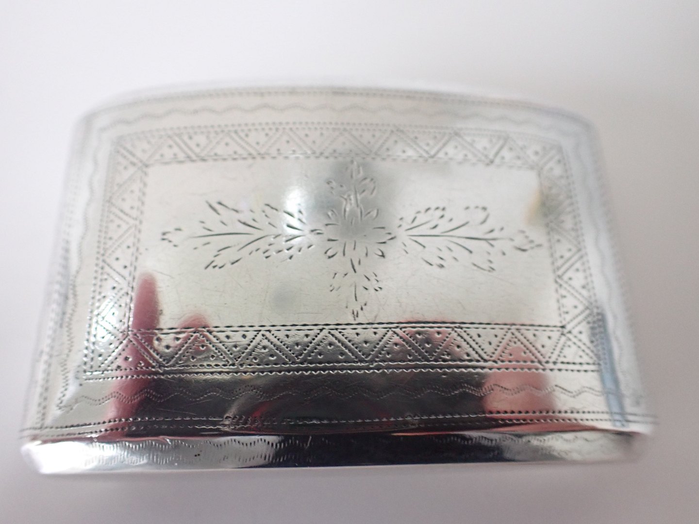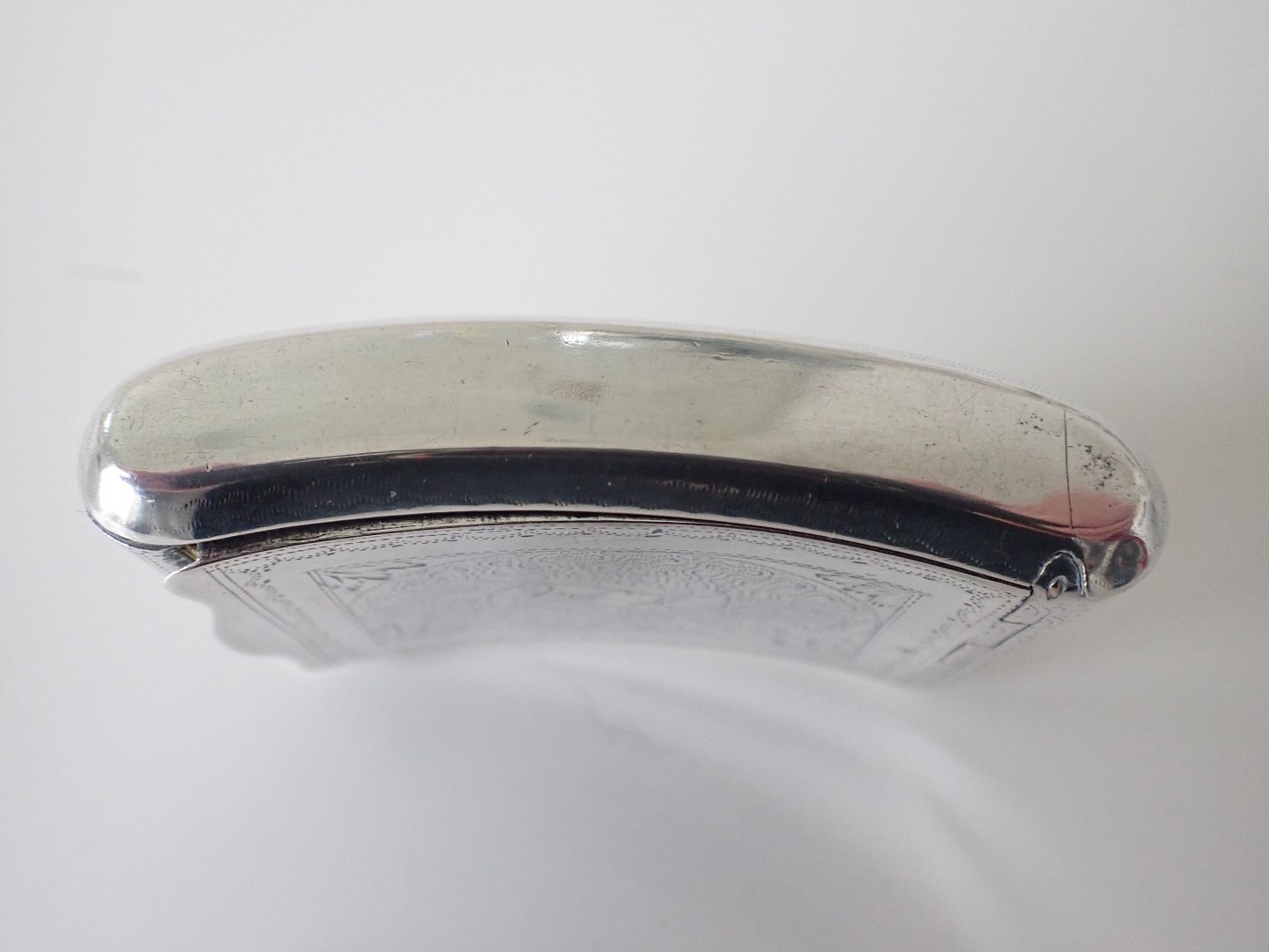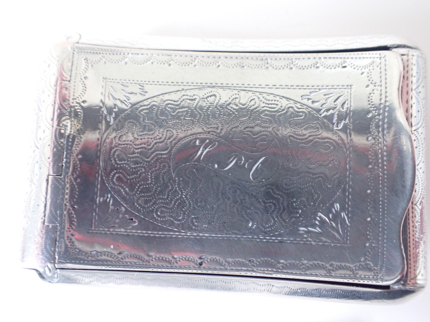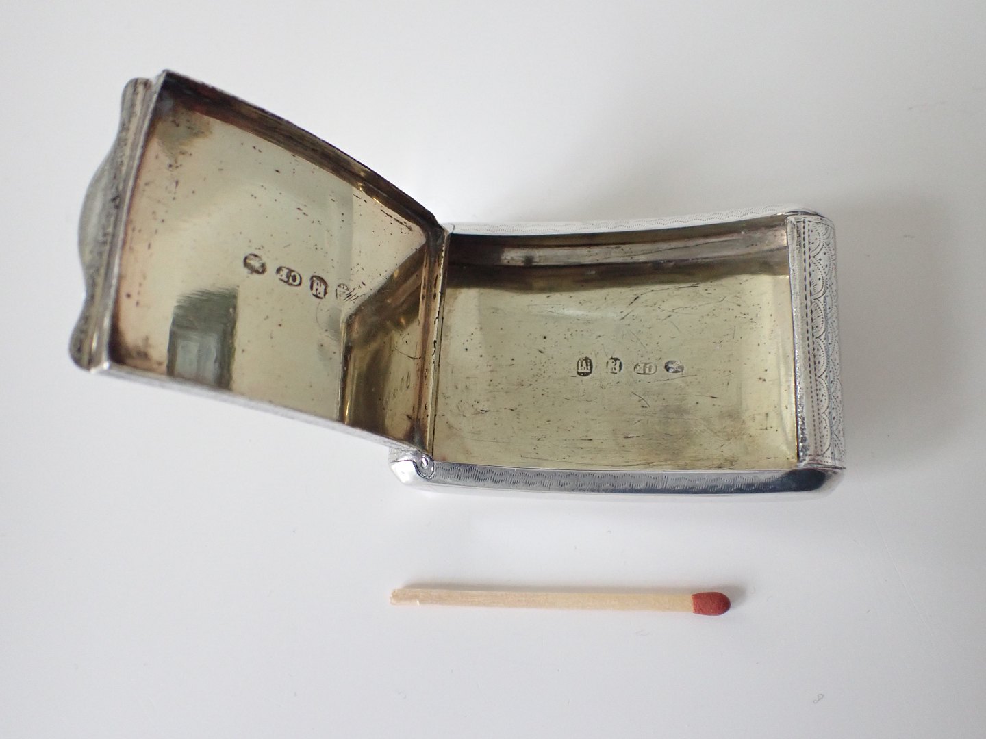 Christian Fentz (1789 - 1858), Assens - lommeformet snusæske i sølv med forgyldt indre og med mønstre og blad dekorationer. På den buede bund, i bølget bånd er diskret graveret initialer: H.P.C. Stempler: Tretårne 1846. Guardein PH (Peter Hinnerup 1840 - 63), CF i oval og Lammet (Assens bymærke)