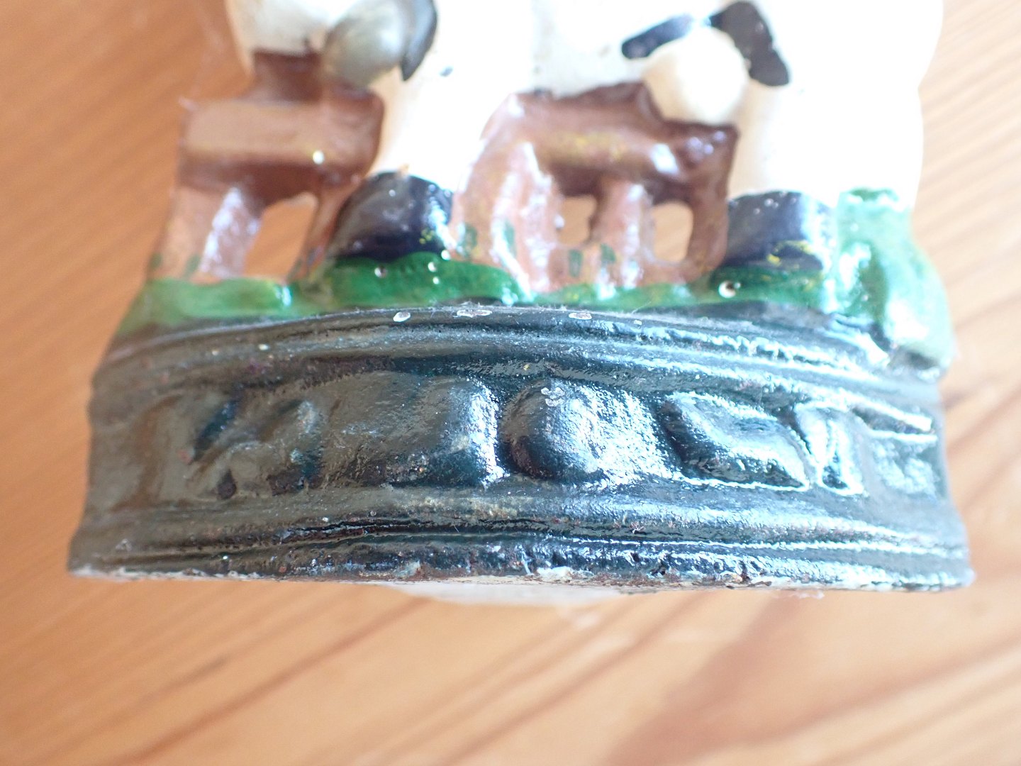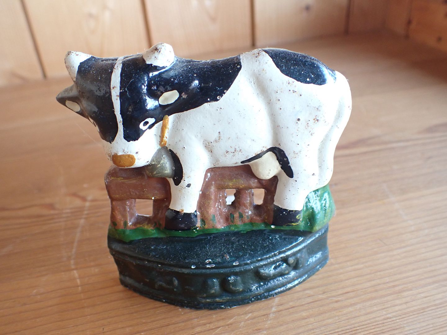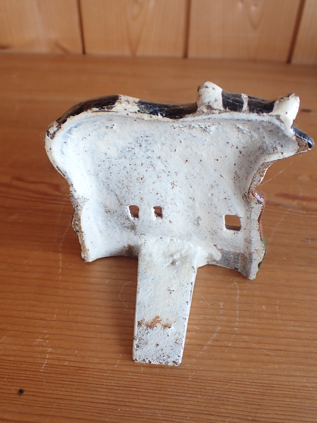 Dørstopper i støbt jern - håndmalet broget ko. Formentlig dansk ca. 1930. Højde. 8,8 cm. Bredde: 8 cm. I fin stand i forhold til alder.