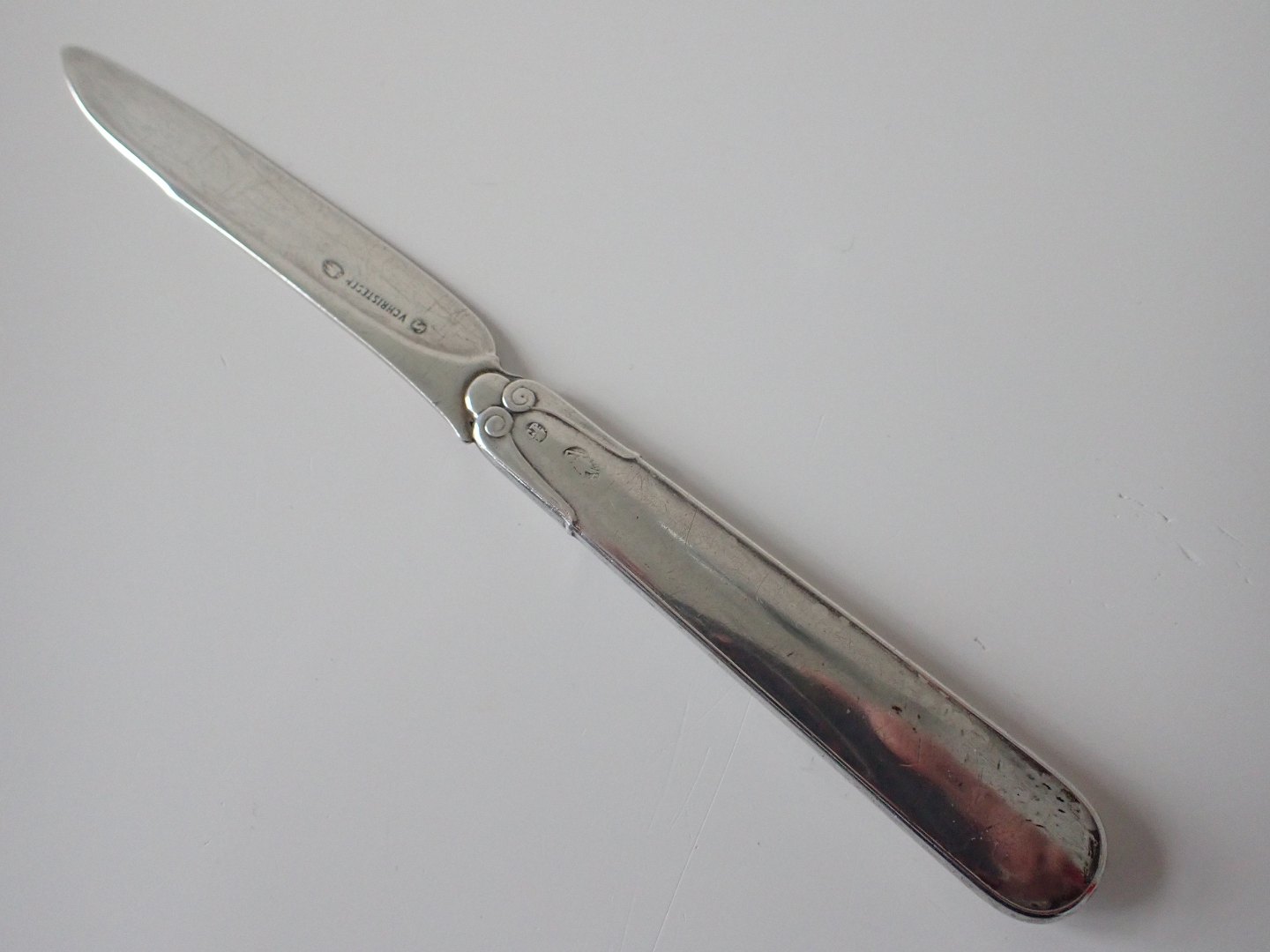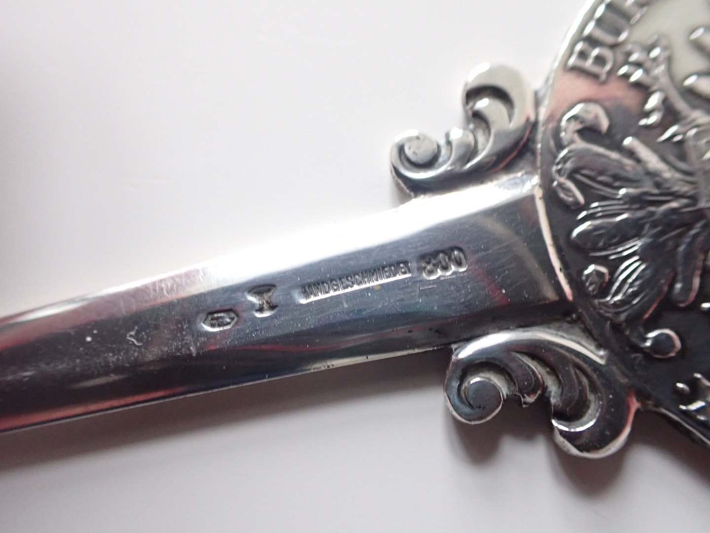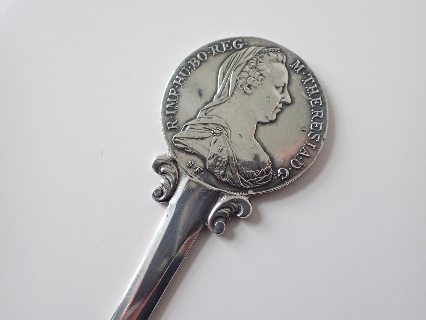 En østrigsk brevkniv med Maria Theresia (1717 - 1780) sølvdaler udført 1780, men ucirkuleret på grund af hendes død (0.9%, isoleret vægt 23,4 g.) - sammensat med en brevkniv i 800 sølv stemplet med mestermærke og "handgesmiedet". Mønt og kniv er i god stand. Samlet længde: 18,5 cm. Diameter mønt: 4 cm. Samlet vægt: 45,7 gram. Pris: 700 kr.