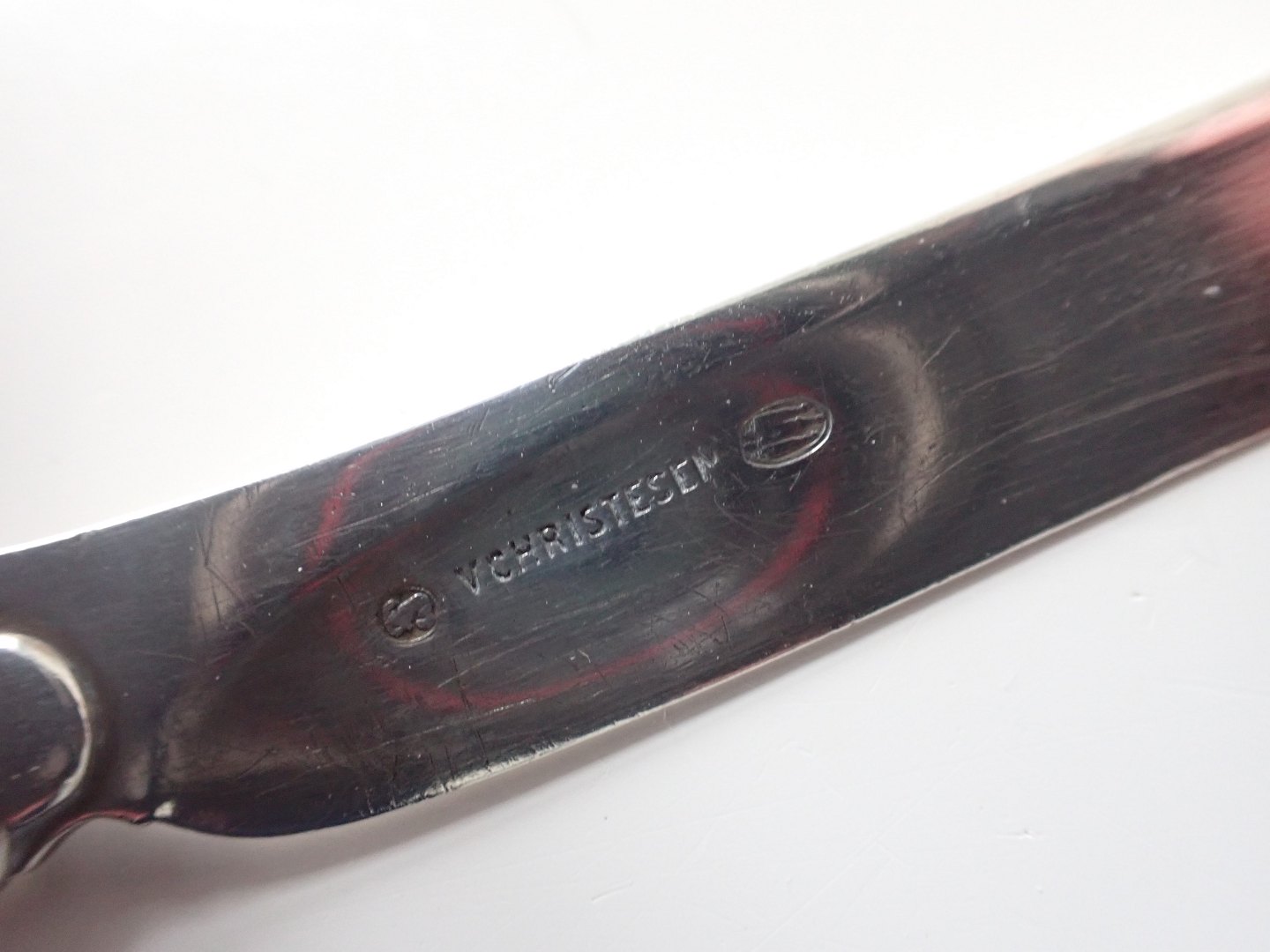 En sammensat dansk brevkniv. Senere knivblad i tretårnet sølv udført af sølvsmed V. Christensen 81893 - 1910) i 1896. Tidligere skaft30,3, gram med dekoration af græsk gud omgivet af stiliserede planter er udført af CHr. Antonius Piil, Århus (1804 - 1884). Samlet længde:17,8 cm. Vægt: 30,3 gram. Med tidstypisk slid. Pris: 350 kr.