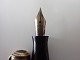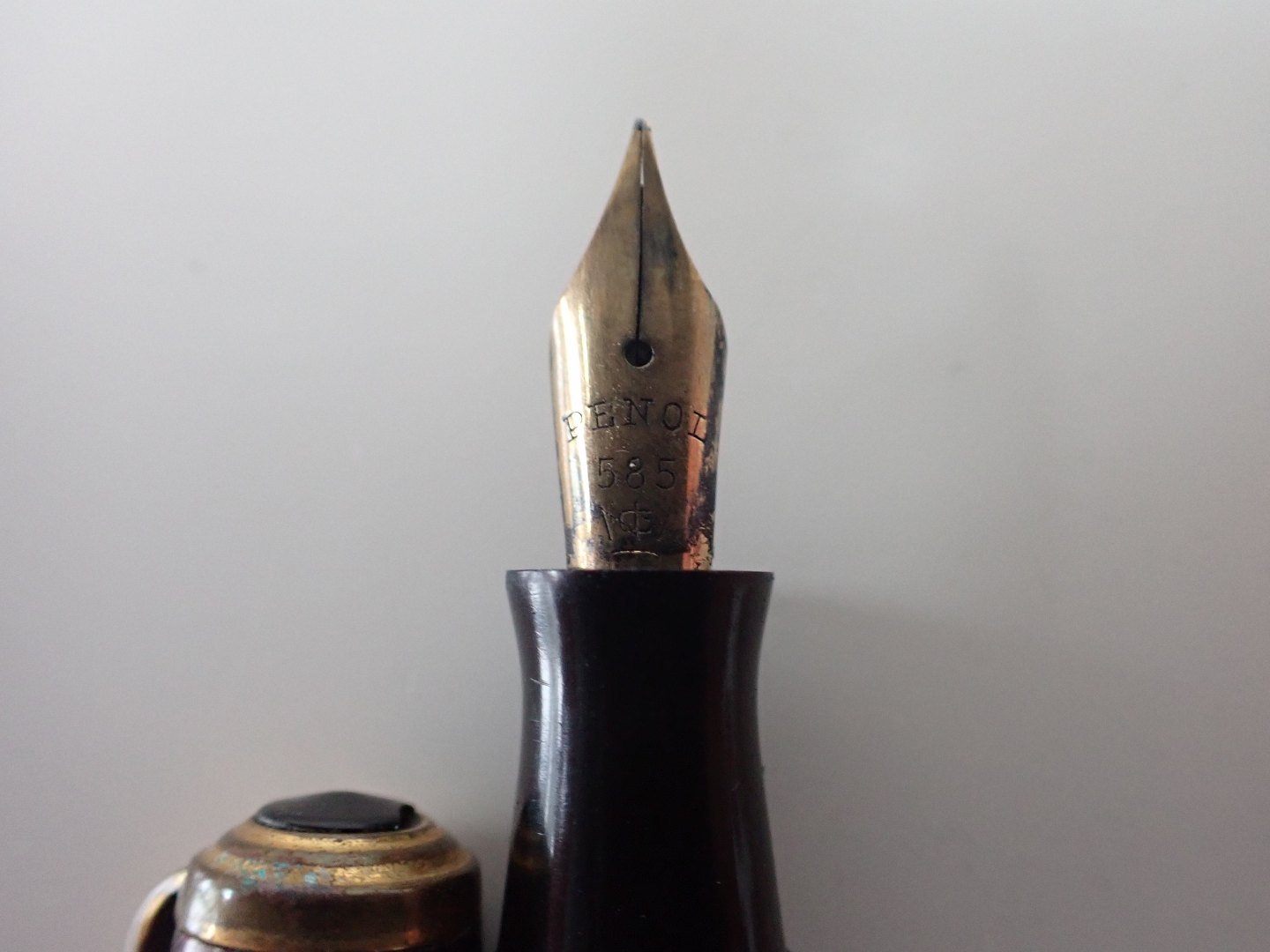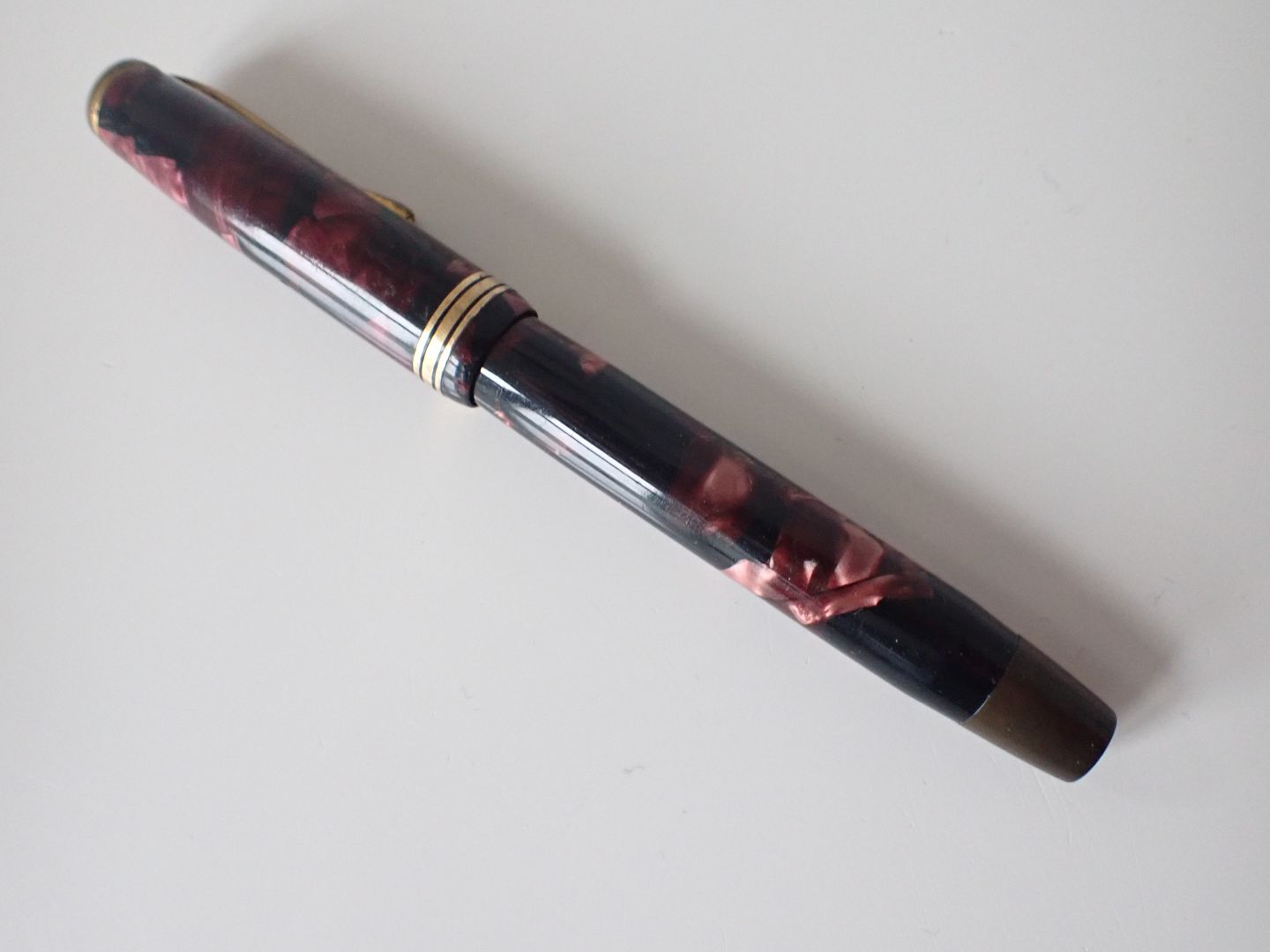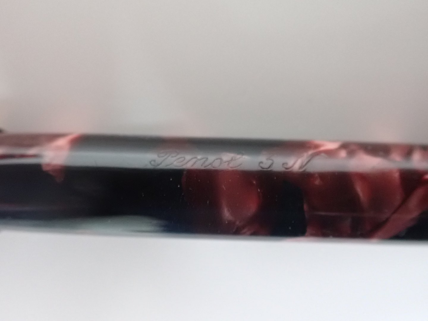 Penol (1928 - ) fyldepen 3N med 14 karat guldspids. Rød og sort marmoreret med bund bund. Længde: 12,6 cm. I pæn stand.