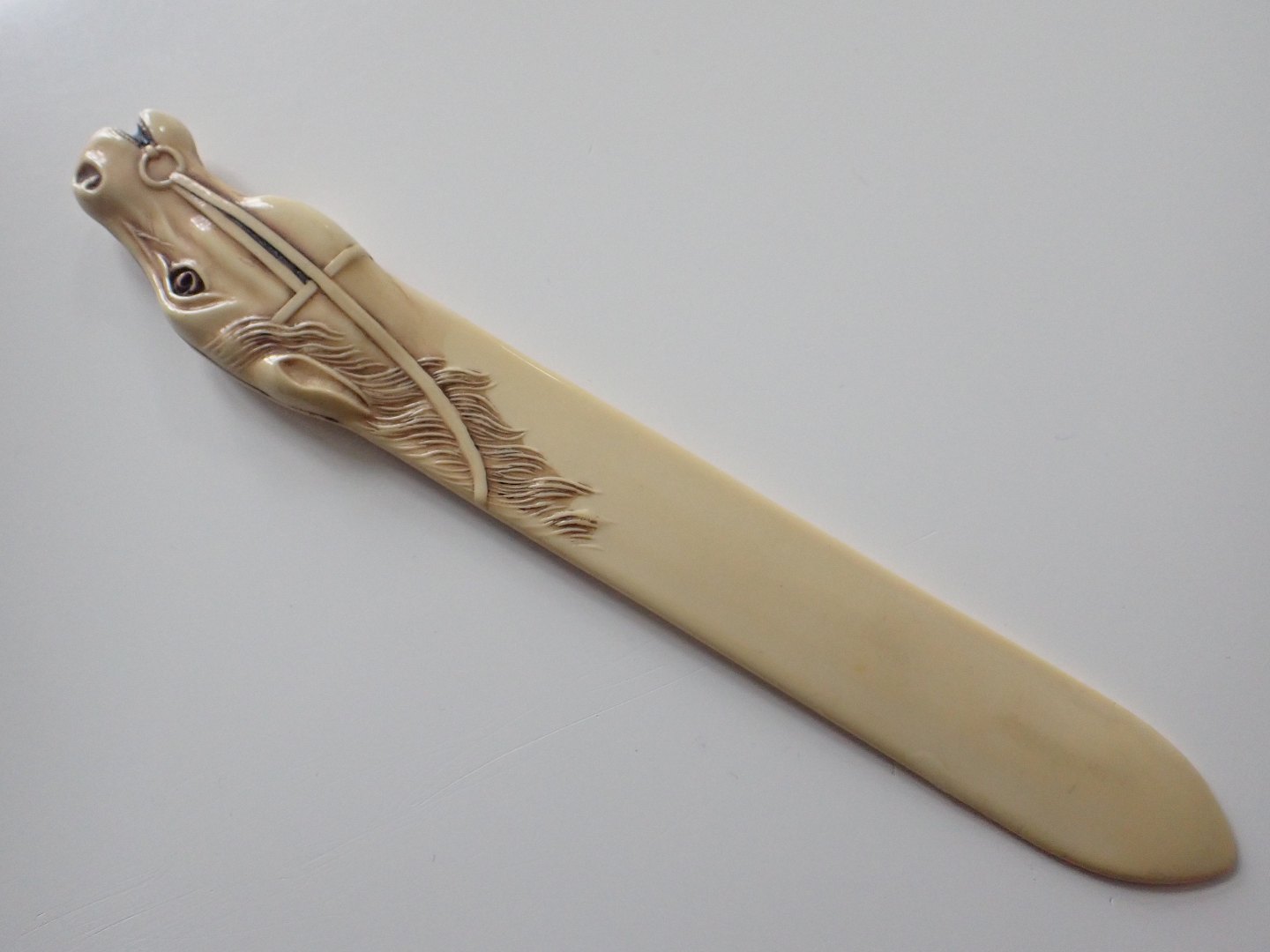 1 tysk brevkniv med fint formet hestehoved. Stemplet Germany. Længde: 19,8 cm. I fin stand. Pris: 150 kr.