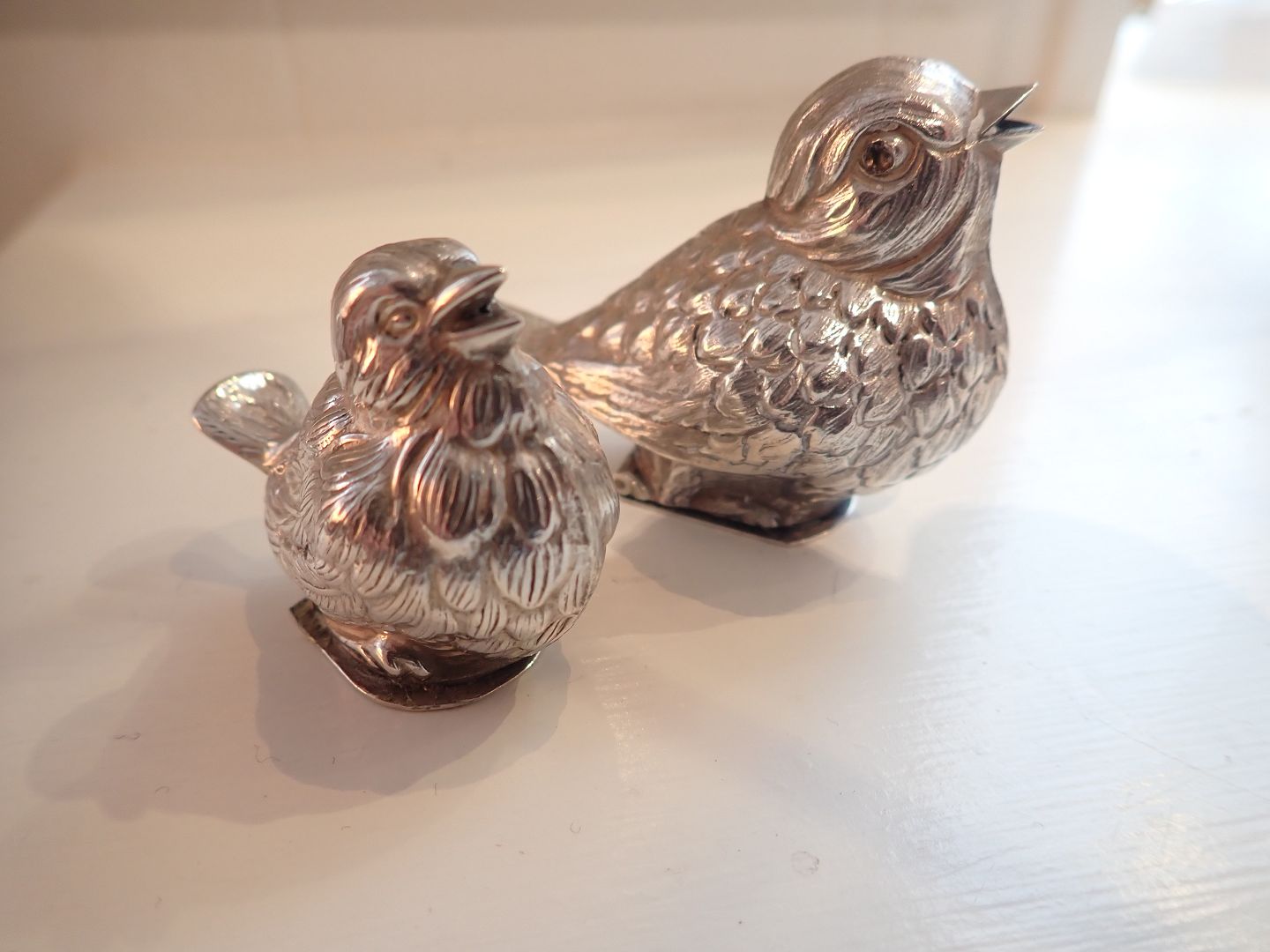 To salt-/peberbøsser i sølv i form af fugle. En større og en mindre. Begge med låge i bund og strøhul i næb. Mexicanske sølvstempler. Længde: 7 og 5 cm. Samlet vægt: 90 gram. I fin stand med mindre brugsspor. Sælges som sæt.