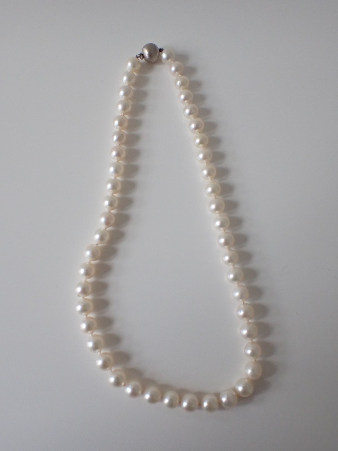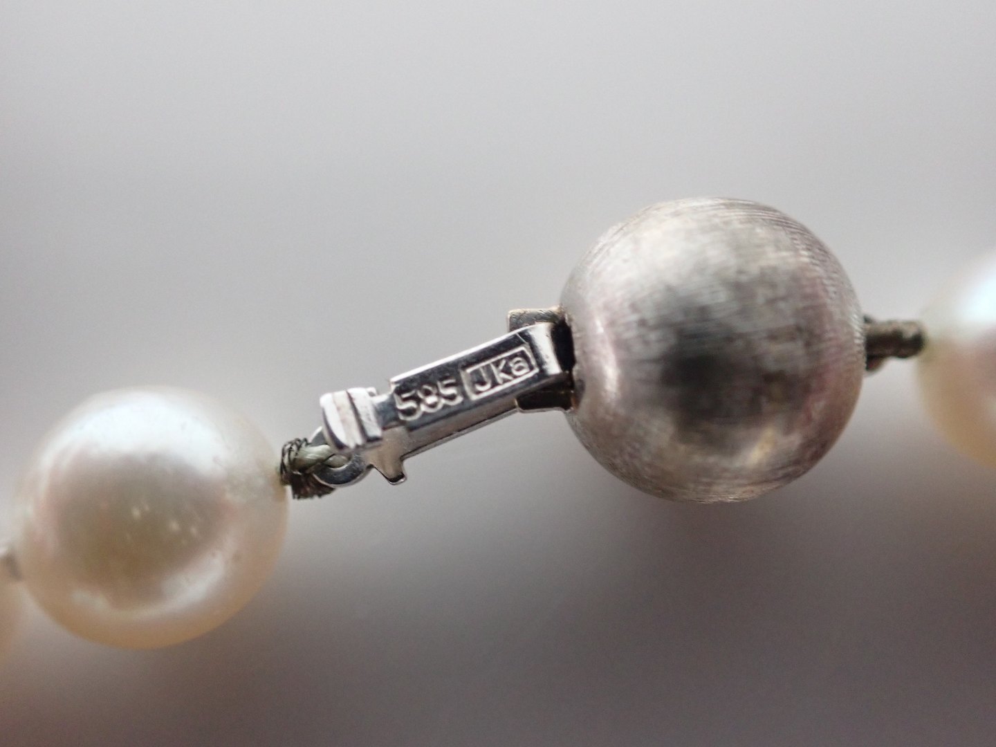 Perlekæde i saltvandskulturperler med lås af satineret hvidguld. Stemplet; 585, JKa - J. Køhle KG Pforsheim, Charlottenlund (1979 - 2004). Perlediameter: 0,8 cm. Diameter lås: 1 cm. Længde incl. lås: 43 cm. I fin stand.