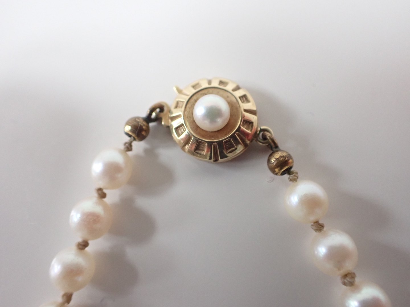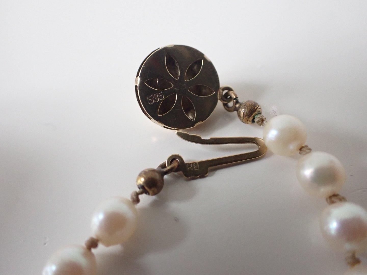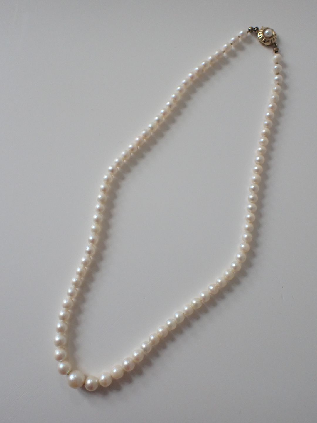 Perlekæde i forløb af saltvandskulturperler med lås af af rødguld med perle. Stemplet; 585, BH -Bernhard Hertz, KBH.. Perlediameter: 0,5 - 0,8 cm. Diameter lås: 1 cm. Længde incl. lås: 45,8 cm. I fin stand.