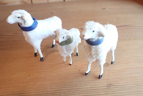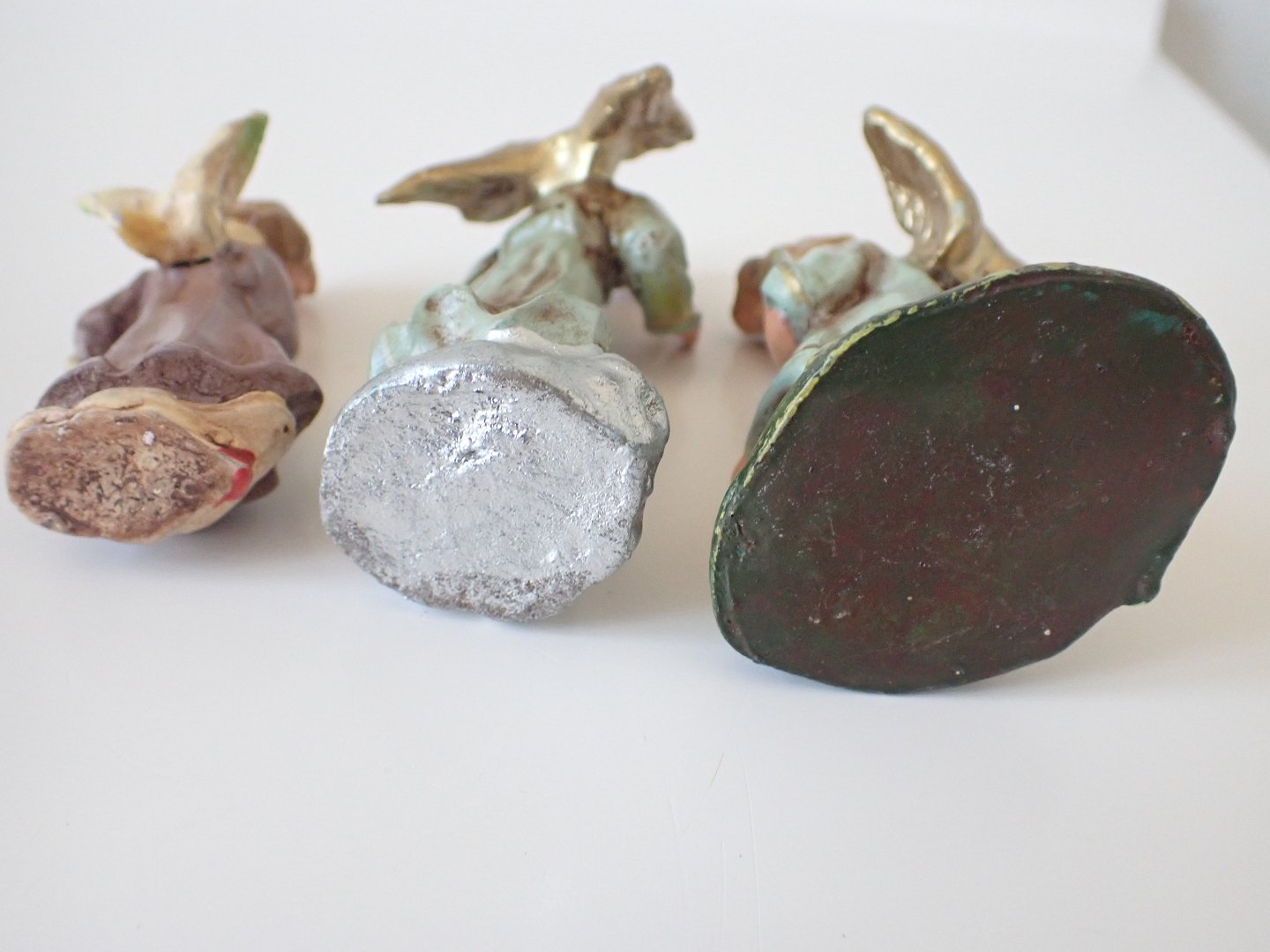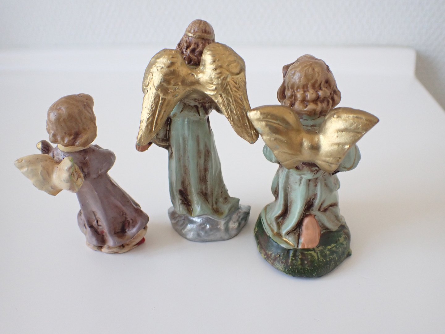 3 tyske juleengle i håndmalet gips. Højde: 8,5 - 6,7 cm. Sælges evt. enkeltvis til 325 kr. pr. stk. Samlet for alle 3: 850 kr.