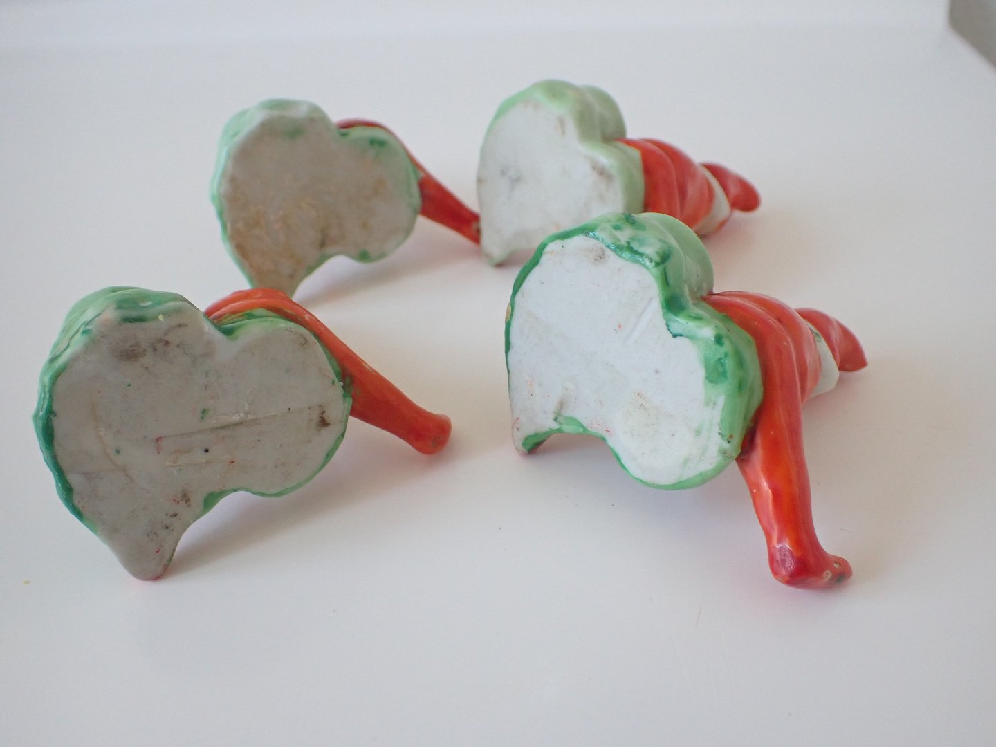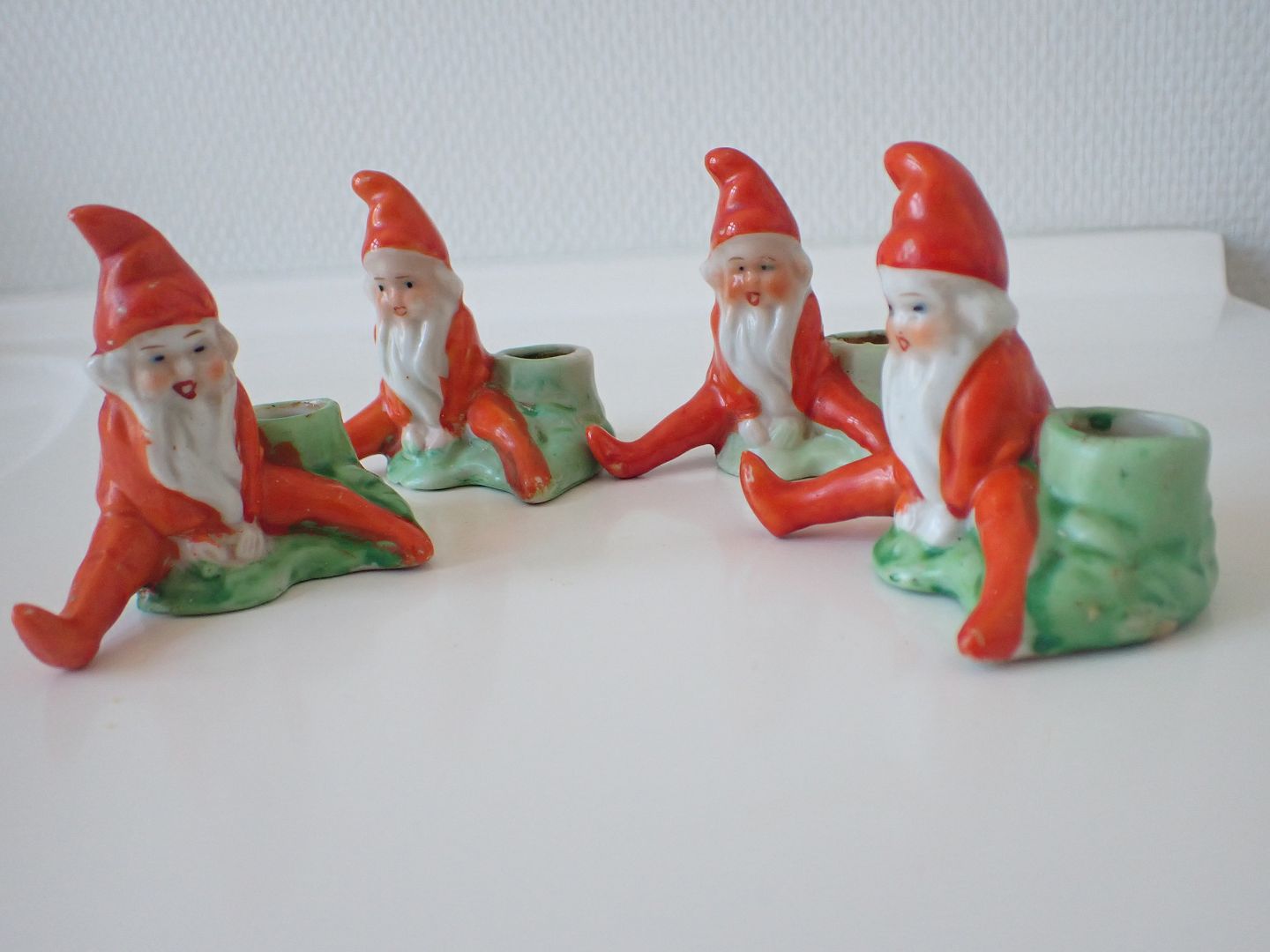4 håndmalede ensartede porcelænsnisser med lyseholdere. Tyskland. Ca. 1940. Højde: 6 cm. Bredde: 5,3 cm. I fin stand. Sælges individuelt for 300 kr.